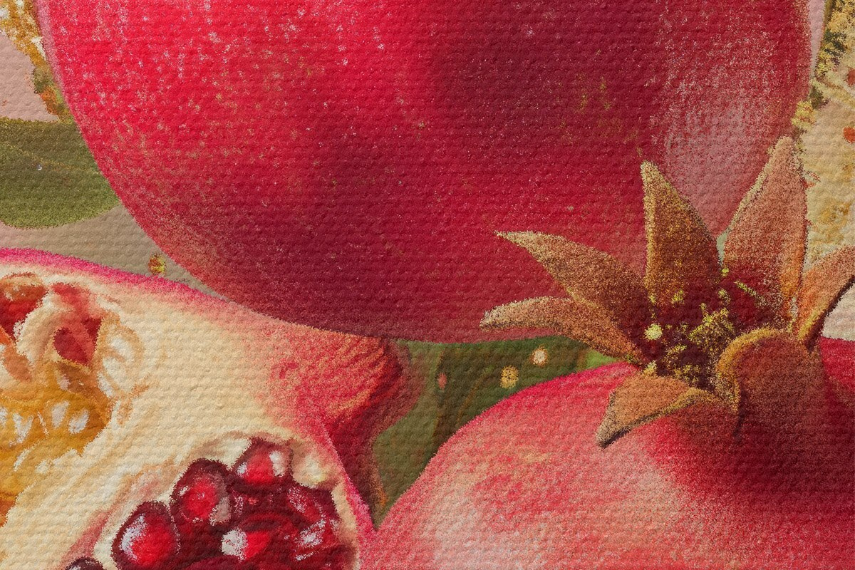 Okrągły obraz Dojrzałe granaty na różowym tle z liśćmi i złotymi plamkami Nr r45868