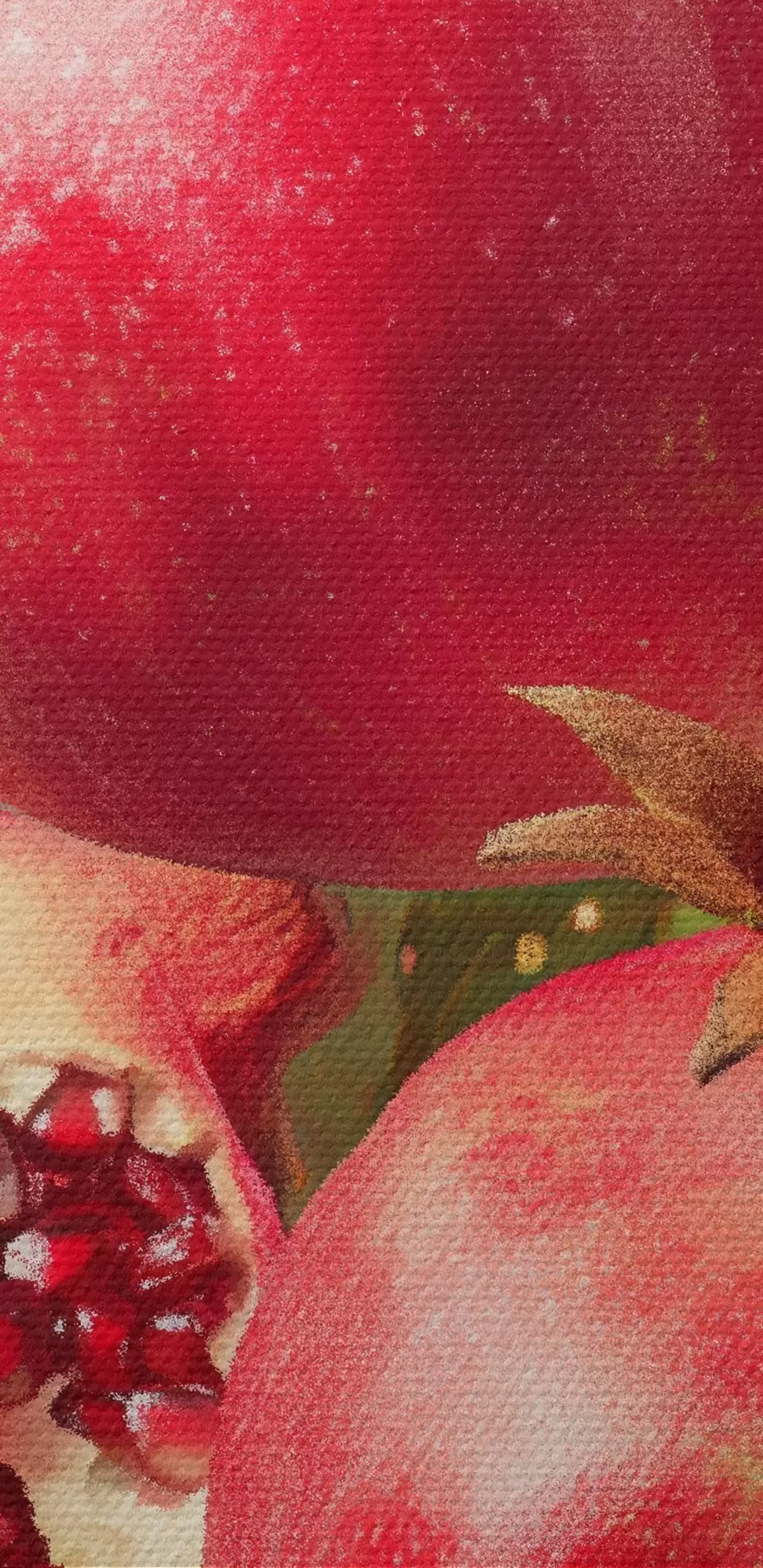 Okrągły obraz Dojrzałe granaty на różowym tle z liśćми і plamkami Nr r45868