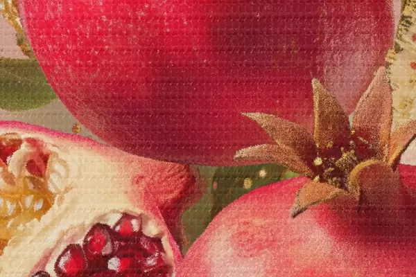 Okrągły obraz Dojrzałe granaty na różowym tle z liśćmi i złotymi plamkami Nr r45868
