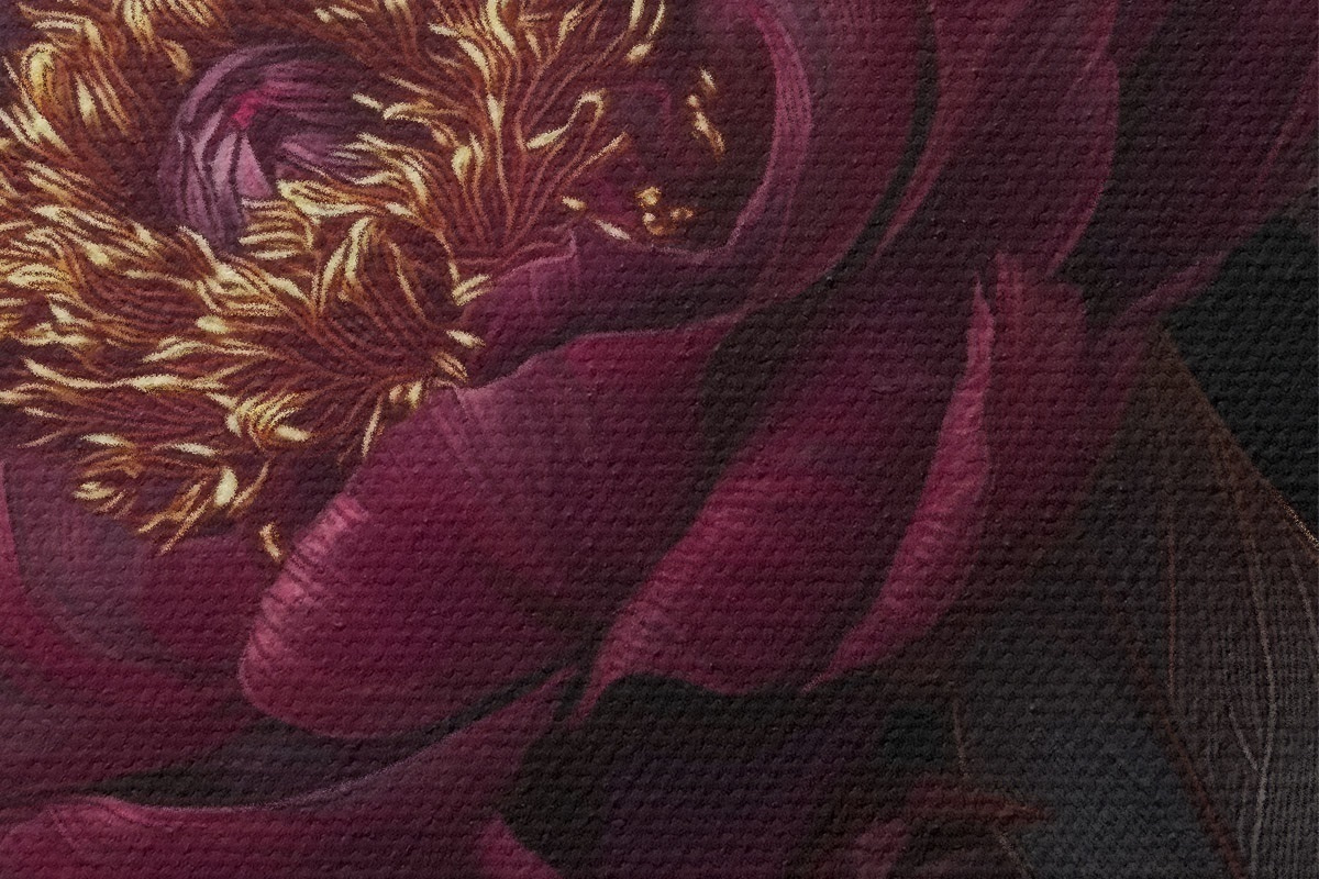 Okrągły obraz Burgundowe piwonie na czarnym tle z żółtymi akcentami Nr r45877