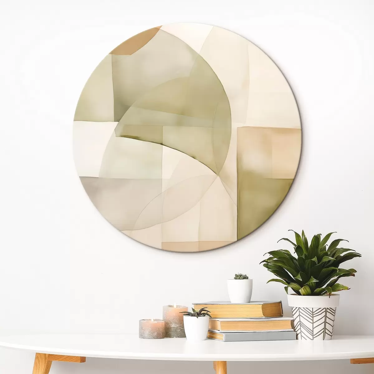 Okrągły obraz Abstrakcyjne geometryczne kształty o fakturze akwareli w odcieniach zieleni, brązu i beżu Nr r45929