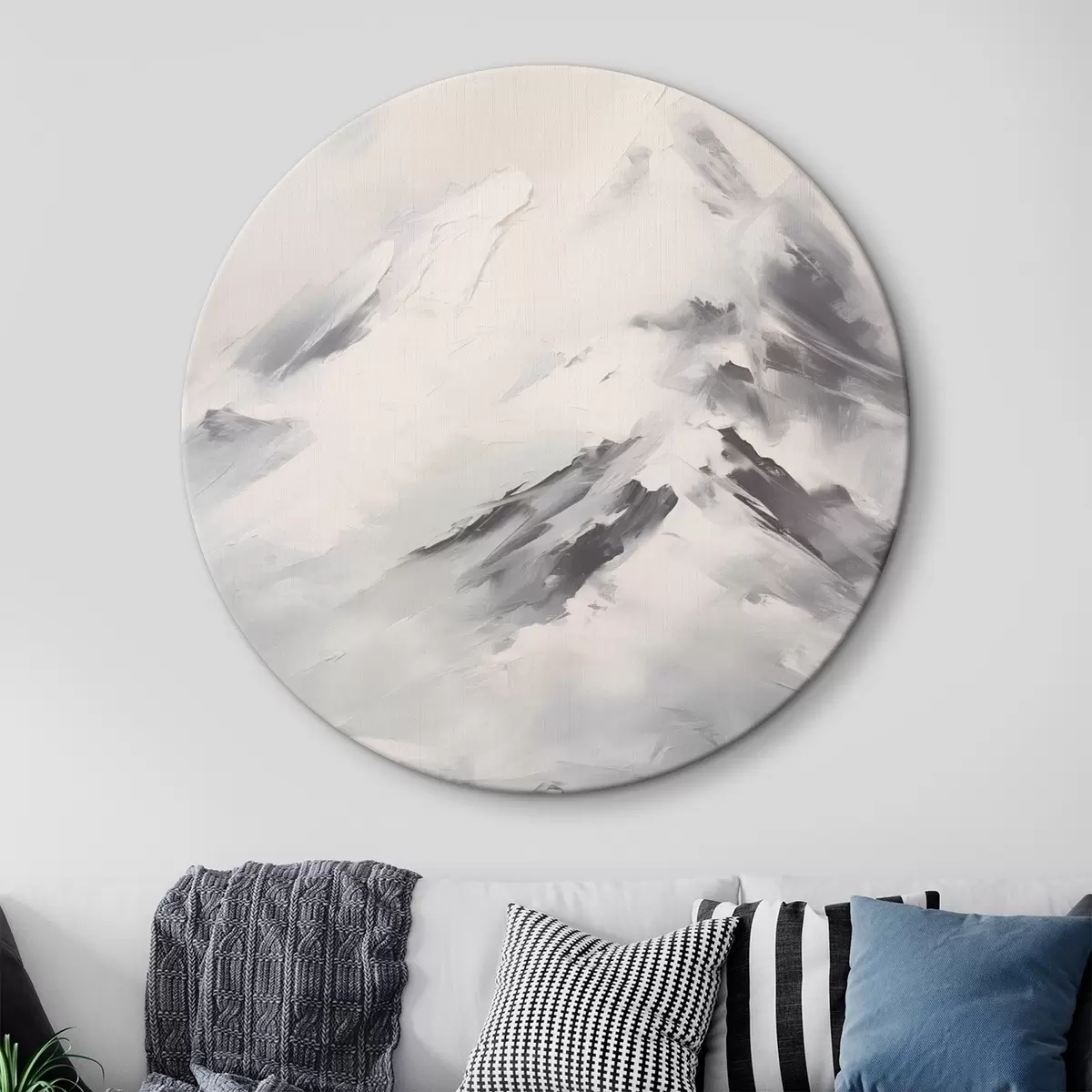 Okrągły obraz Ośnieżone szczyty górskie z szarymi cieniami, szare niebo, pociągnięcia pędzla, teksturowane, minimalistyczne Nr r45932