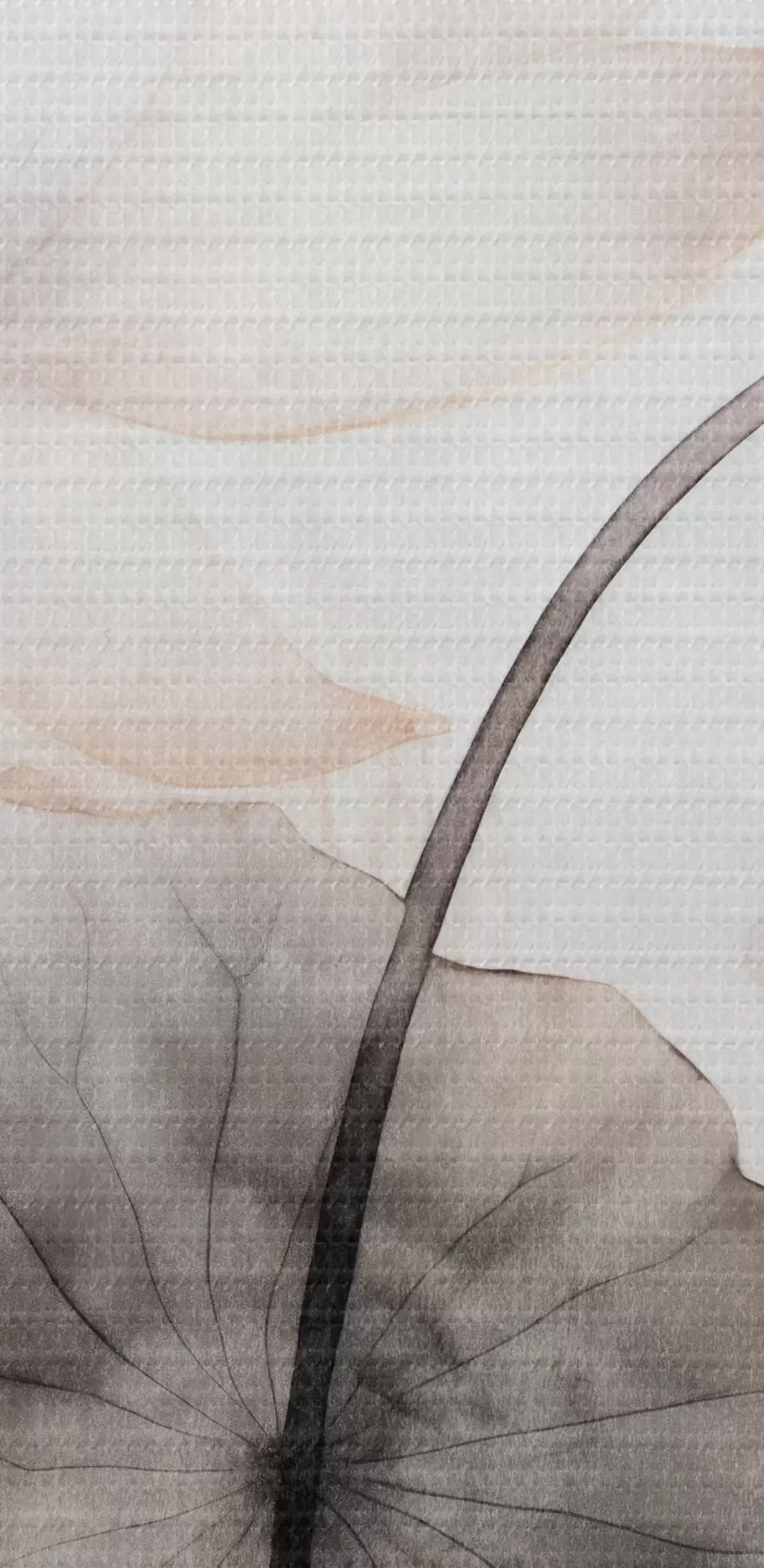 Okrągły obraz Białe teksturowane kwiaty lotosu z ciemnymi liśćmi, jasnym tłem i minimalistycznym wzorem Nr r45937