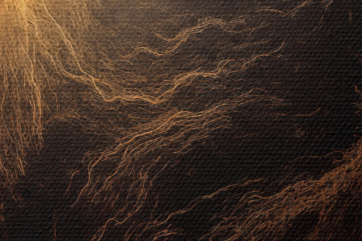 Okrągły obraz Abstrakcyjna planeta z pomarańczowymi żyłkami na czarnym tle kosmosu, nowoczesna sztuka minimalistyczna Nr r45943