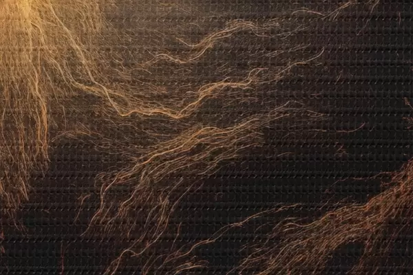 Okrągły obraz Abstrakcyjna planeta z pomarańczowymi żyłkami na czarnym tle kosmosu, nowoczesna sztuka minimalistyczna Nr r45943