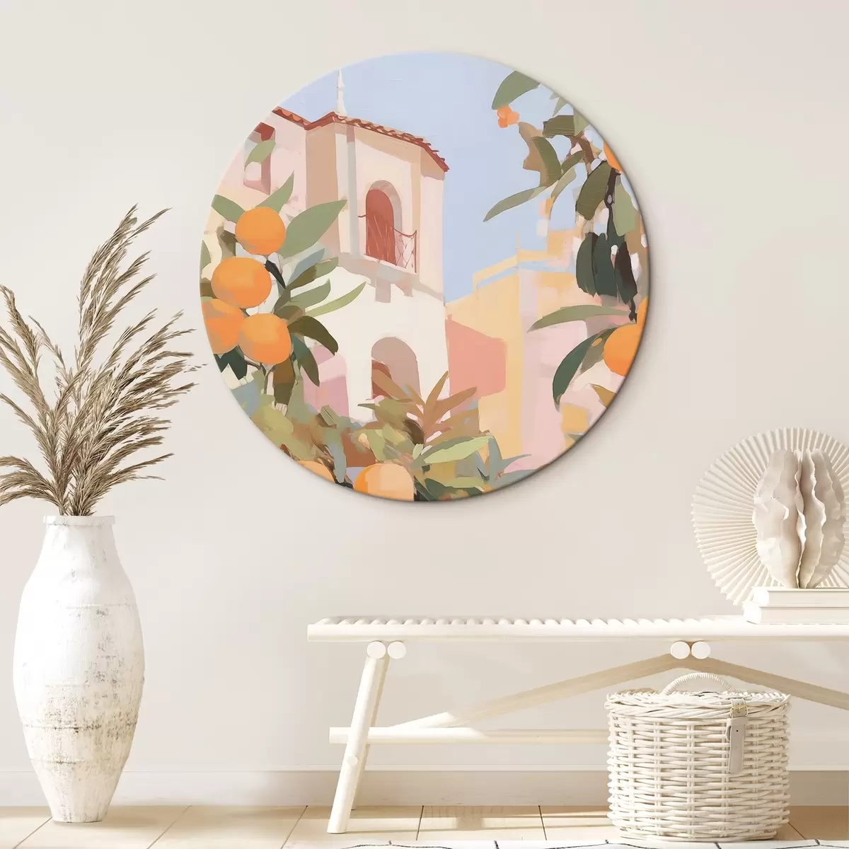 Okrągły obraz Pomarańcze na gałęzi przed domem Nr r46060