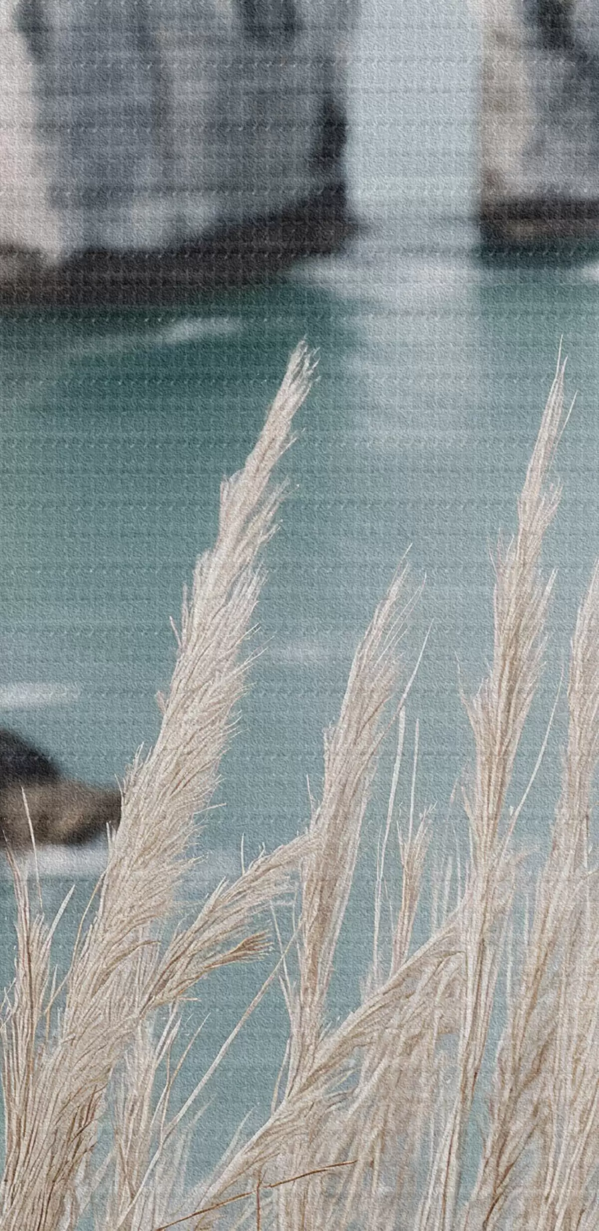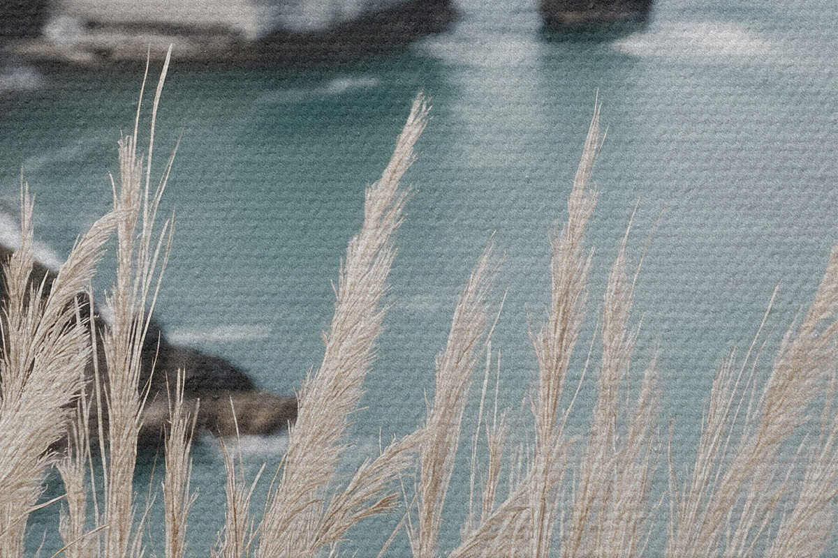 Okrągły obraz Morze i skalny łuk, widok przez wyschnięte trawy Nr r46142