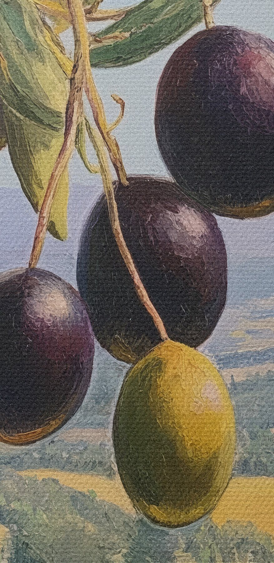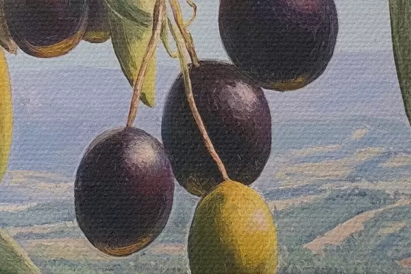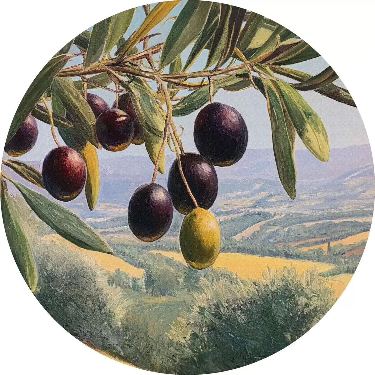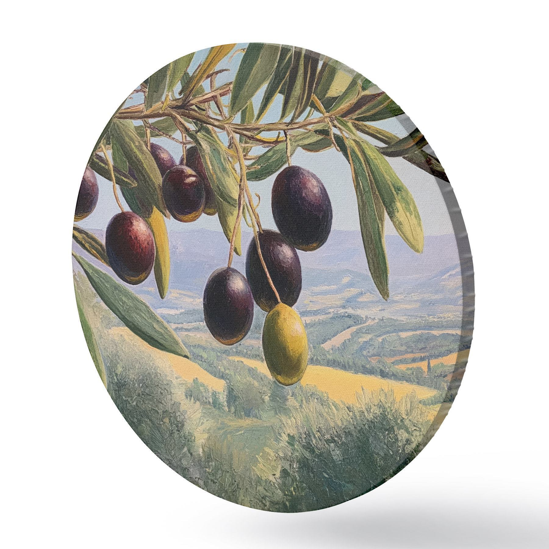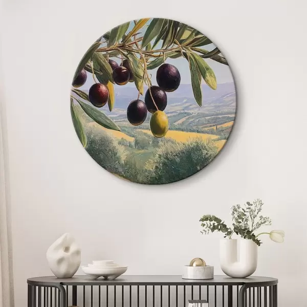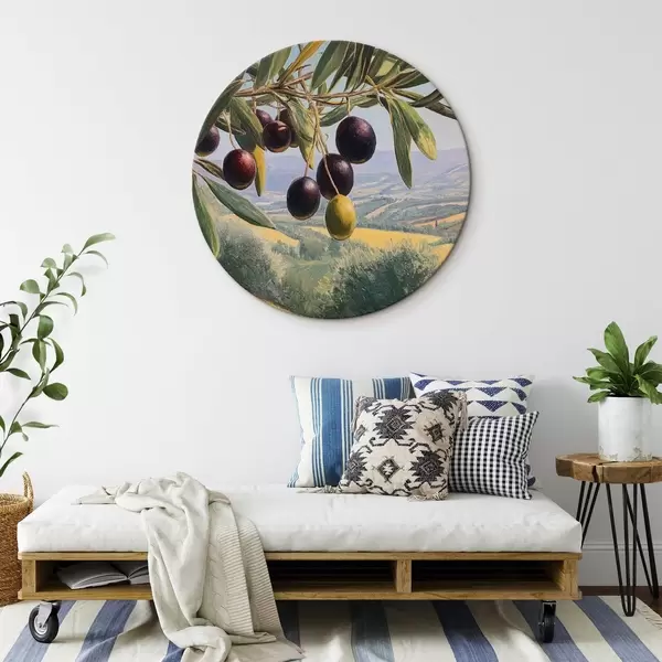 Okrągły obraz Gałązka oliwna z ciemnymi owocami na tle letniego krajobrazu Nr r46150