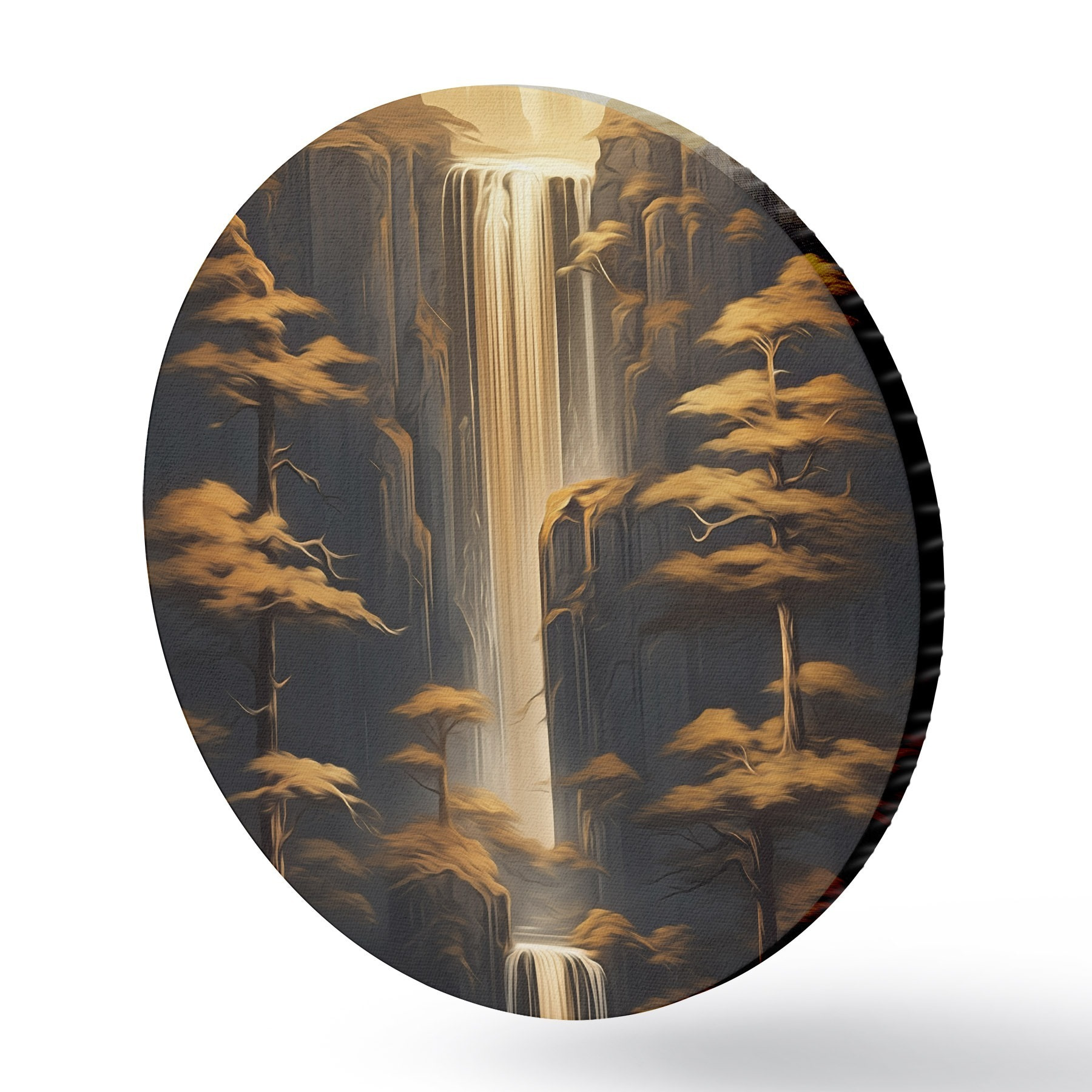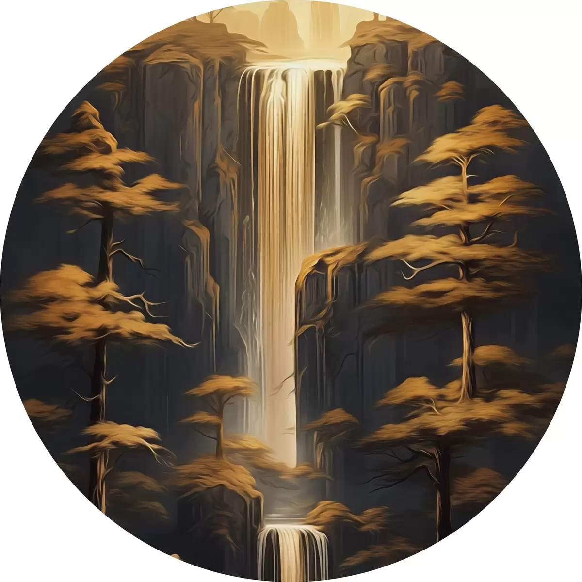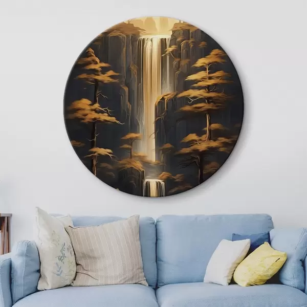 Okrągły obraz Wysokie klify z wodospadem i sosnami w wieczornym świetle Nr r46151