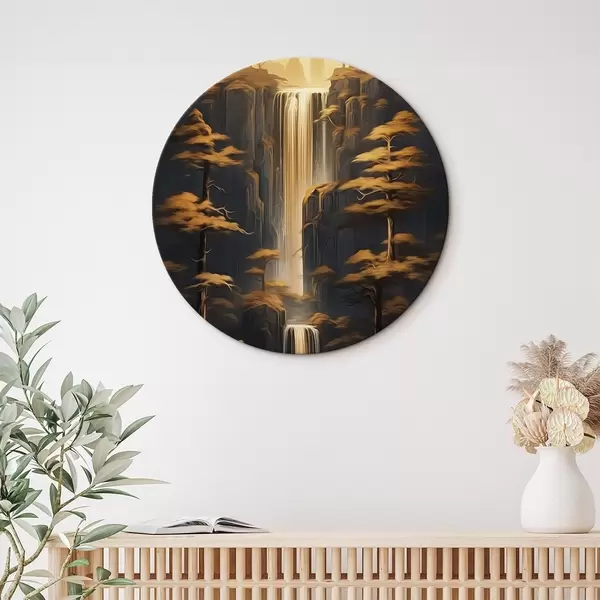Okrągłe obrazy Wysokie klify z wodospadem i sosnami w wieczornym świetle r46151