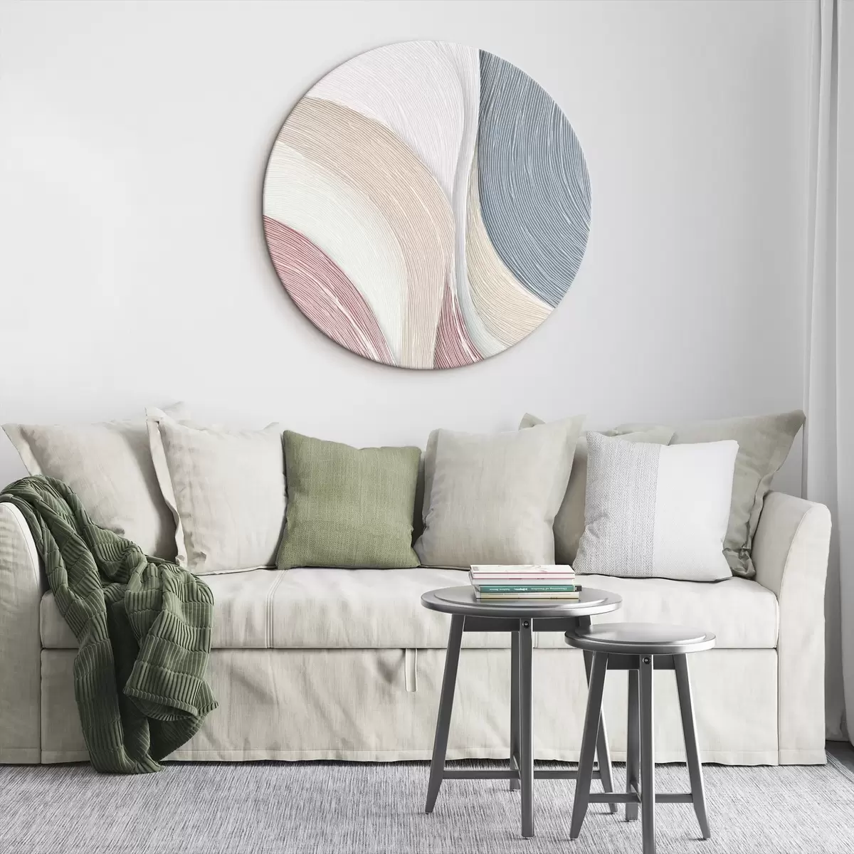 Okrągły obraz Jasne abstrakcyjne fale w odcieniach jasnoróżowego i szaro-białego Nr r46153