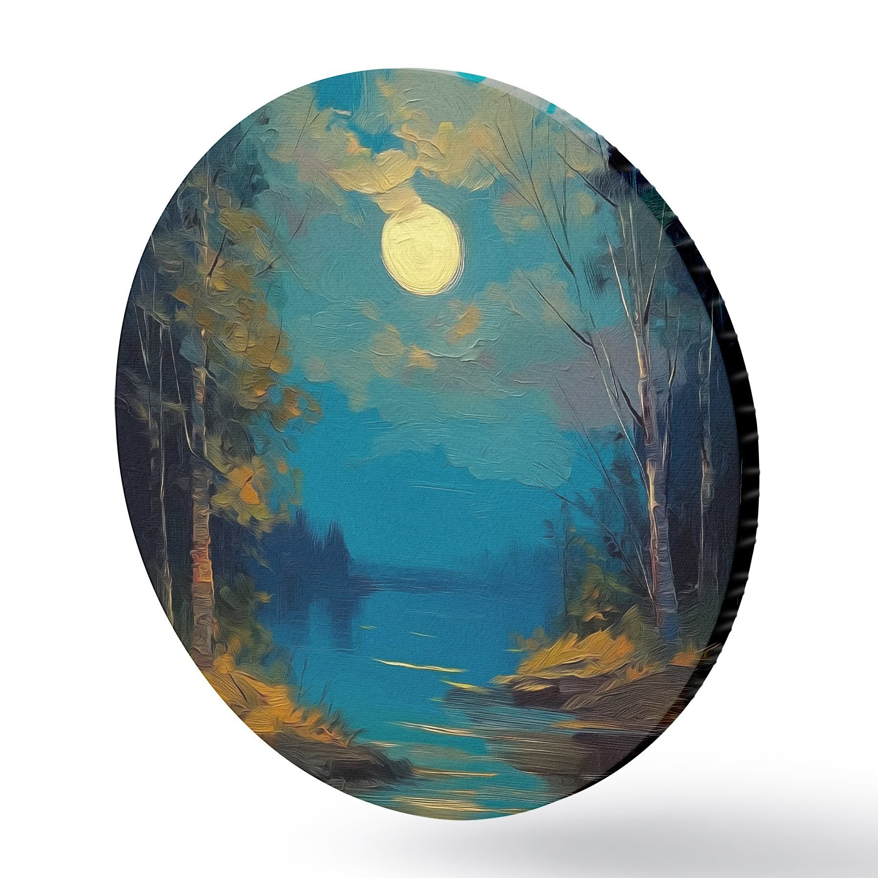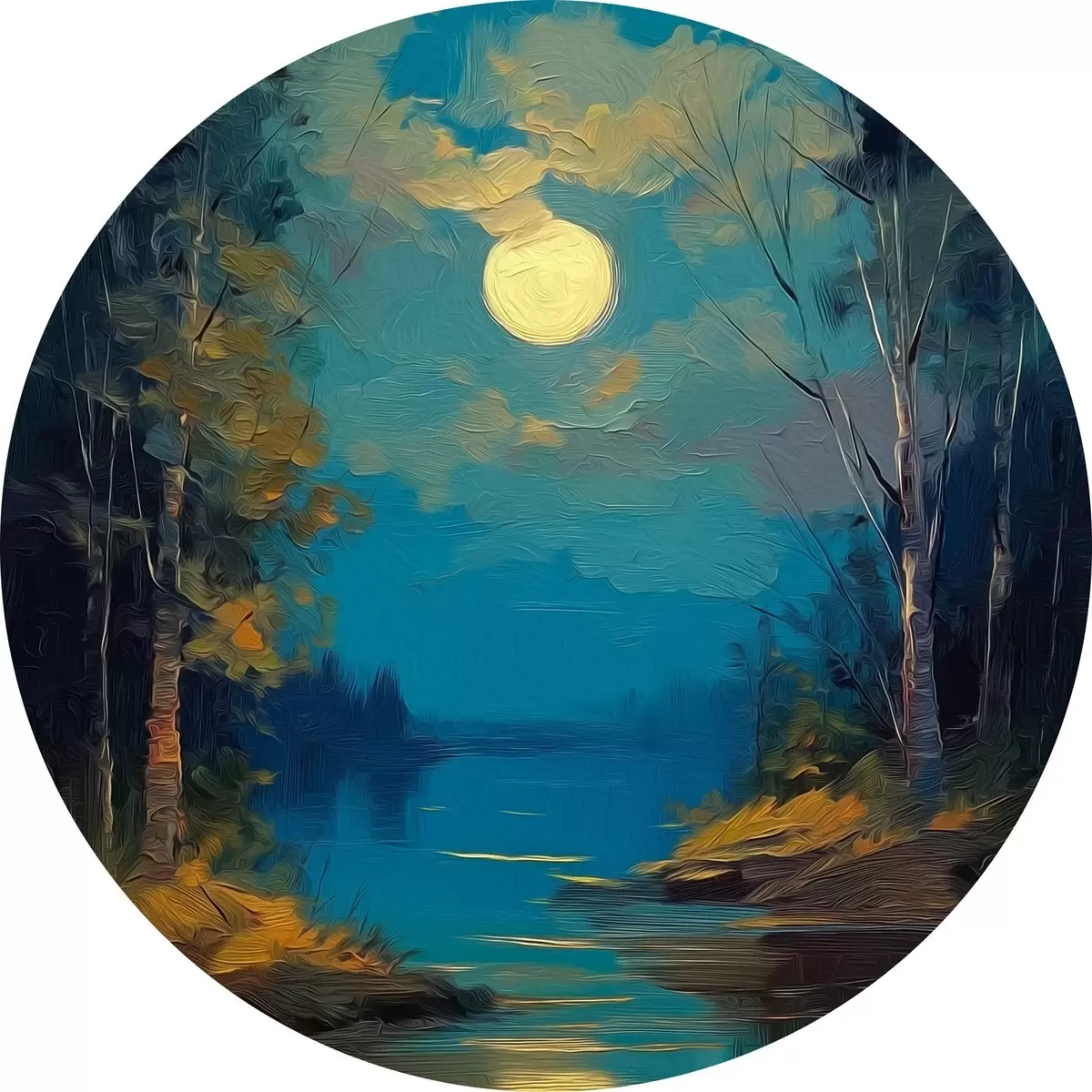 Okrągły obraz Światło księżyca nad spokojną rzeką wśród sosen Nr r46164