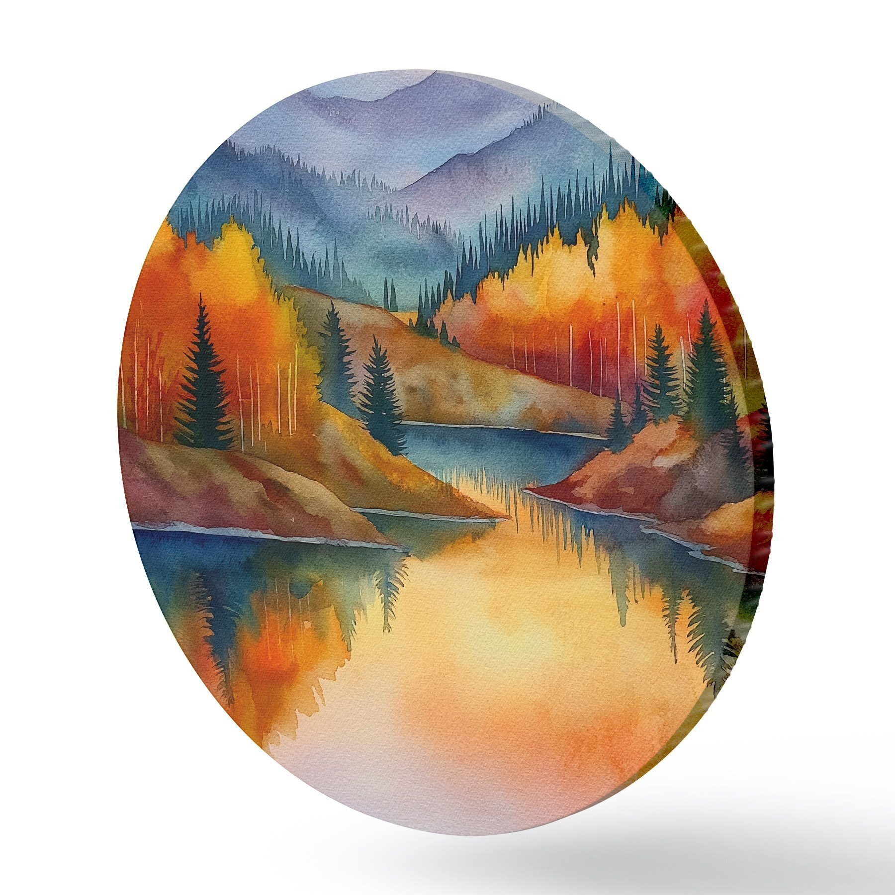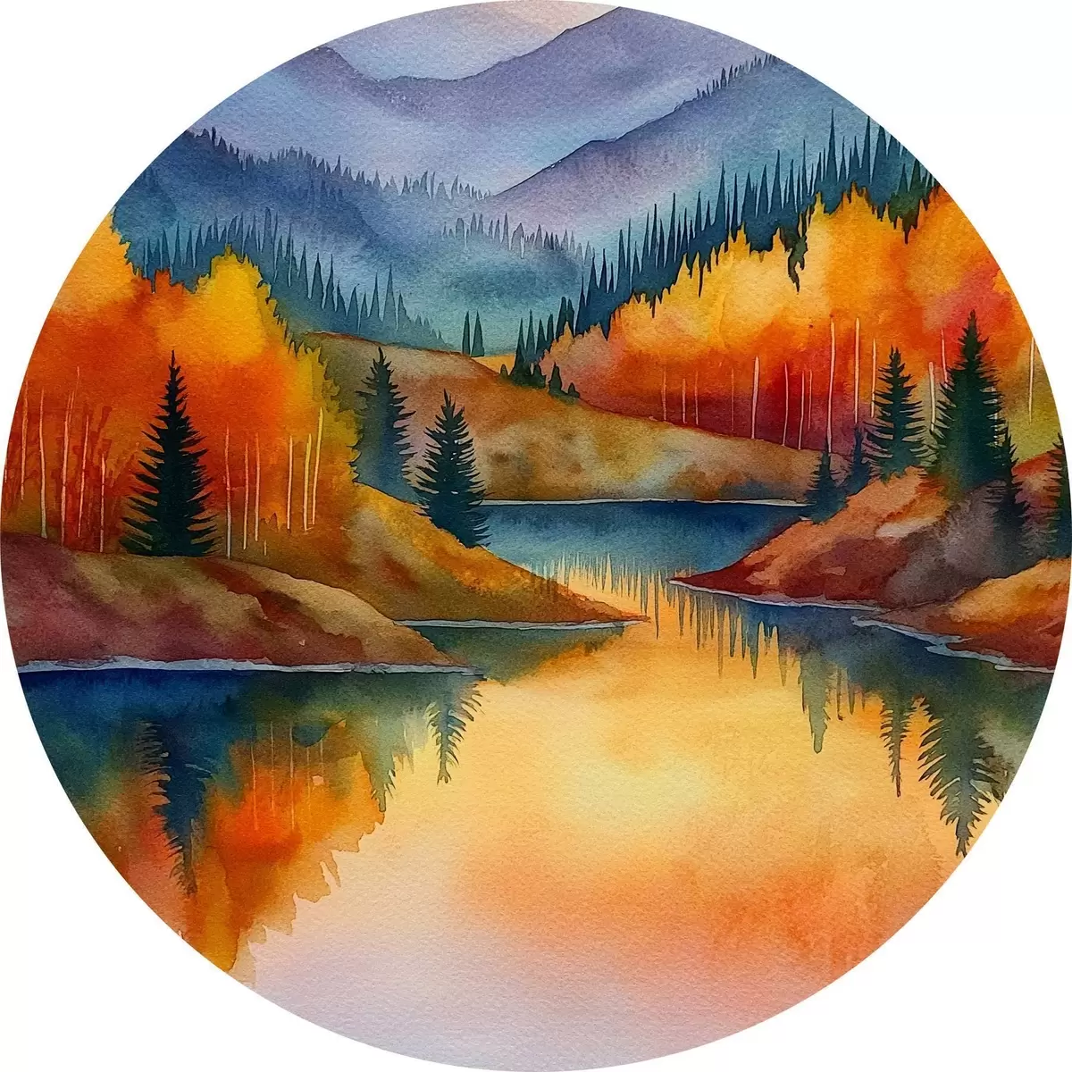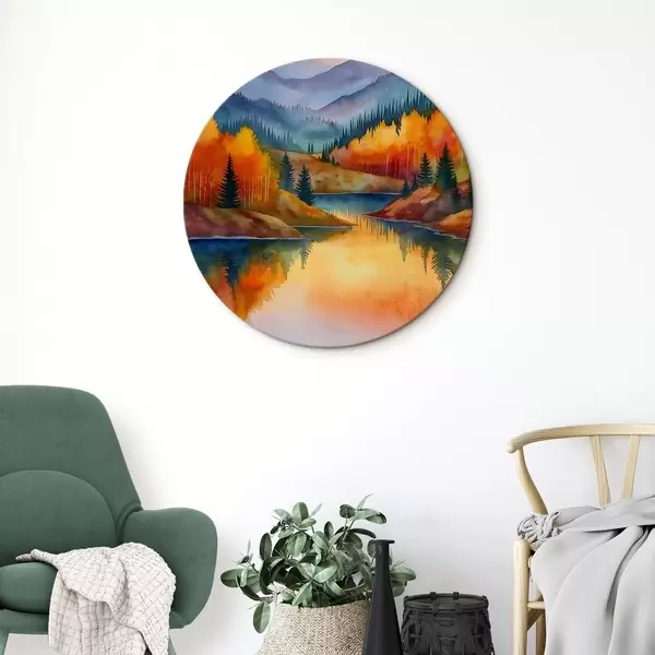 Okrągłe obrazy Jesienny krajobraz z górami odbijającymi się w spokojnym jeziorze r46174