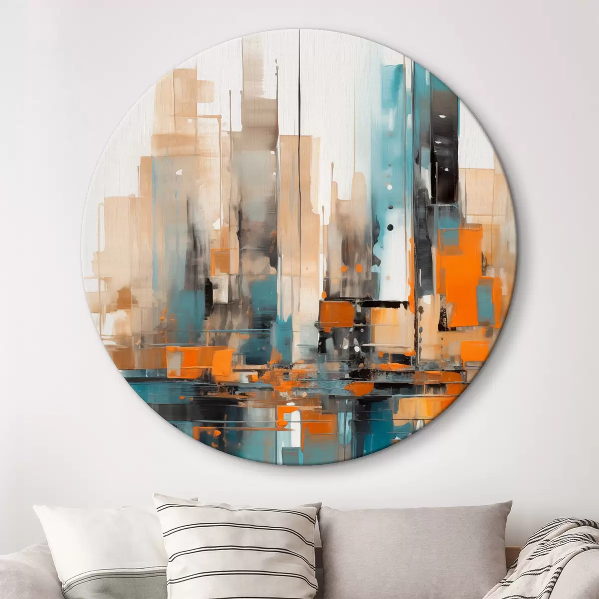 Okrągłe obrazy Abstrakcyjny pejzaż miejski z pomarańczowymi, turkusowymi i brązowymi pionowymi pociągnięciami pędzla i geometrycznymi kształtami r46266