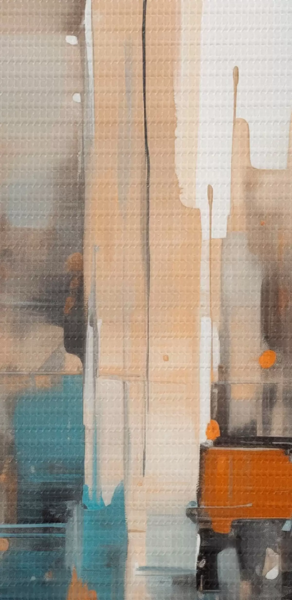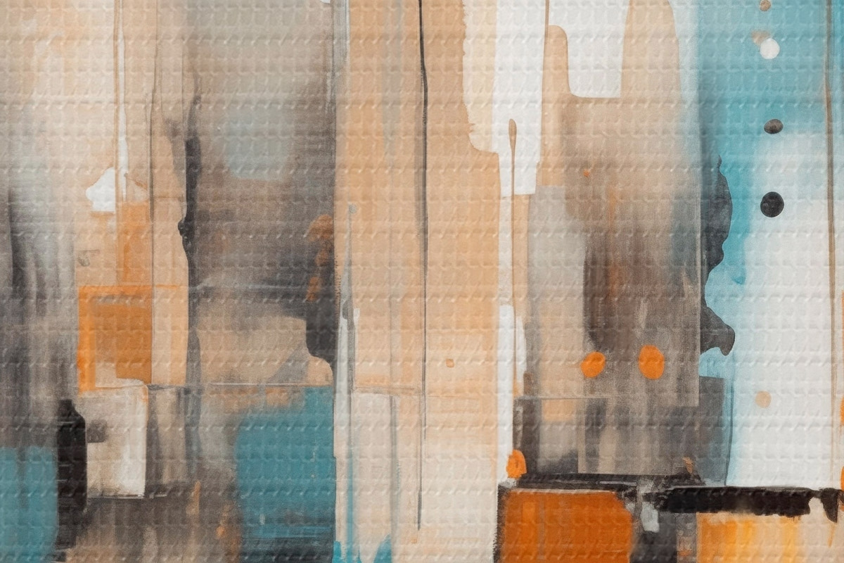 Okrągły obraz Abstrakcyjny pejzaż miejski z pomarańczowymi, turkusowymi i brązowymi pionowymi pociągnięciami pędzla i geometrycznymi kształtami Nr r46266
