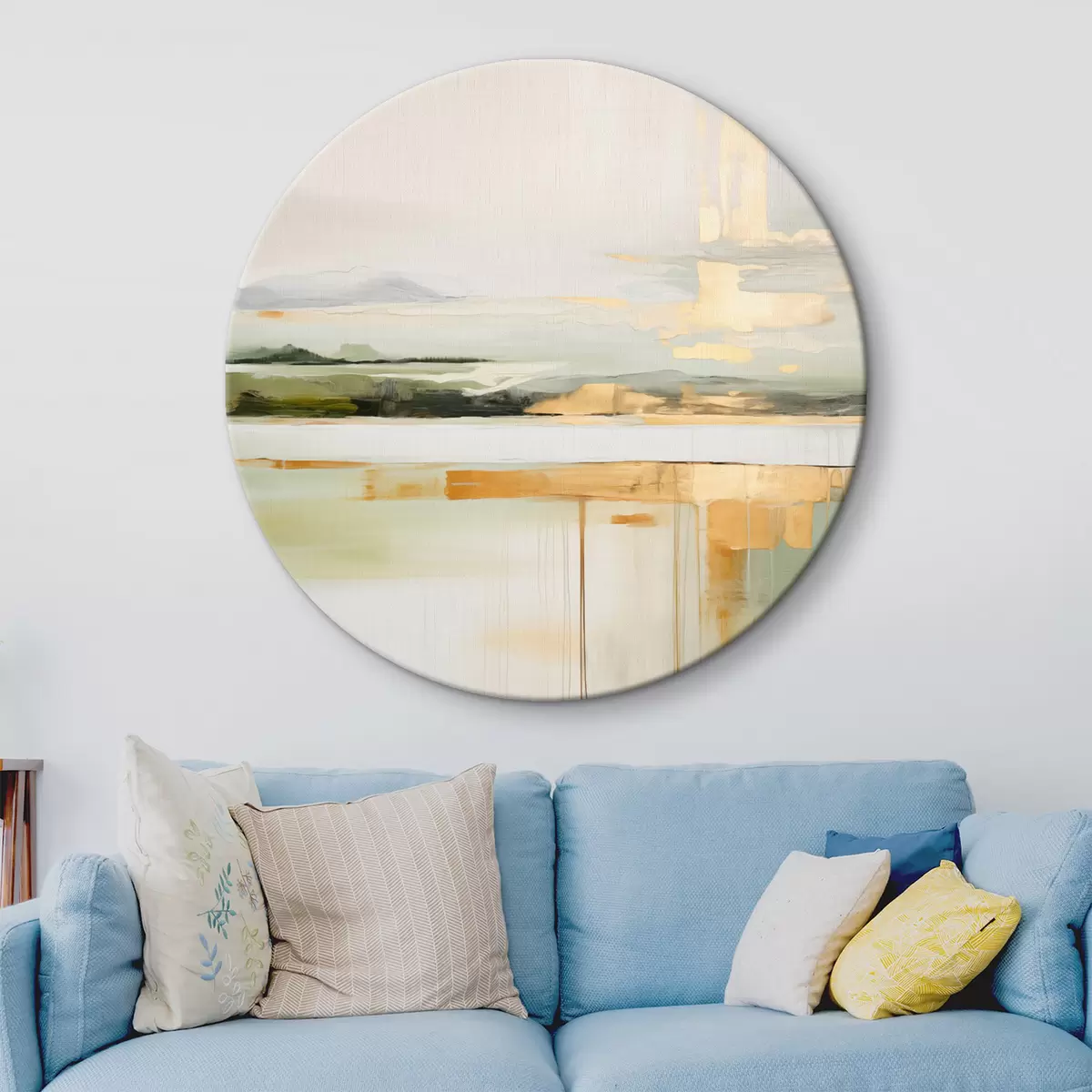 Okrągły obraz Abstrakcyjny pejzaż z żółtymi akcentami, minimalistyczna kompozycja ziemi, wody i nieba, w stonowanej kolorystyce Nr r46268