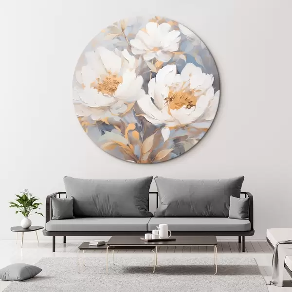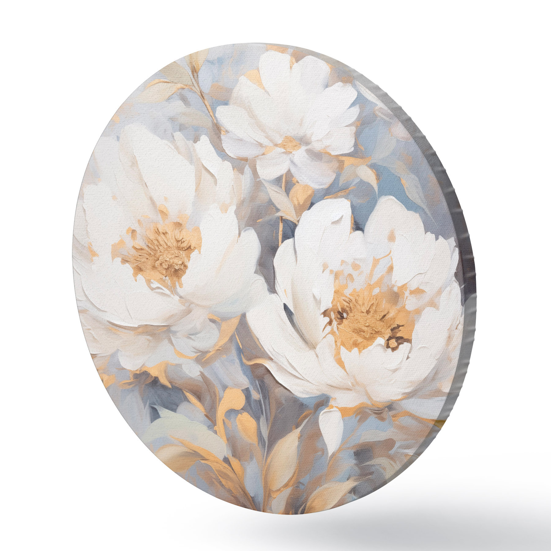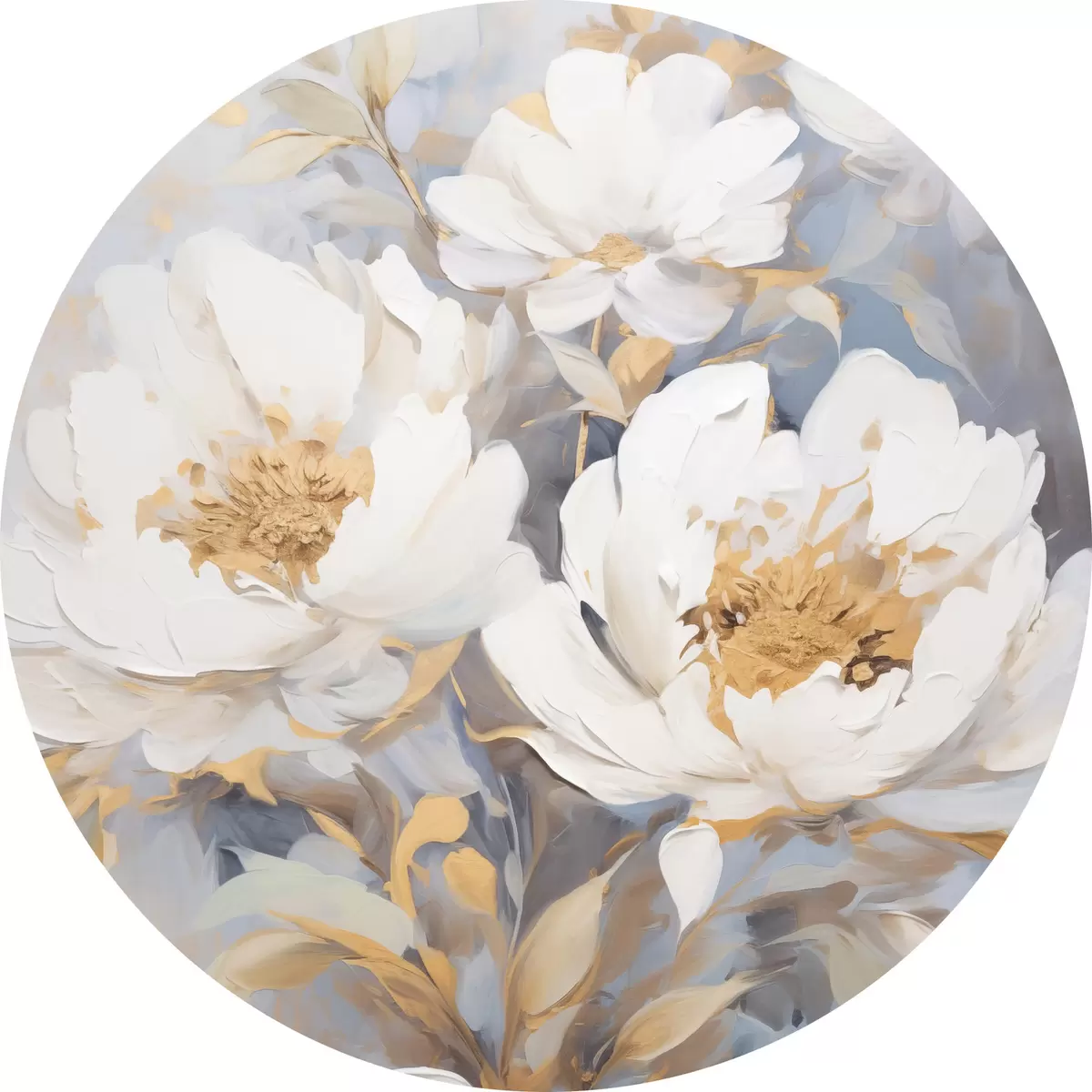 Okrągły obraz Białe piwonie z niebieskimi środkami i liśćmi, delikatne pociągnięcia pędzla, jasnoniebieskie tło, kompozycja kwiatowa Nr r46270