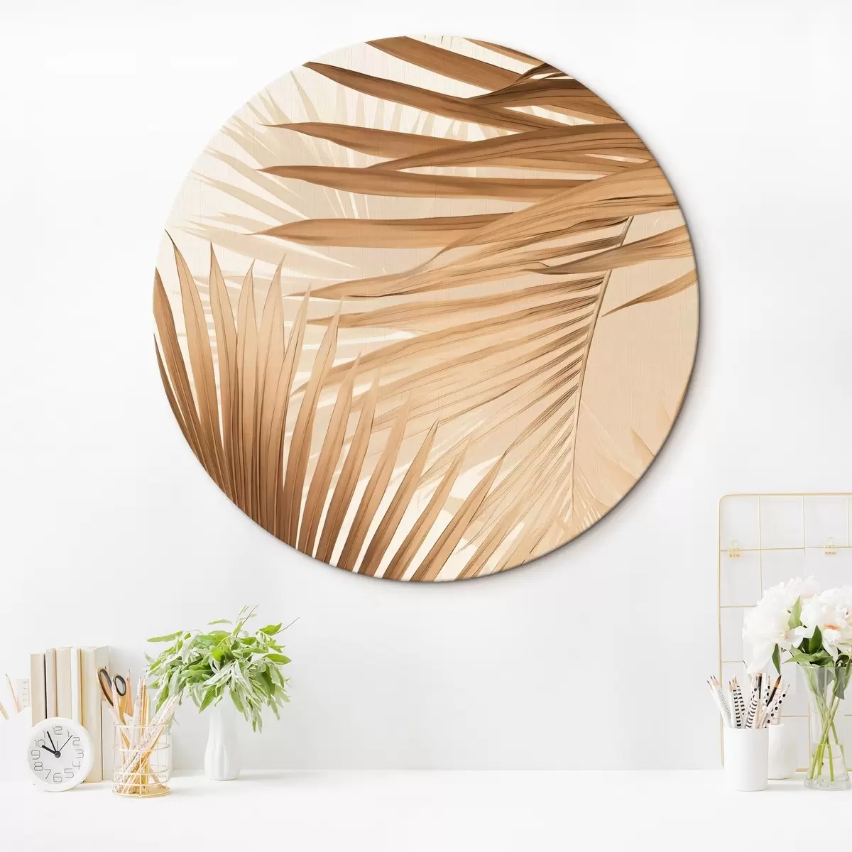 Okrągłe obrazy Abstrakcyjne liście palmowe w brązowych odcieniach, tropikalne, botaniczne, naturalne, minimalistyczne, eleganckie, nowoczesne wzornictwo r46275