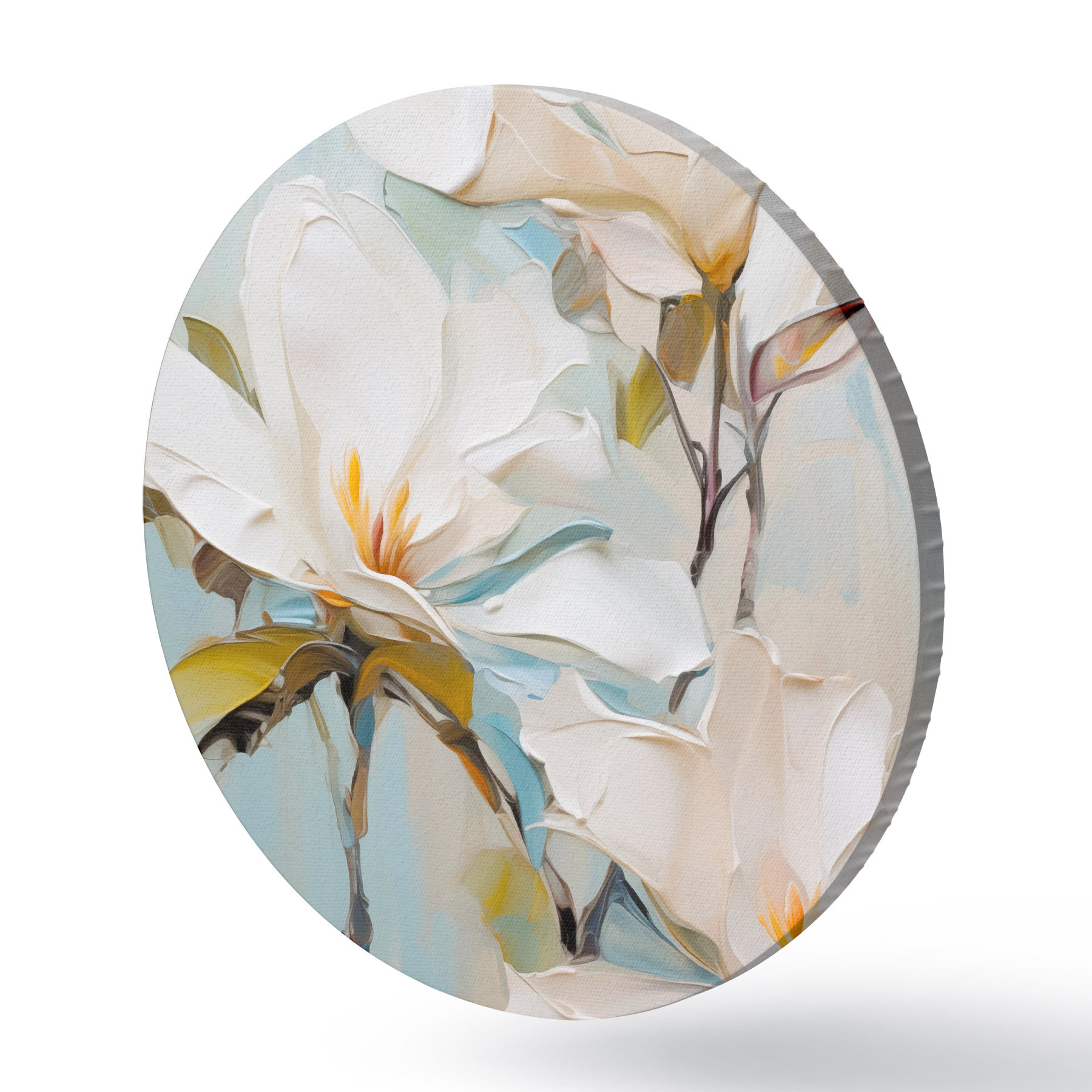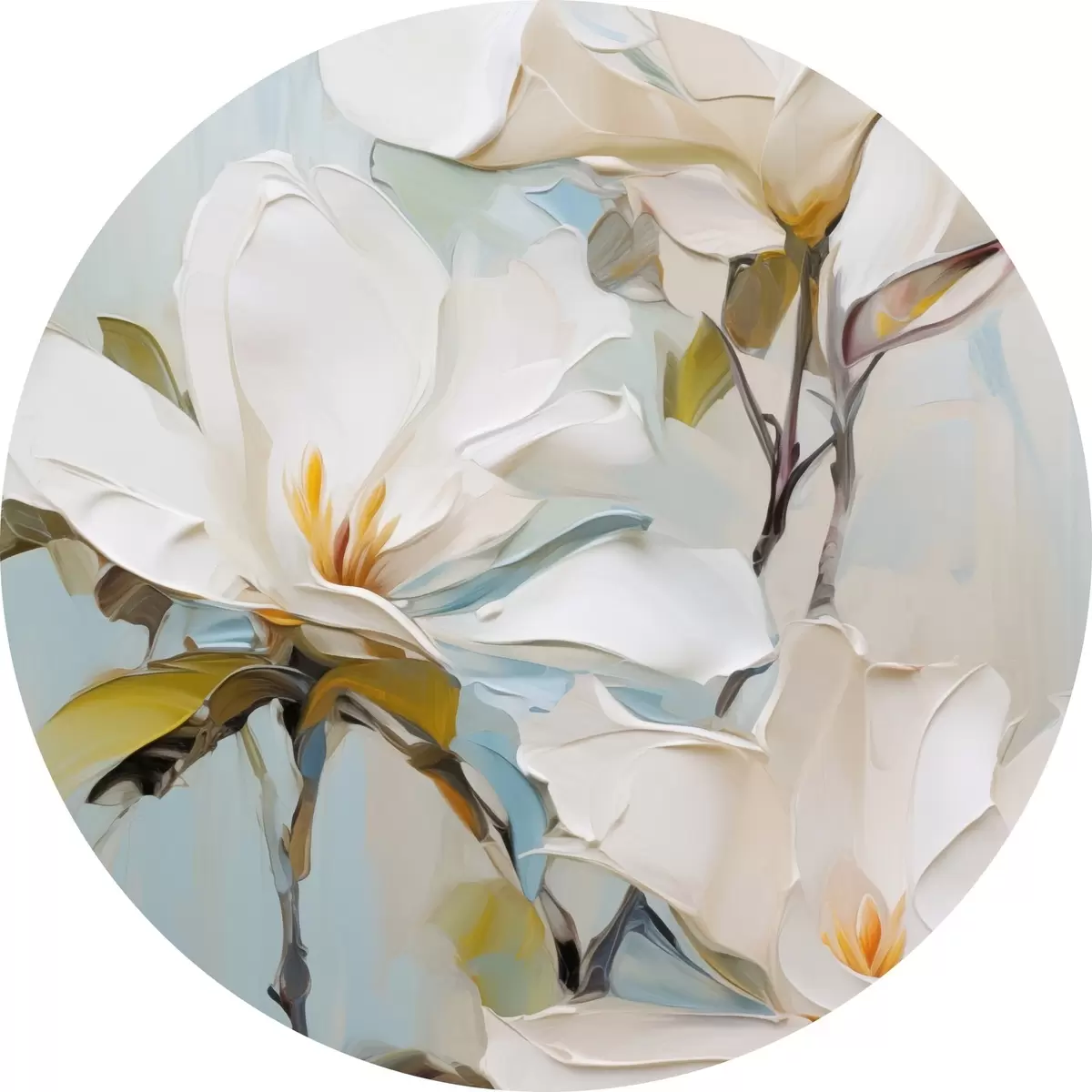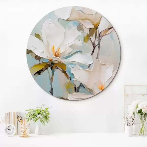Okrągłe obrazy Białe kwiaty magnolii, jasnoniebieskie tło z delikatnymi pociągnięciami pędzla, styl malarstwa olejnego, faktura impasto r46276