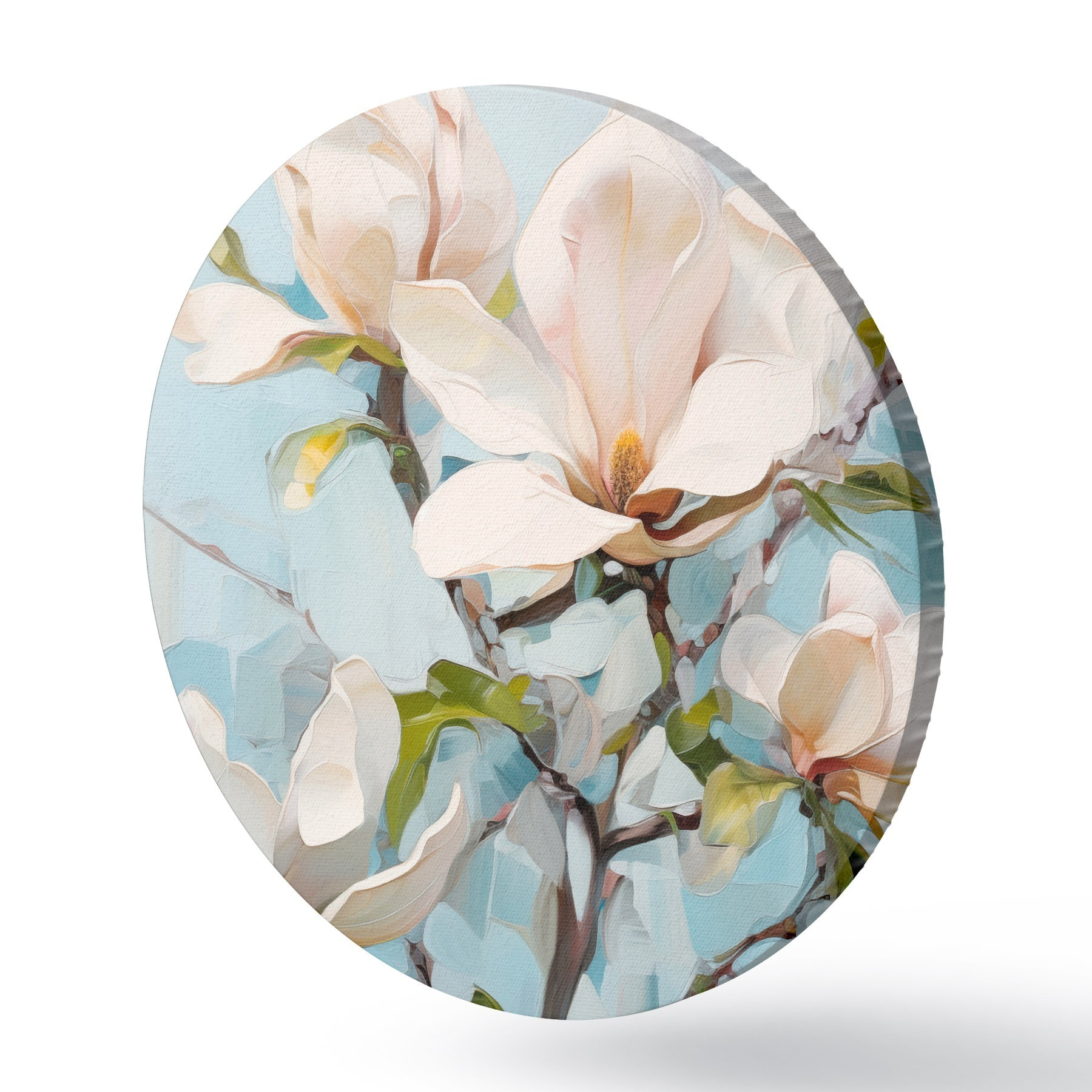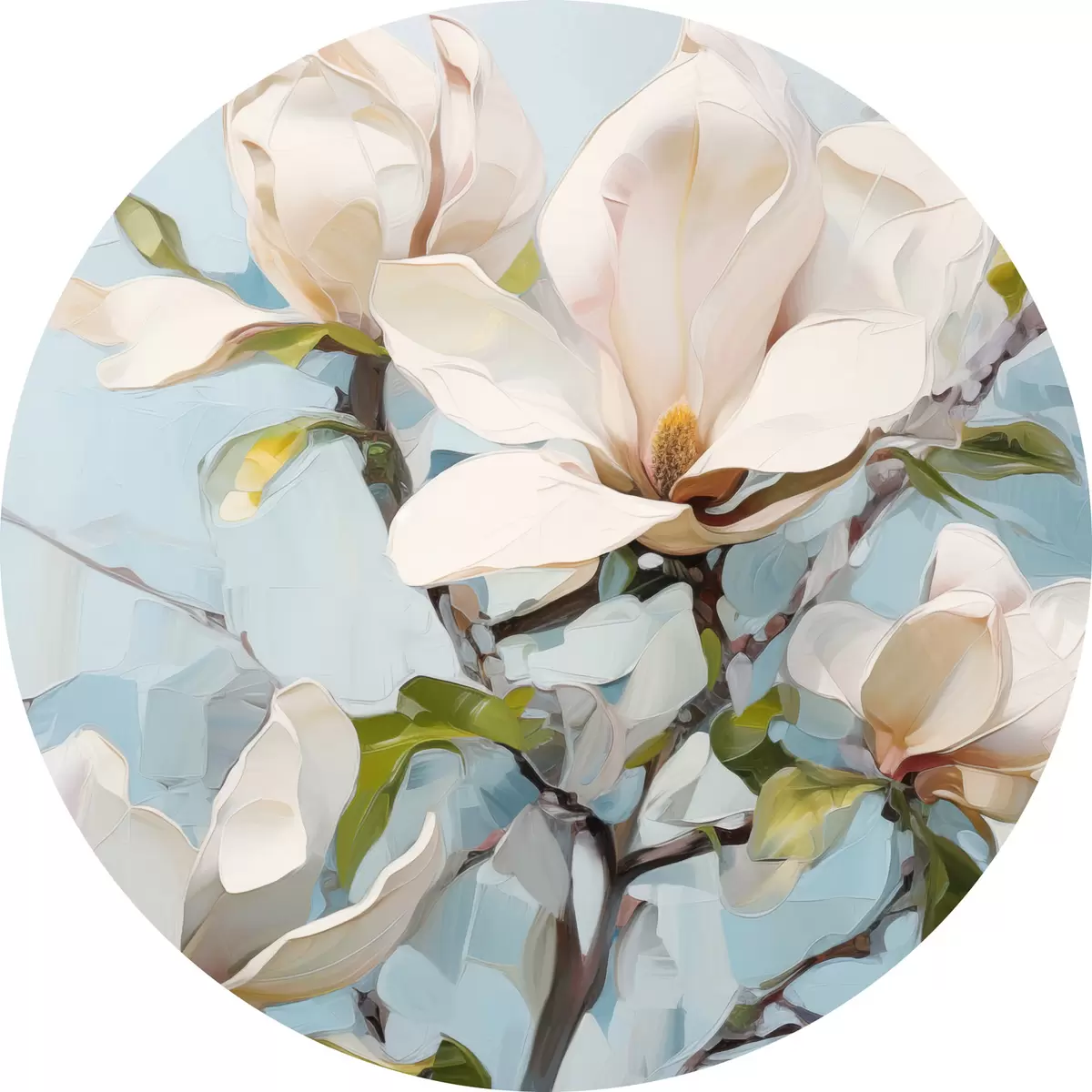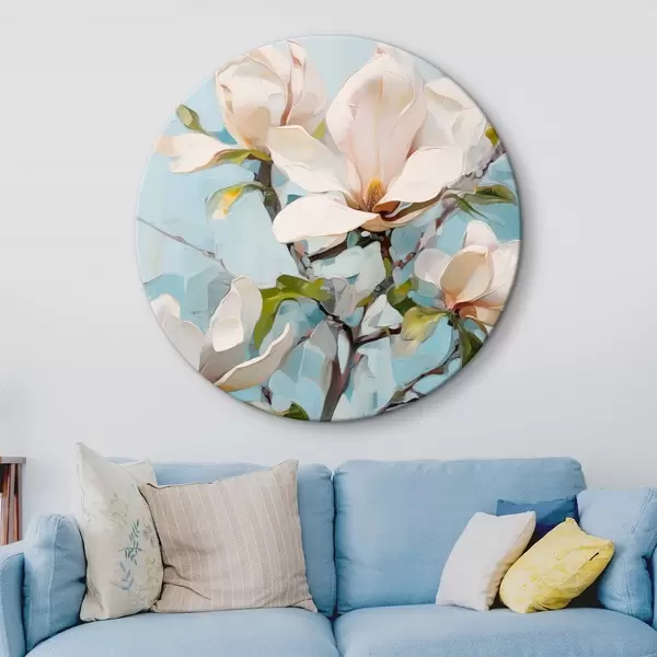 Okrągłe obrazy Białe kwiaty magnolii, jasnoniebieskie tło z delikatnymi pociągnięciami pędzla, styl malarstwa olejnego, faktura impasto r46277