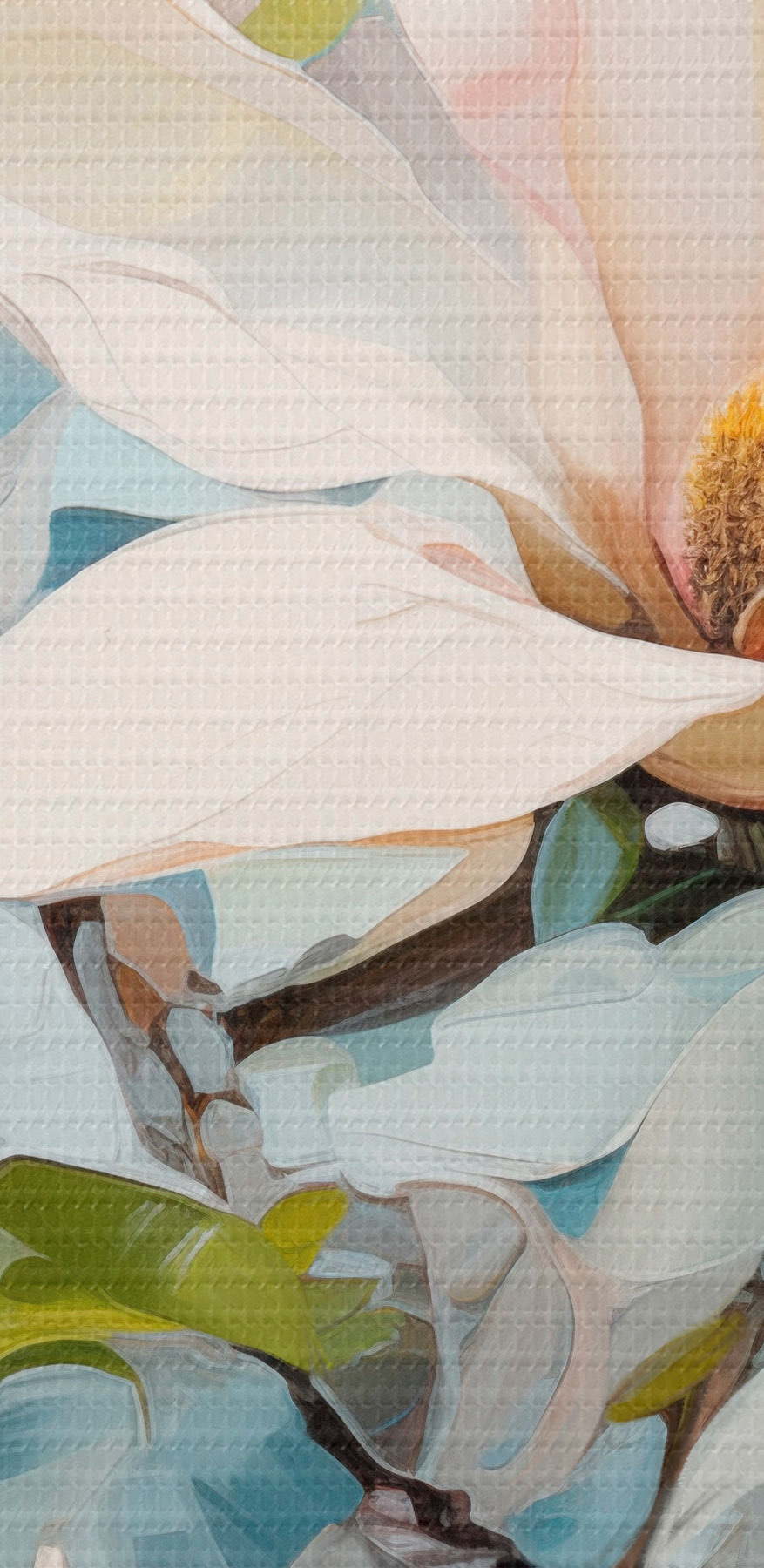 Okrągły obraz Białe kwiaty magnolii, jasnoniebieskie tło z delikatnymi pociągnięciami pędzla, styl malarstwa olejnego, faktura impasto Nr r46277