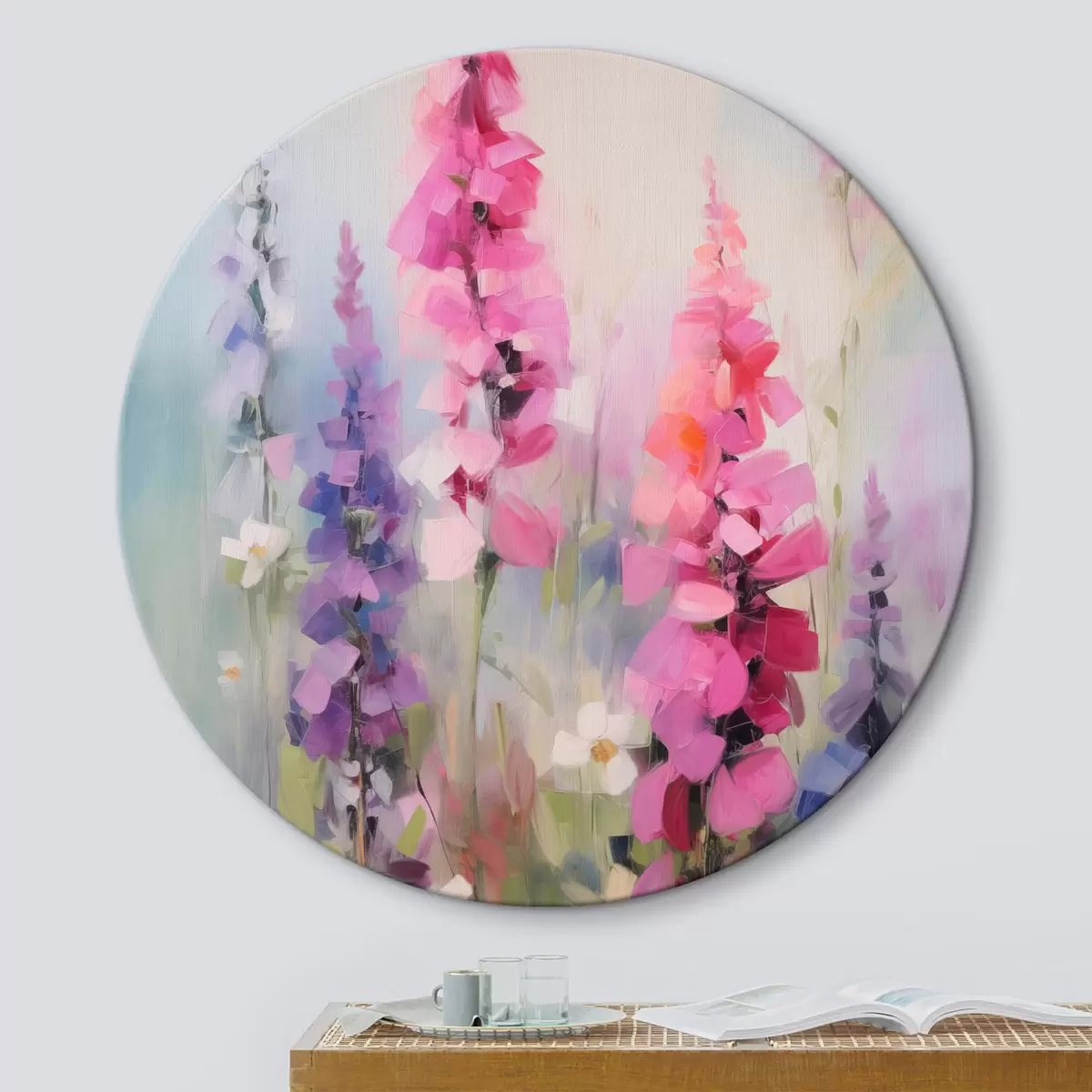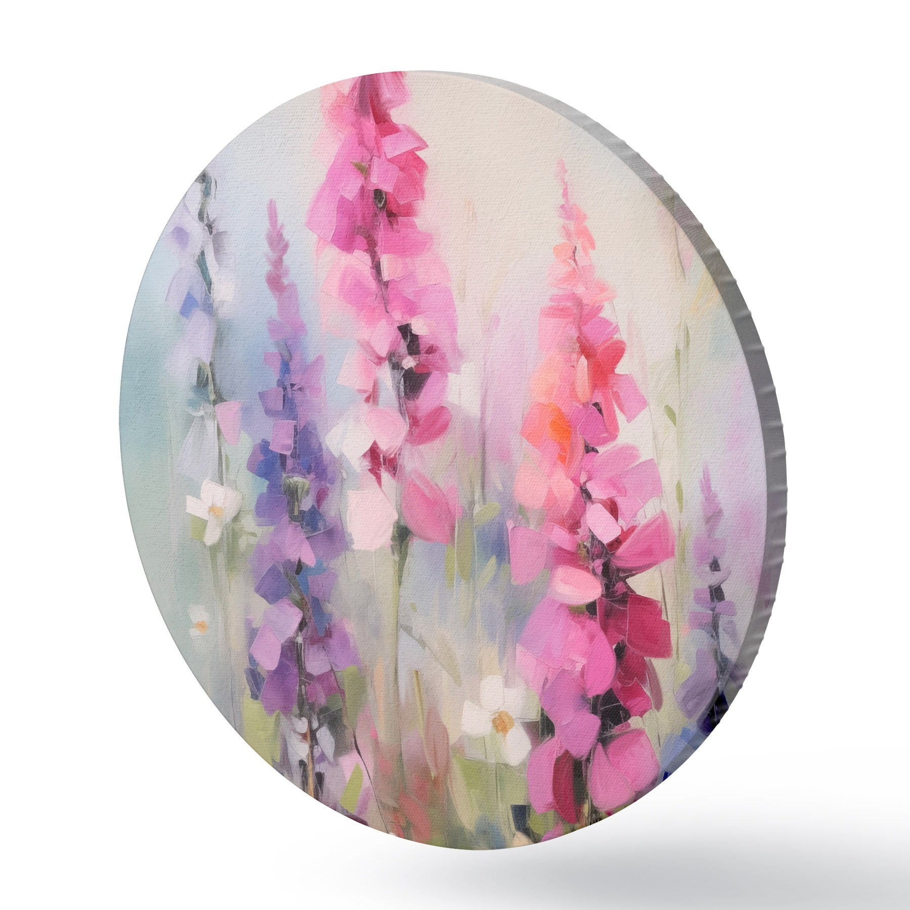 Okrągłe obrazy Różowe i fioletowe kwiaty z białymi stokrotkami na polu, delikatne pociągnięcia pędzla, pastelowe kolory, styl impresjonistyczny r46279