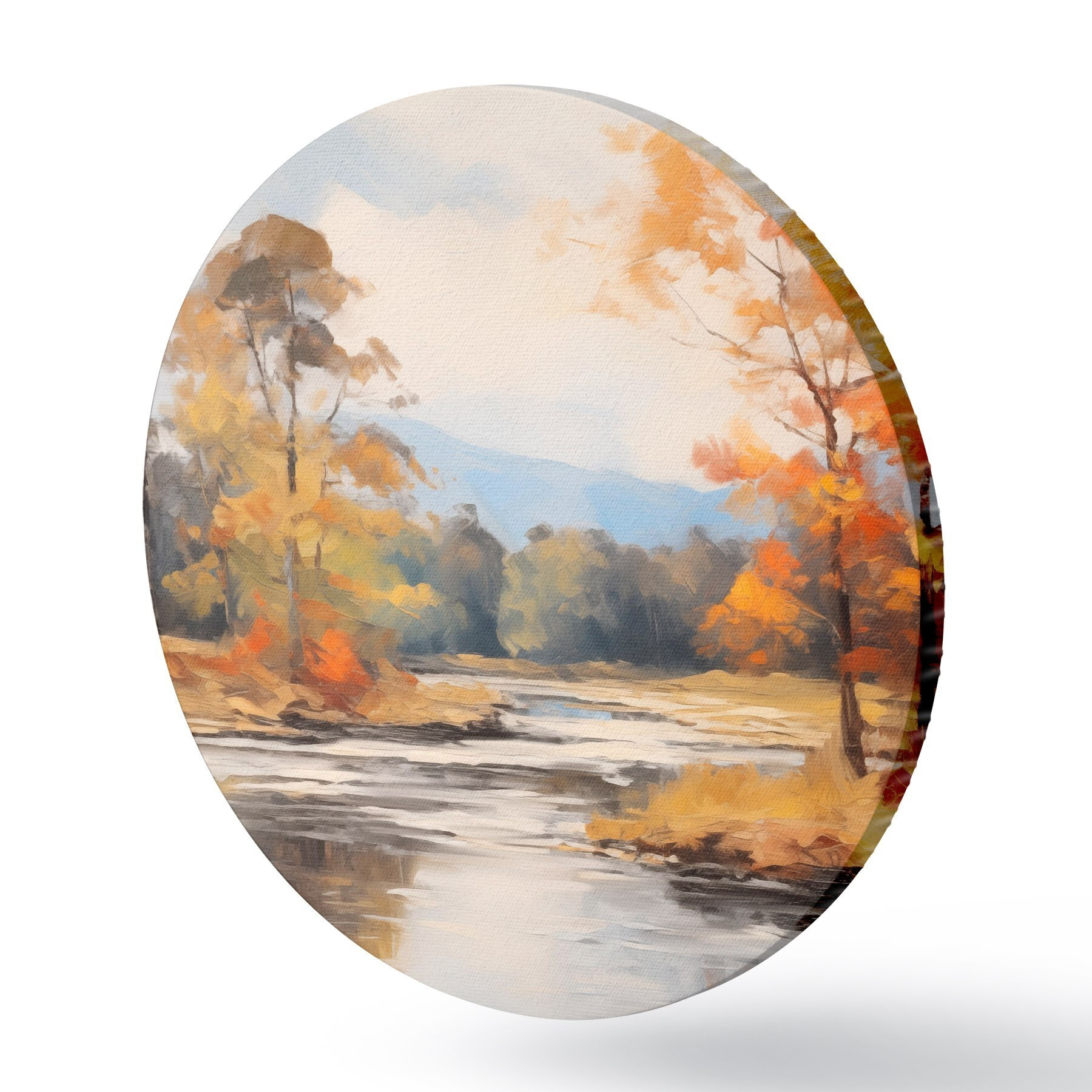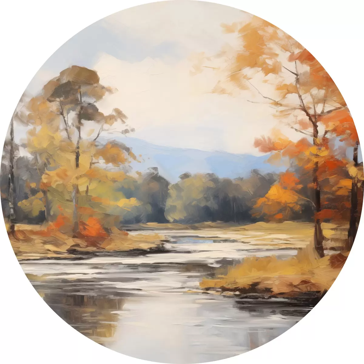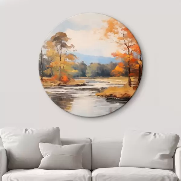 Okrągły obraz Krajobraz z rzeką płynącą przez las jesienią, żółte i pomarańczowe drzewa, styl malarski Nr r46281