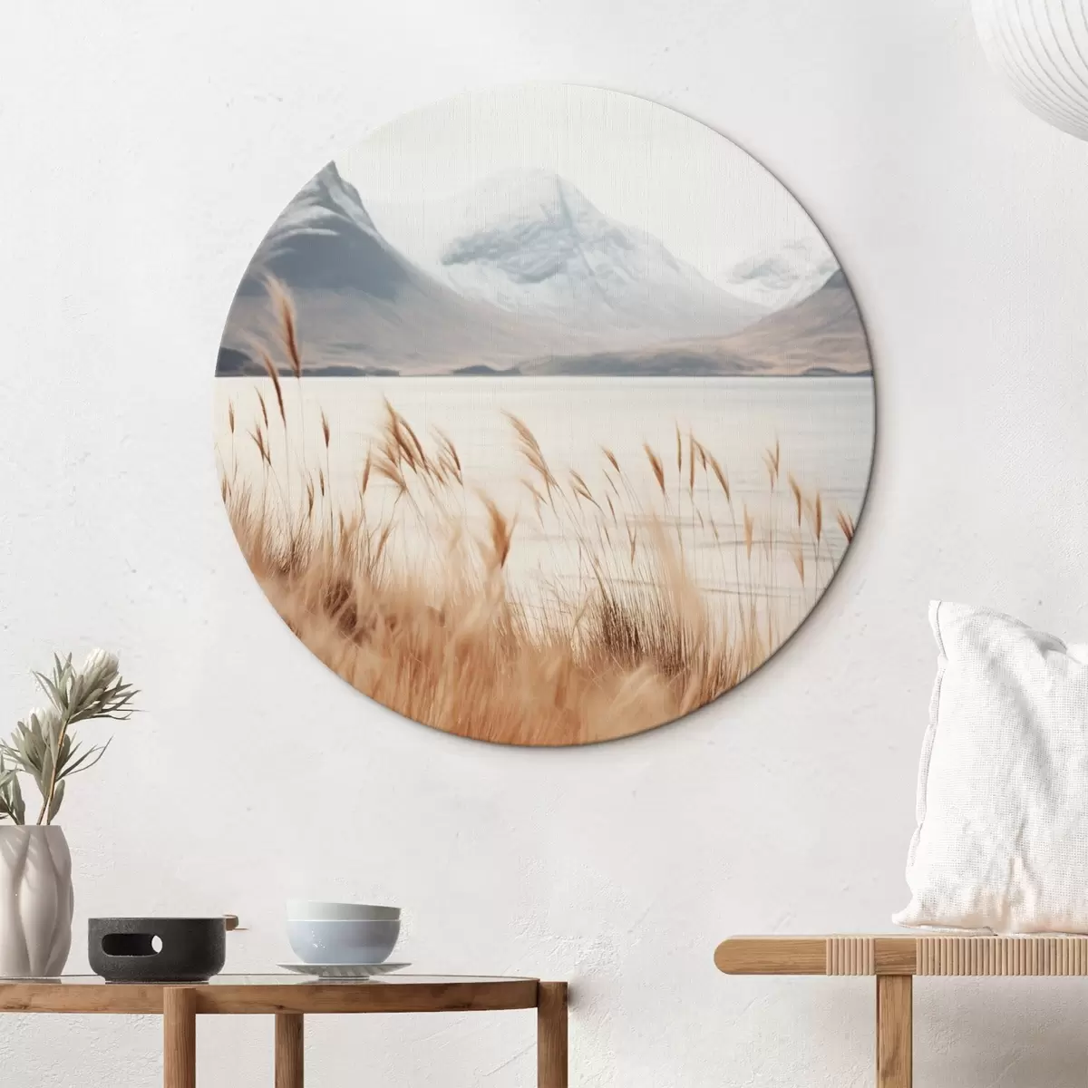 Okrągły obraz Pole trawy pampasowej przed jeziorem, w tle ośnieżone góry, miękkie światło Nr r46282