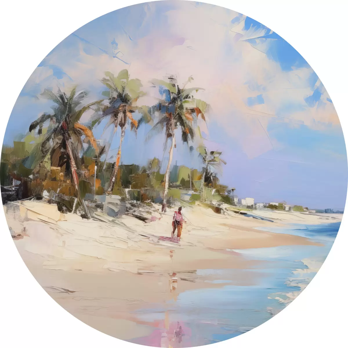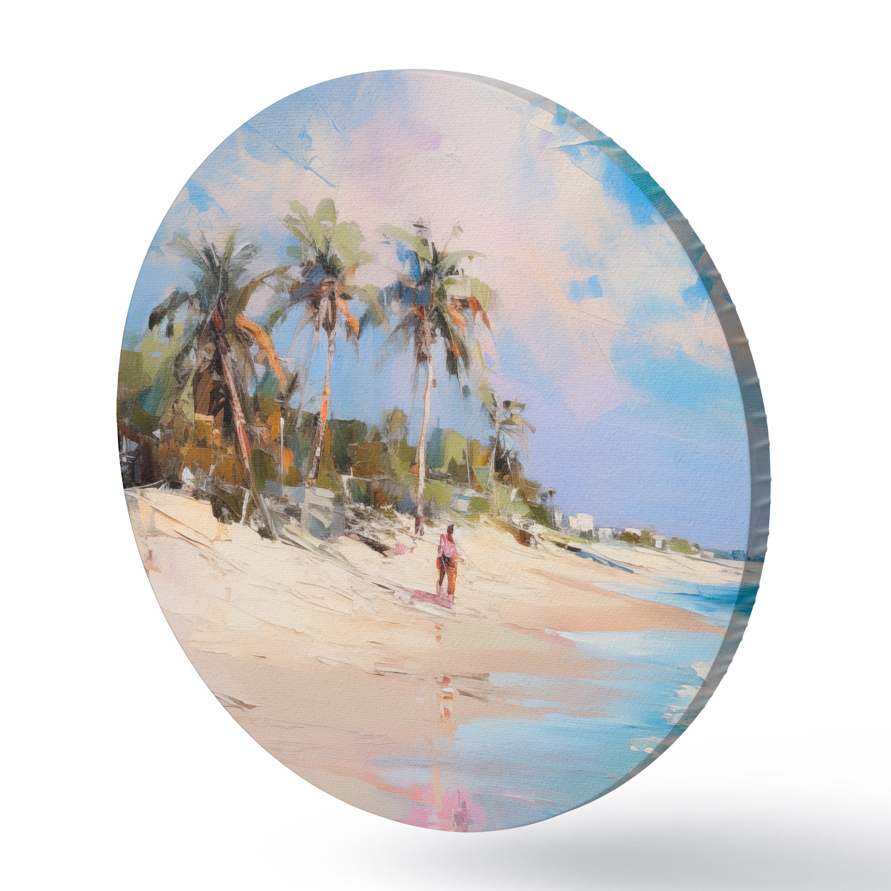 Okrągły obraz Abstrakcyjny krajobraz, plaża z palmami, jasny, słoneczny dzień z błękitnym niebem i kilkoma chmurami Nr r46284