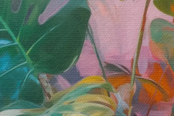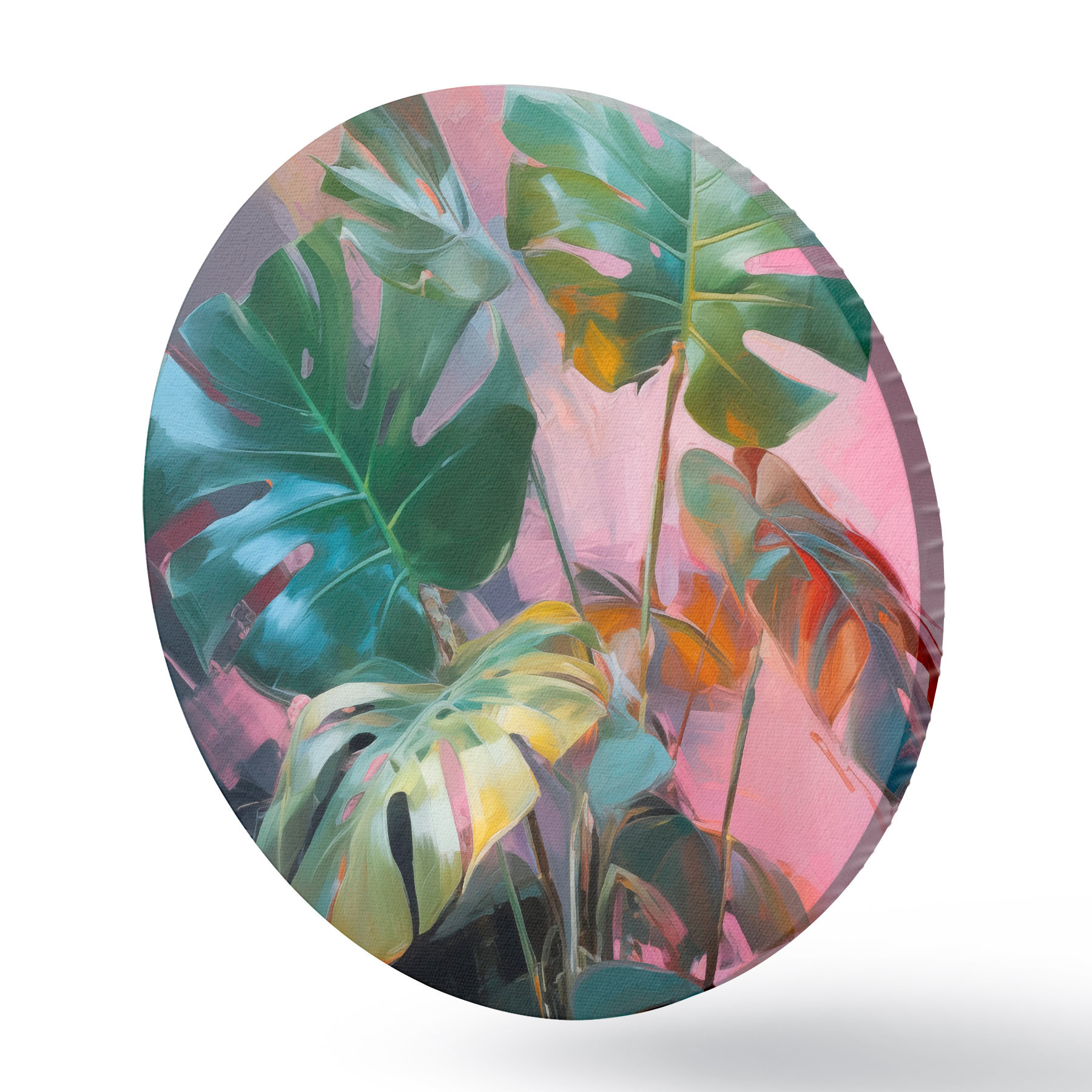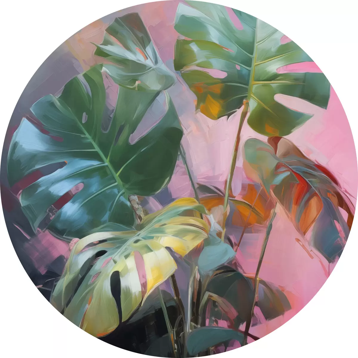 Okrągły obraz Abstrakcyjna roślina monstera o intensywnie zielonych liściach na tle delikatnych odcieni różu i fioletu Nr r46286