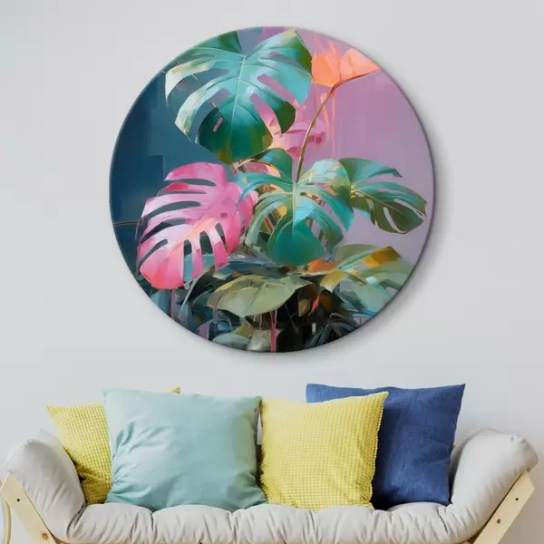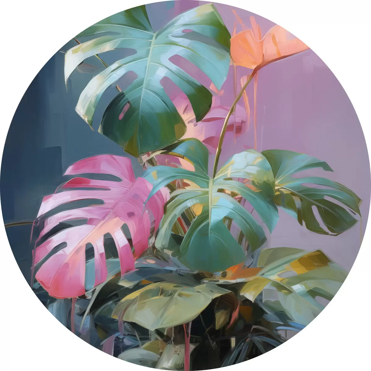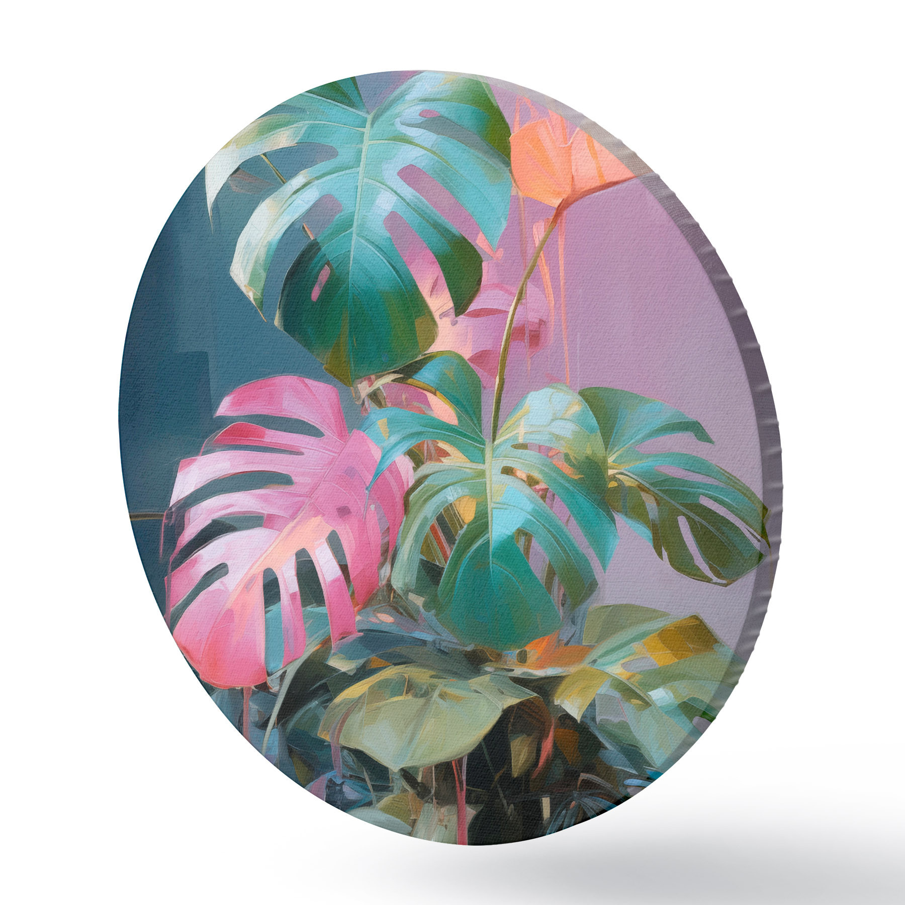 Okrągłe obrazy Abstrakcyjna roślina monstera z różowymi i zielonymi liśćmi, żywe kolory, na zamazanym tle r46287