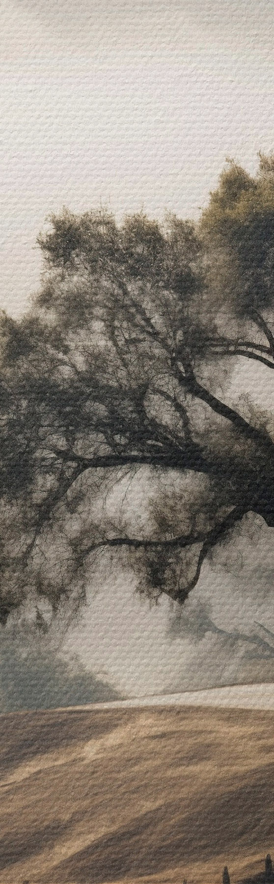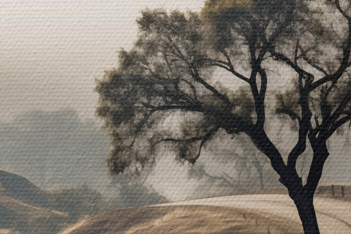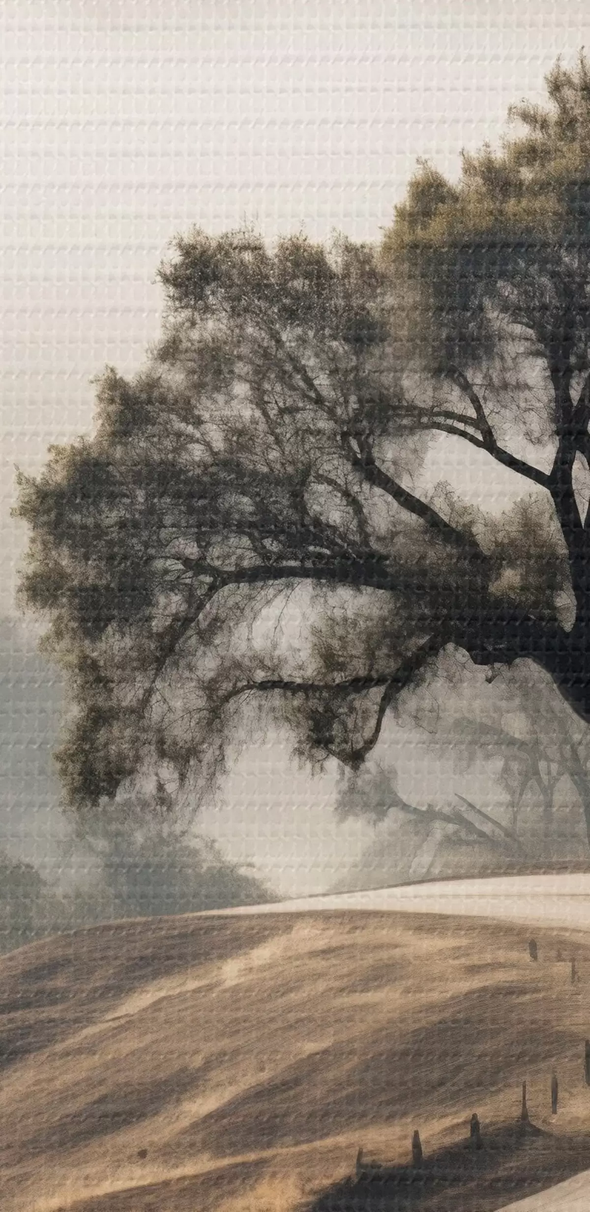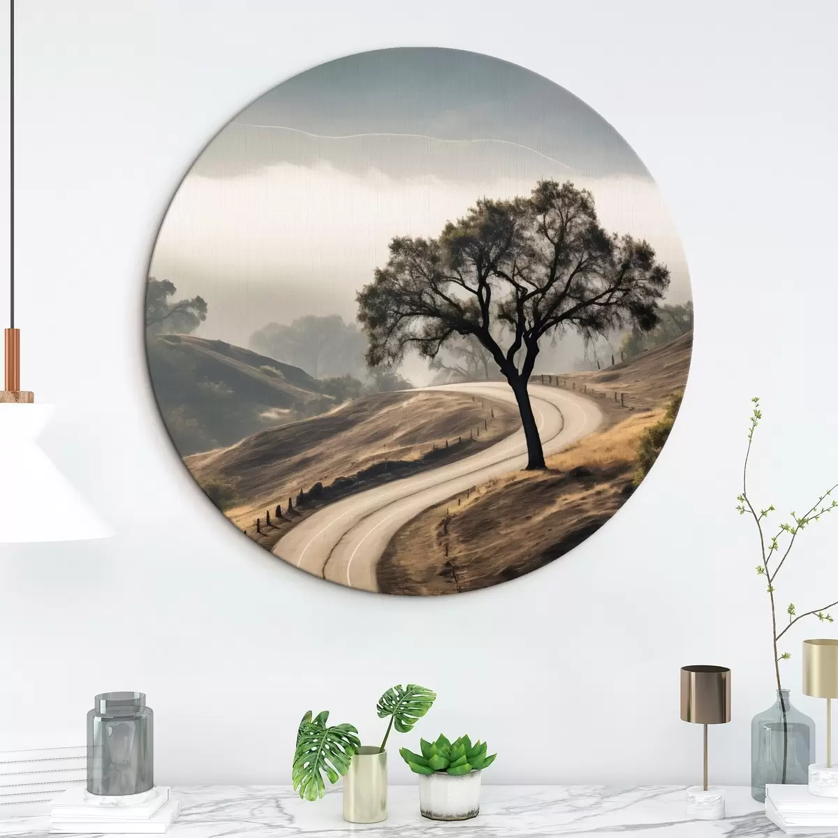 Okrągłe obrazy Kręta droga wśród falistych wzgórz z drzewem na pierwszym planie, w tle mgła i góry r46288