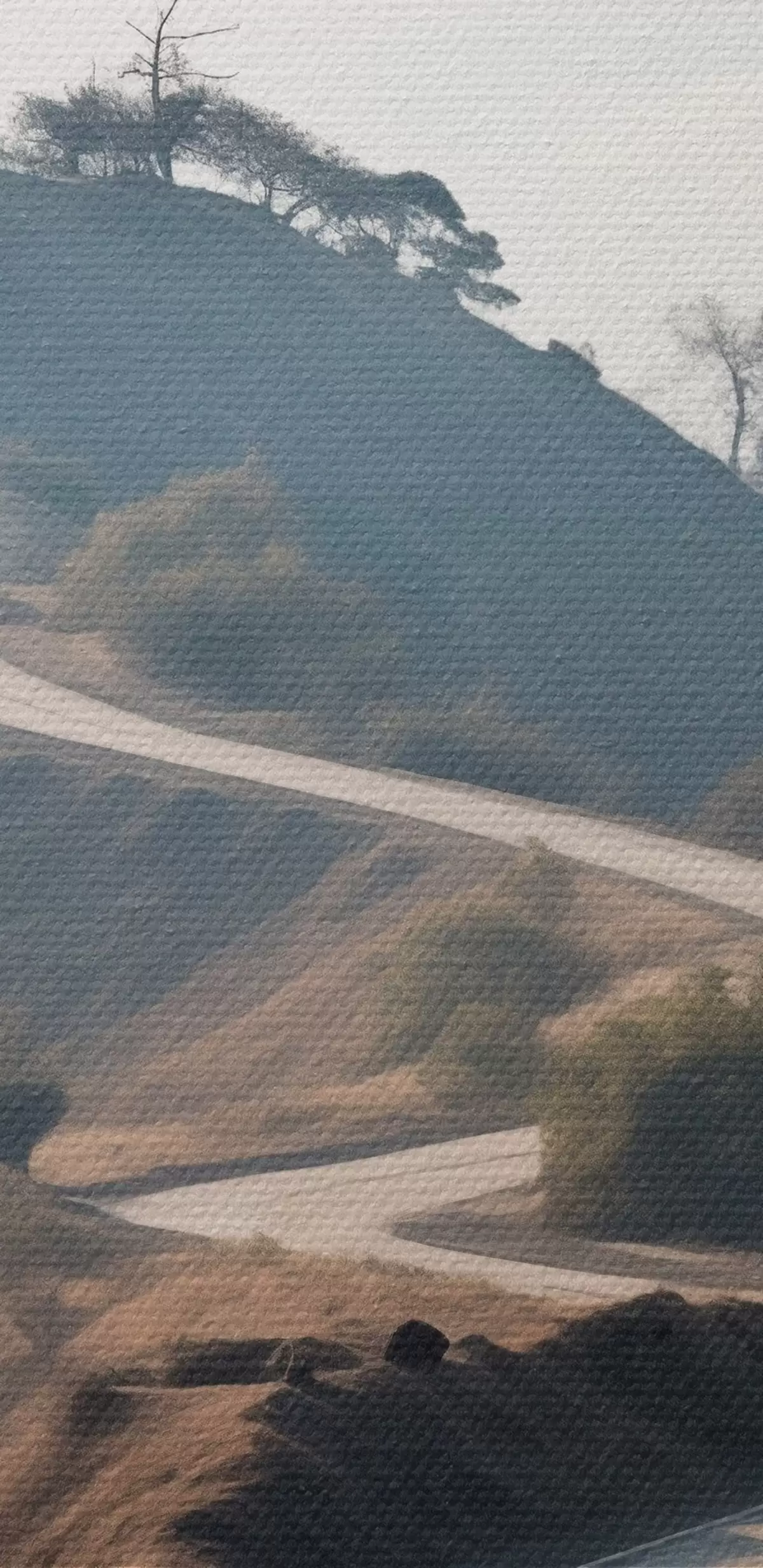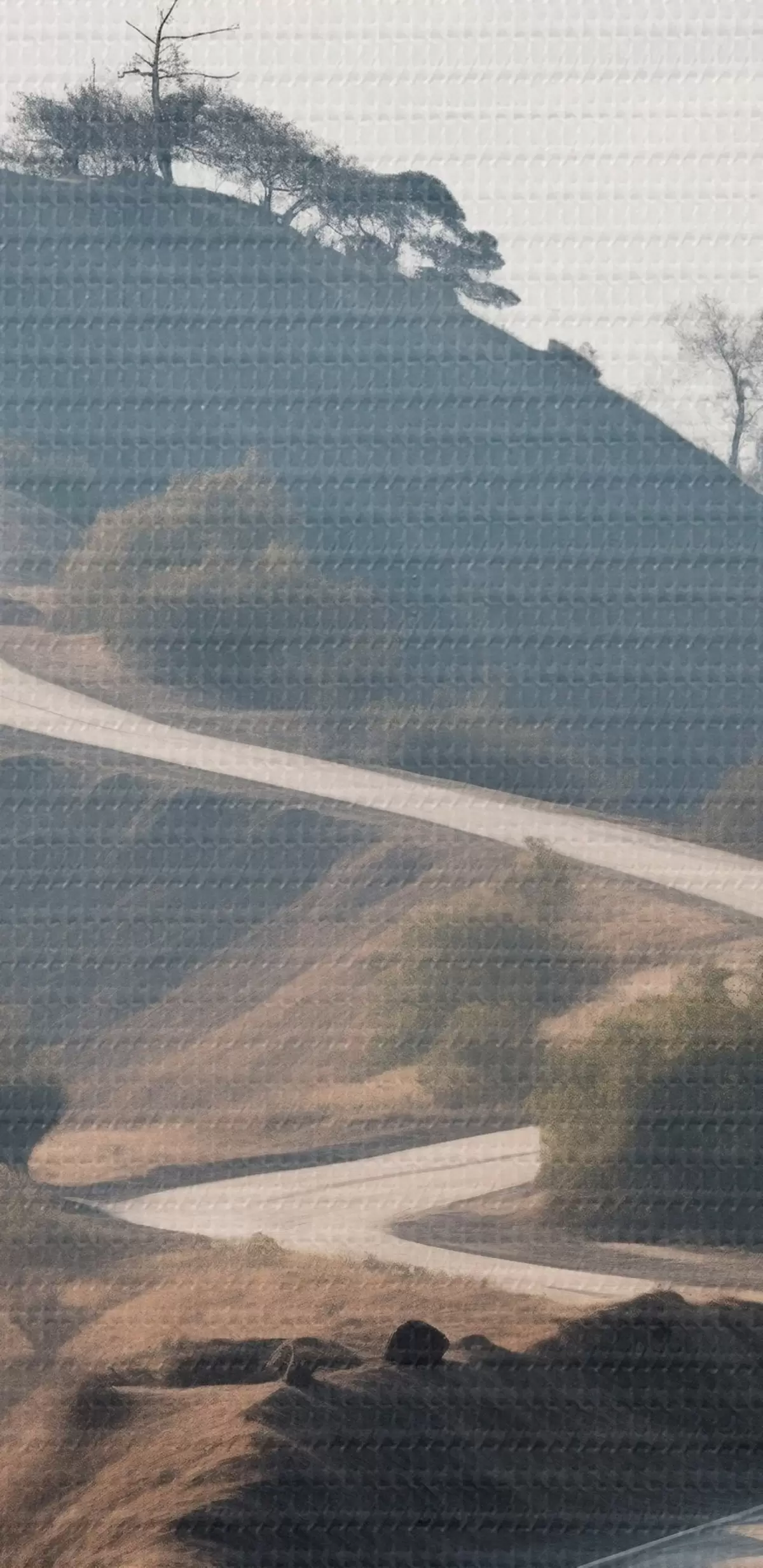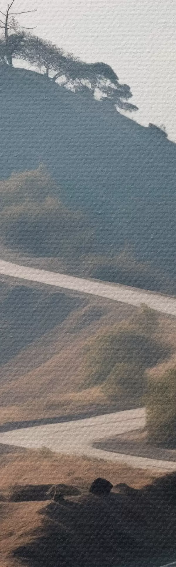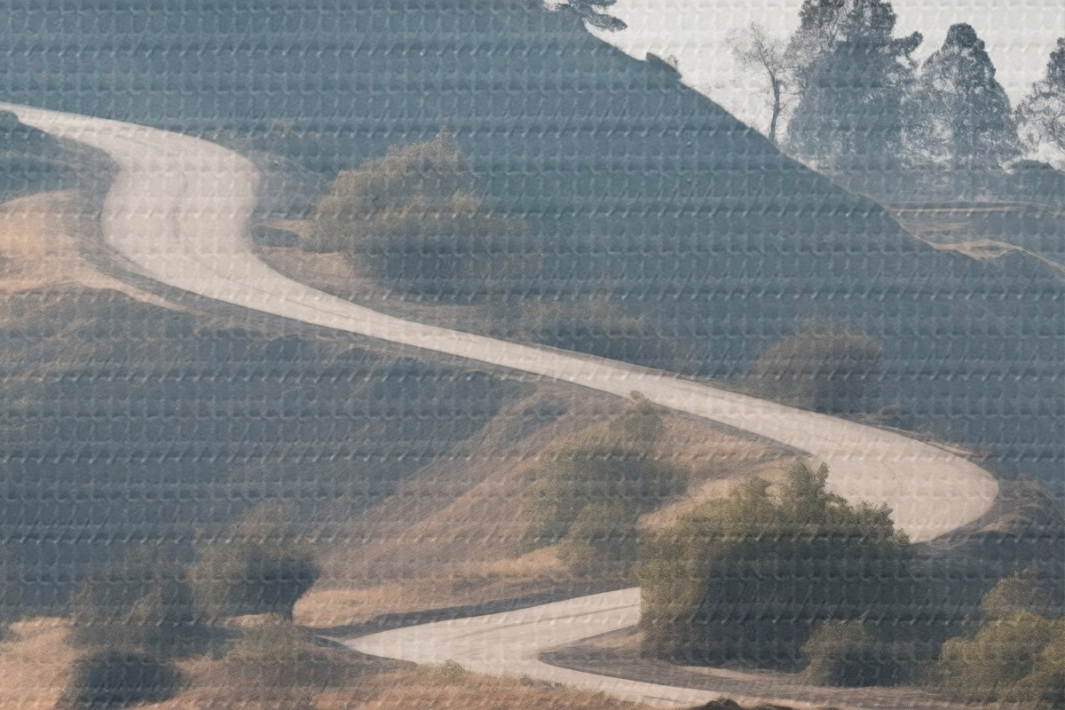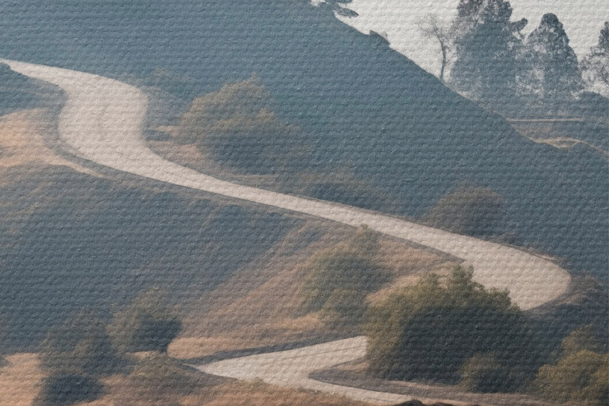 Okrągłe obrazy Kręta droga przez pagórkowaty krajobraz z suchą trawą pod czystym niebem, z górami w oddali r46289
