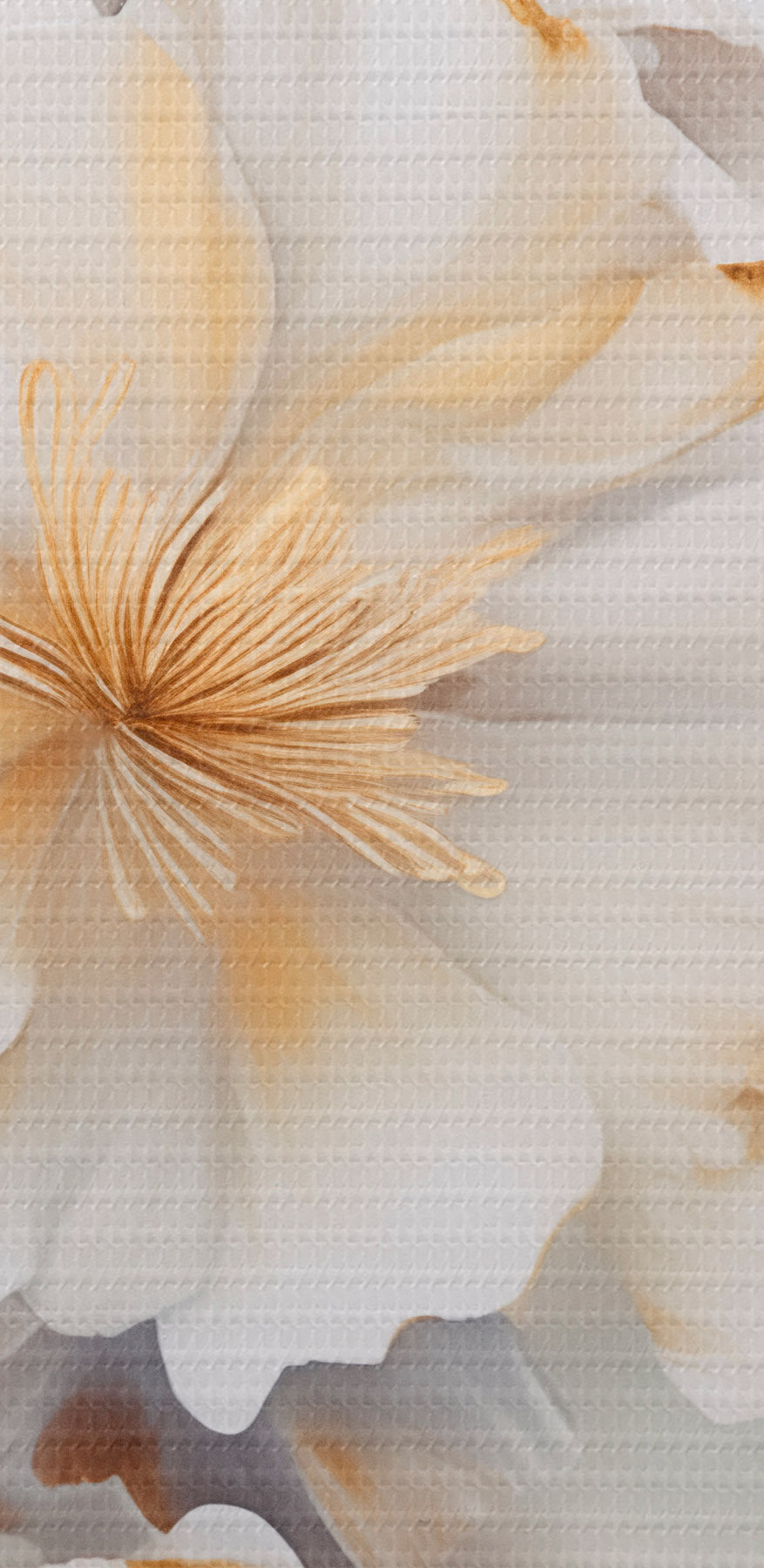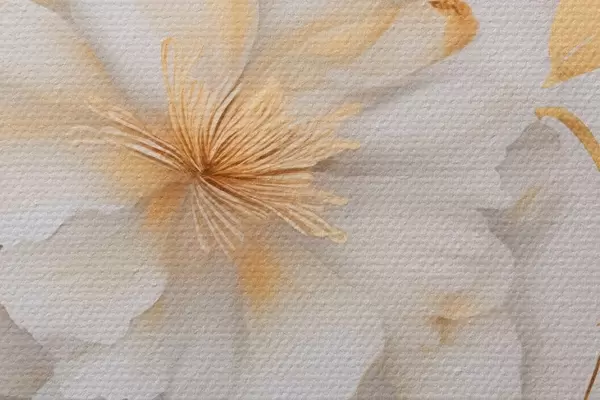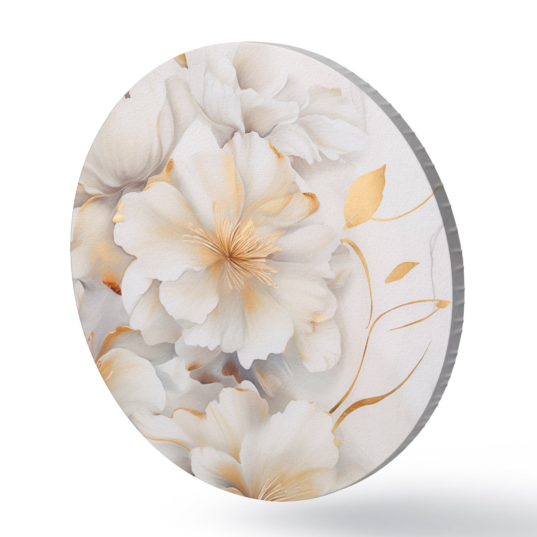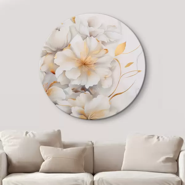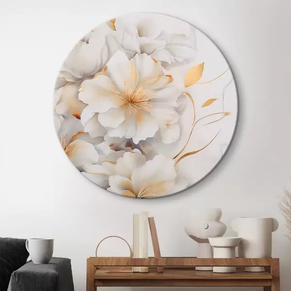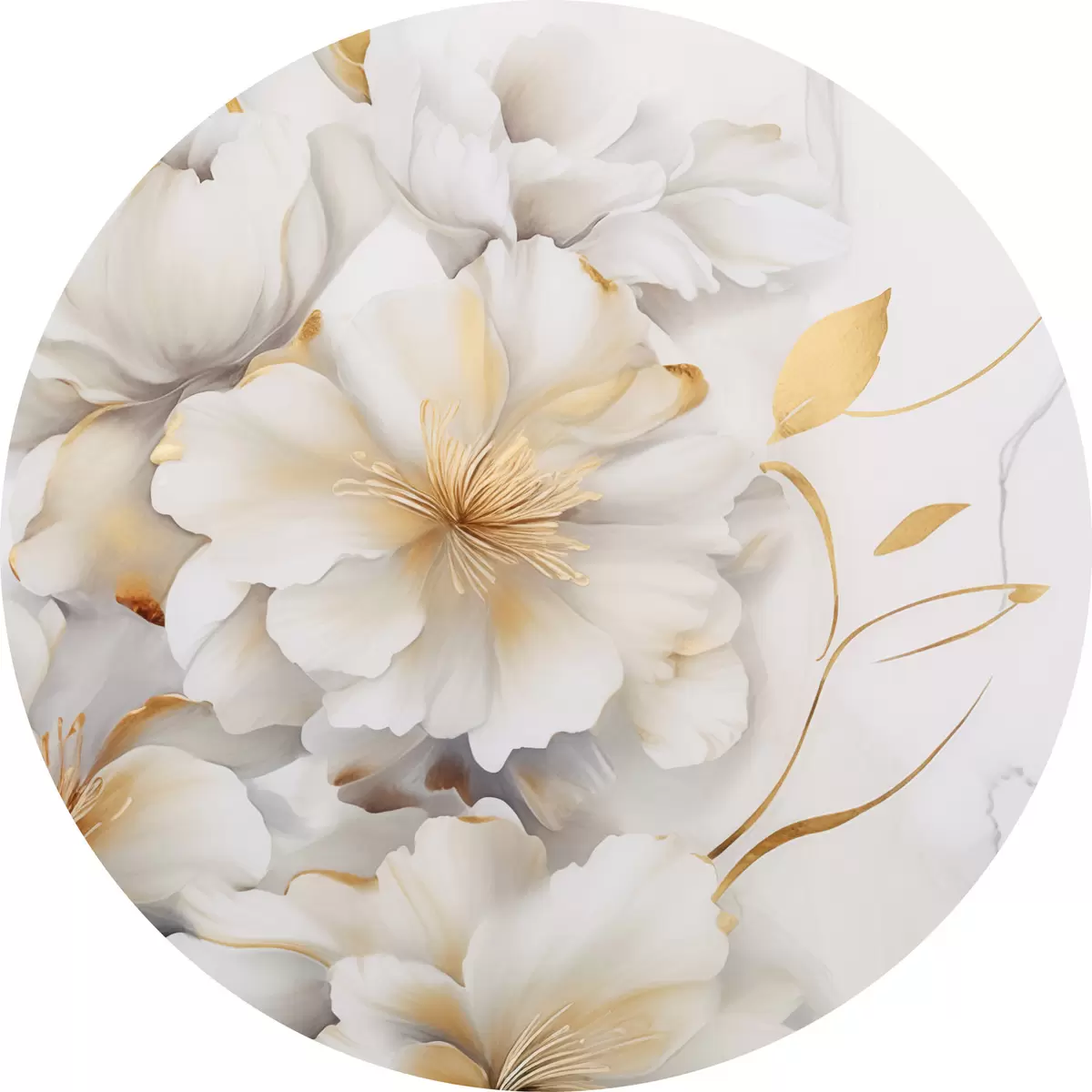 Okrągły obraz Białe kwiaty z żółtymi detalami, płatki z delikatnymi cieniami, jasne tło z subtelnym efektem marmuru Nr r46292