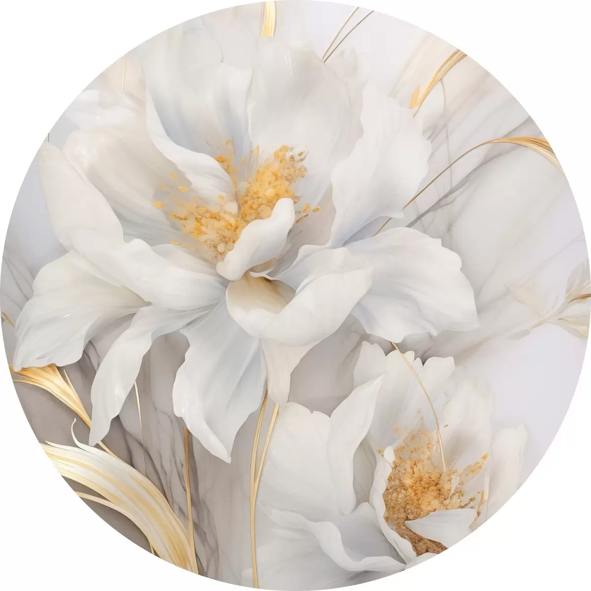 Okrągły obraz Białe kwiaty z żółtymi słupkami i łodygami, delikatne płatki, elegancka kompozycja, neutralne tło Nr r46293