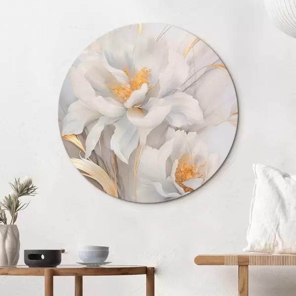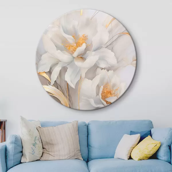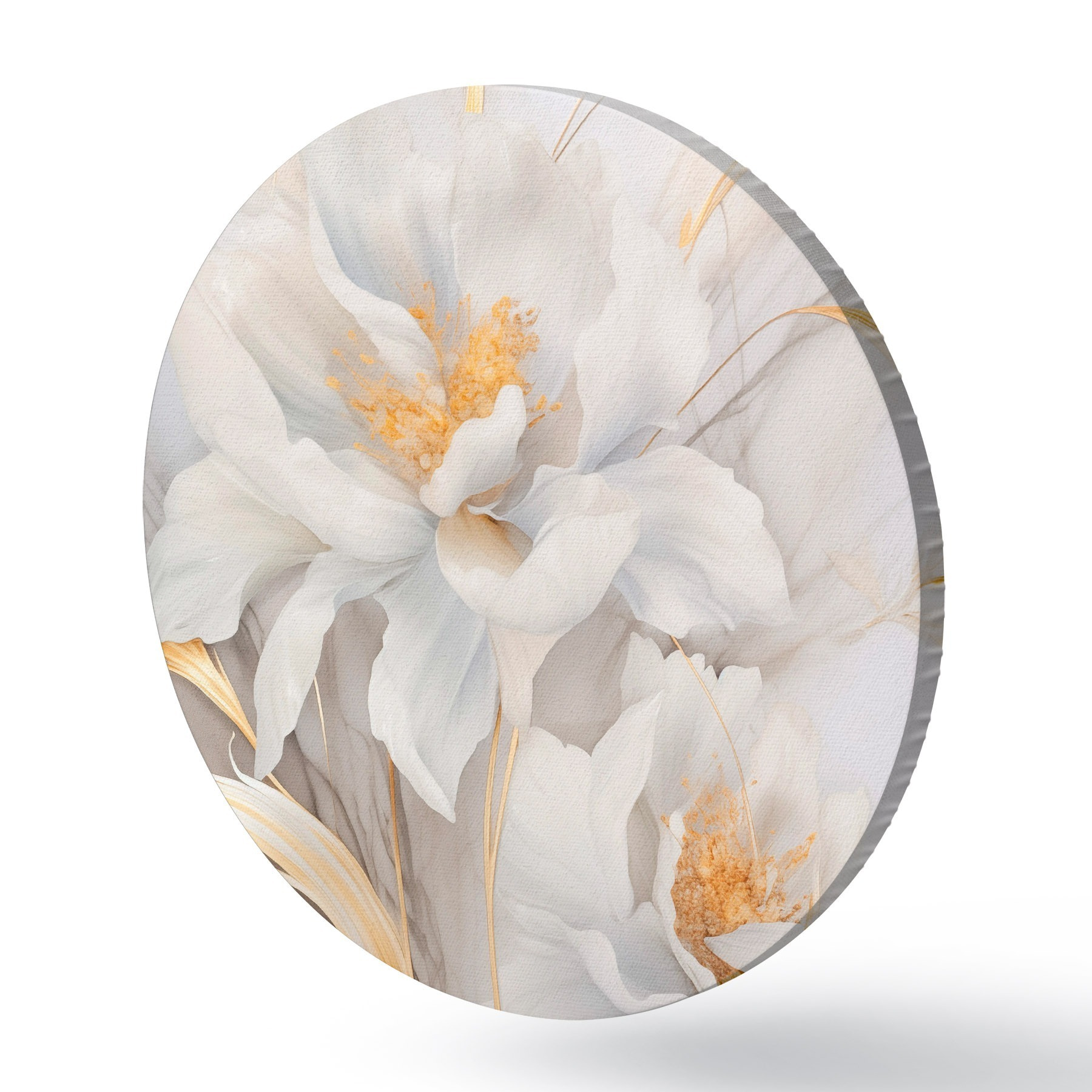 Okrągłe obrazy Białe kwiaty z żółtymi słupkami i łodygami, delikatne płatki, elegancka kompozycja, neutralne tło r46293