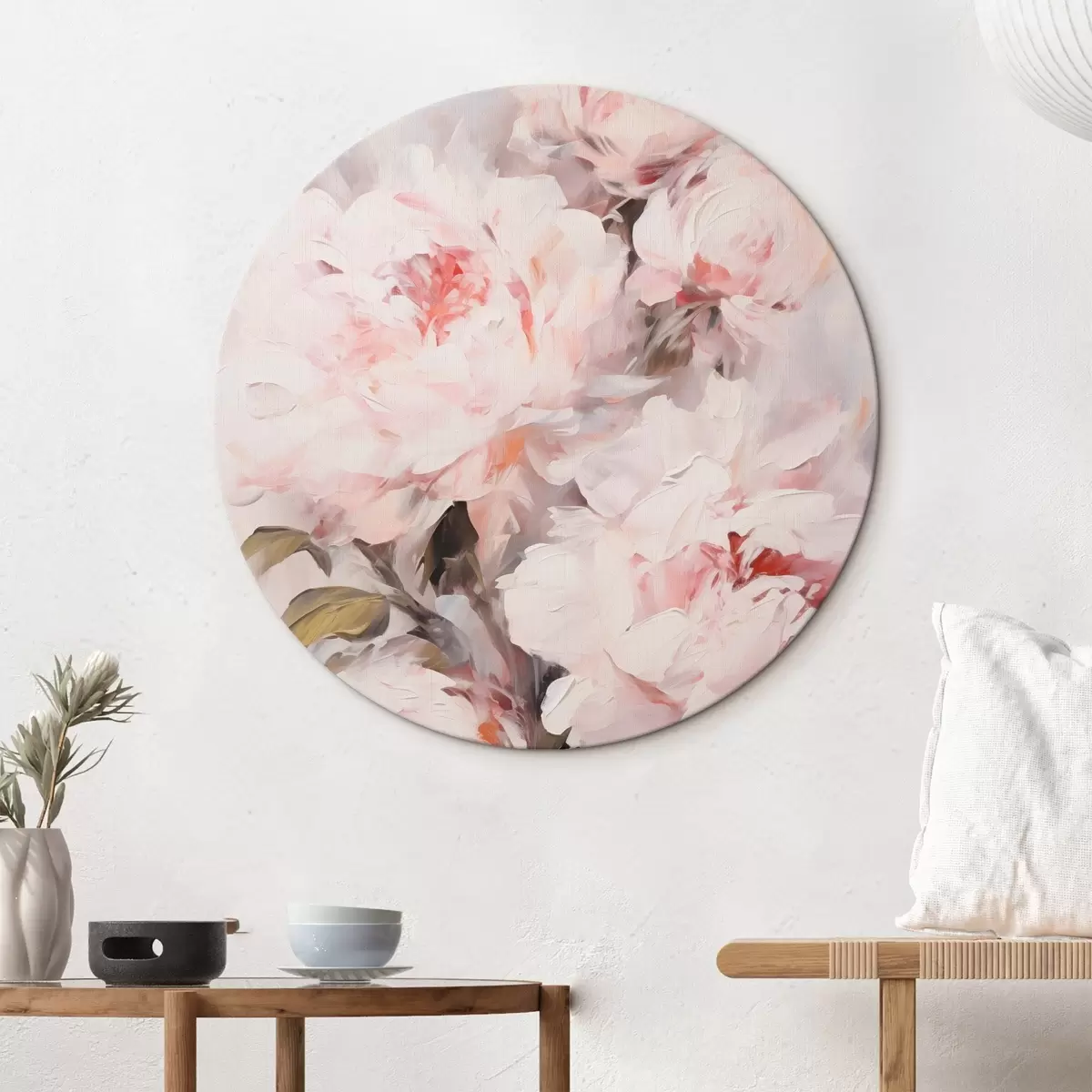 Okrągły obraz Bukiet jasnoróżowych piwonii z zielonymi liśćmi, delikatne pociągnięcia pędzla, pastelowe kolory, na jasnym tle Nr r46294