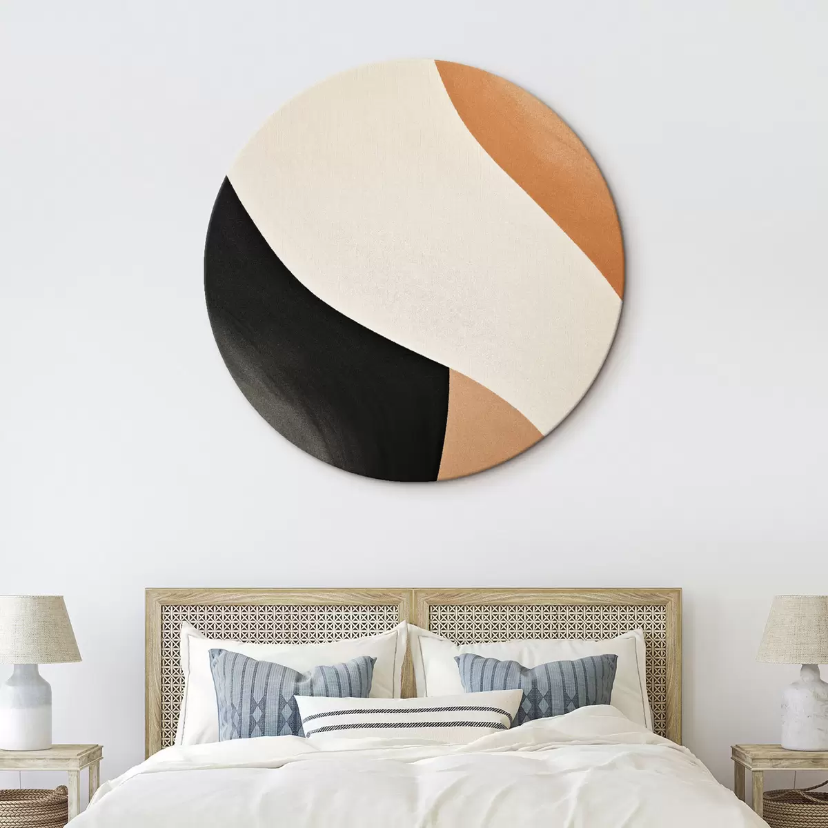 Okrągły obraz Wyrazista linia w kształcie litery S w kolorze kremowym, czarnym i z akcentami w kolorze terakoty Nr r46495
