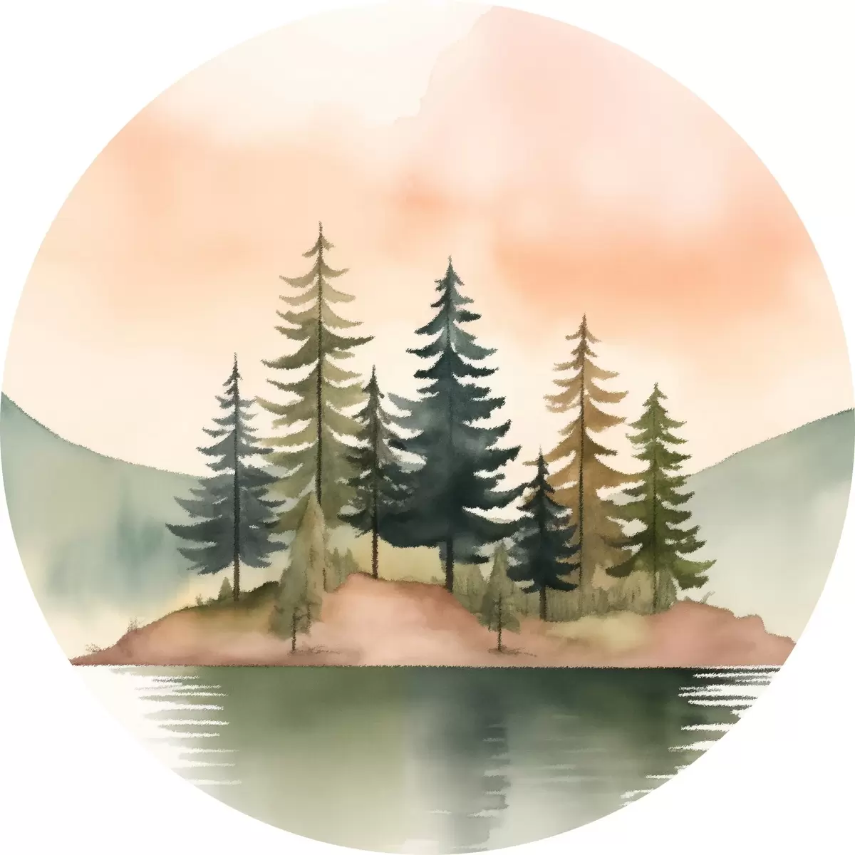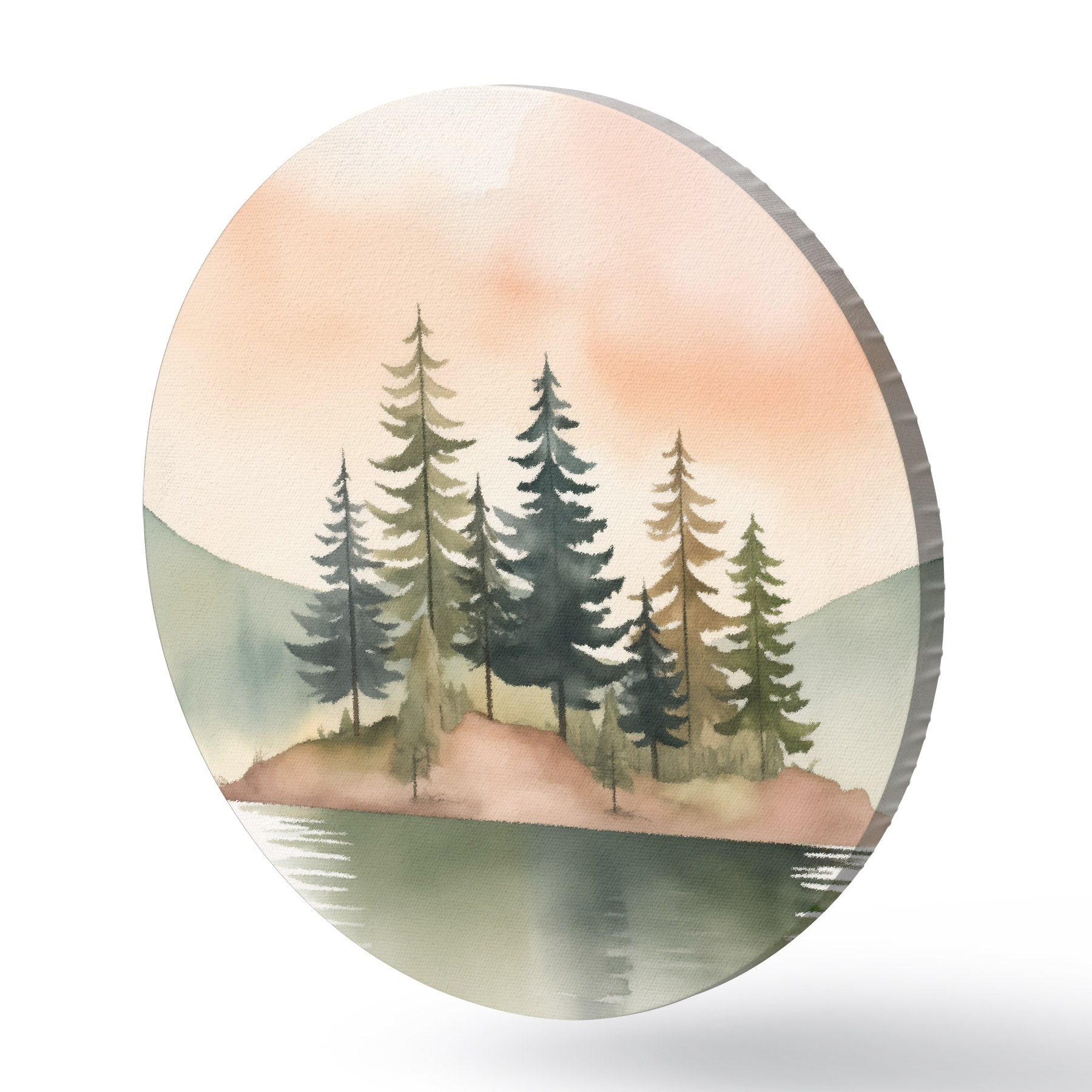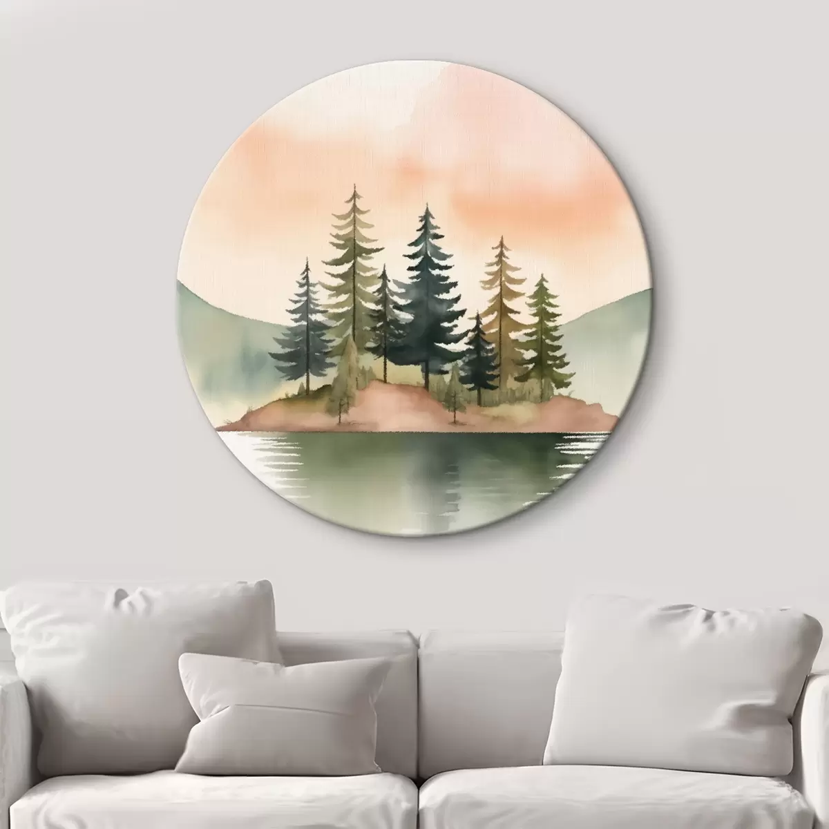 Okrągły obraz Akwarelowe sosny na zamglonej wysepce, delikatne brzoskwiniowe niebo Nr r46505