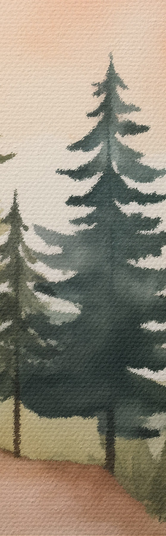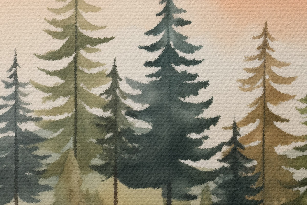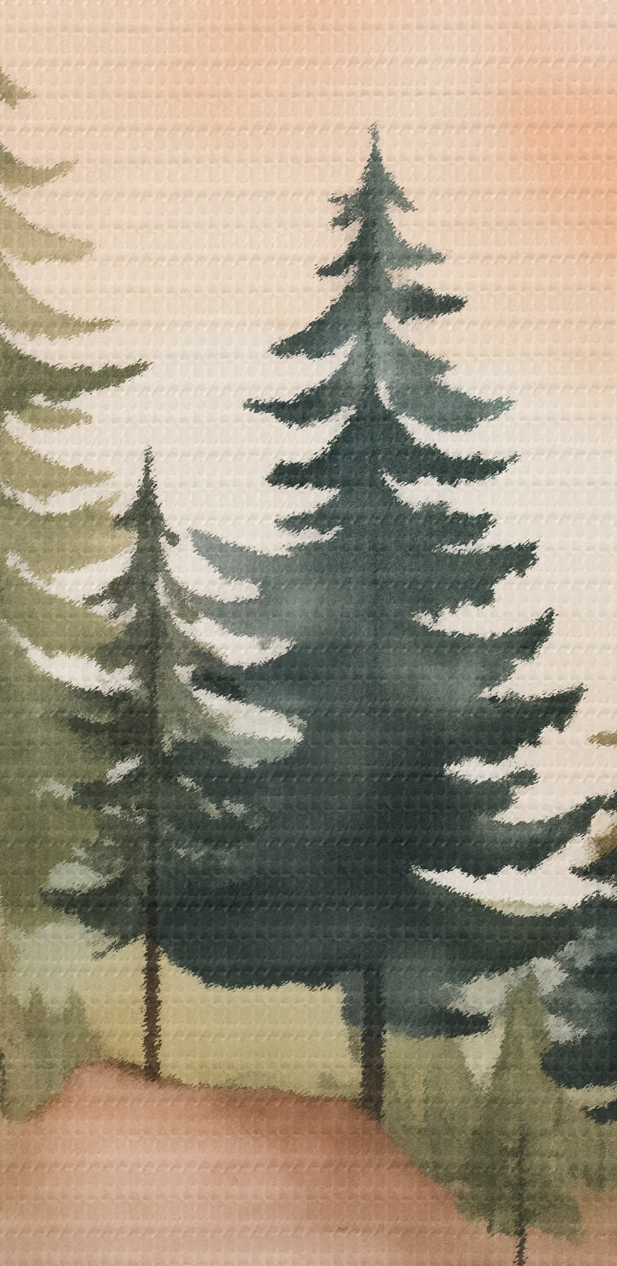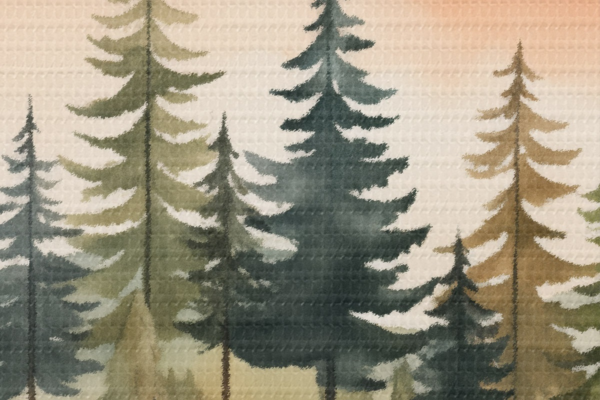 Okrągły obraz Akwarelowe sosny na zamglonej wysepce, delikatne brzoskwiniowe niebo Nr r46505