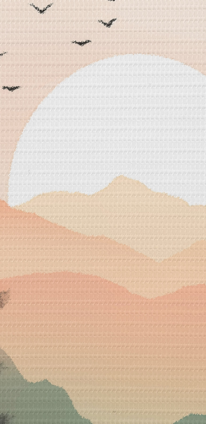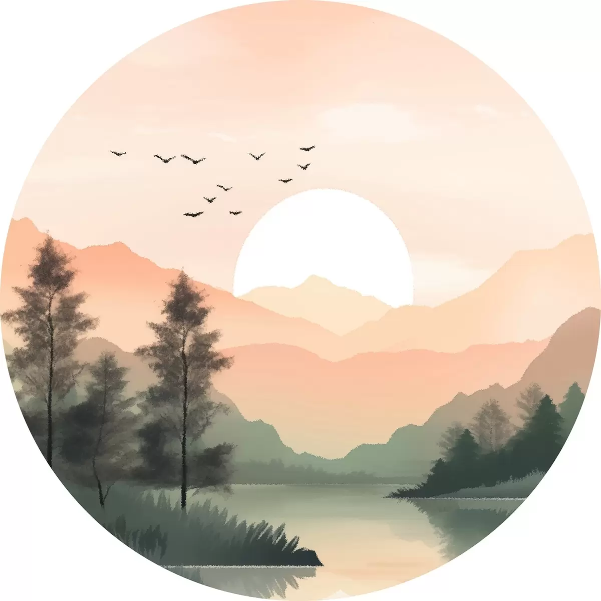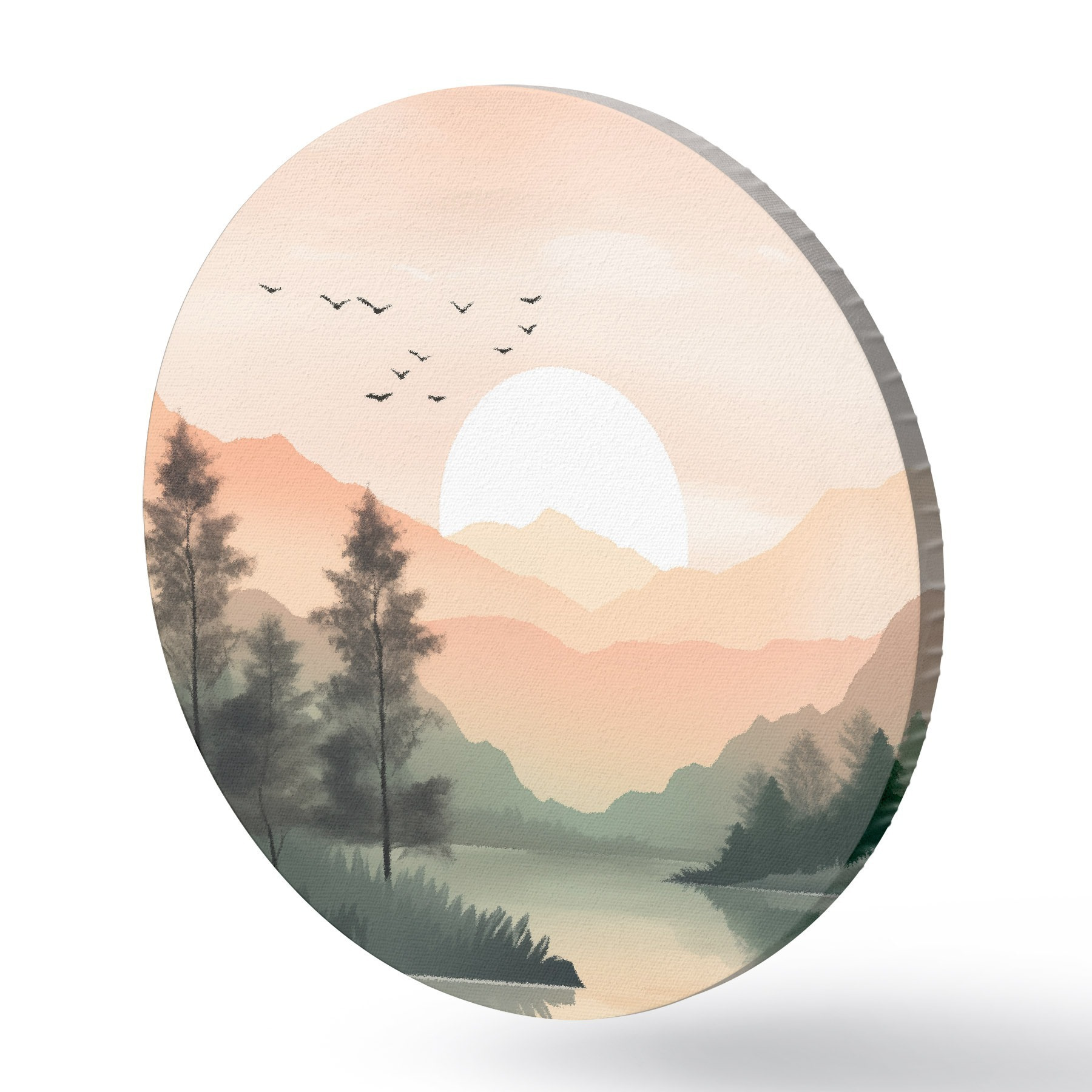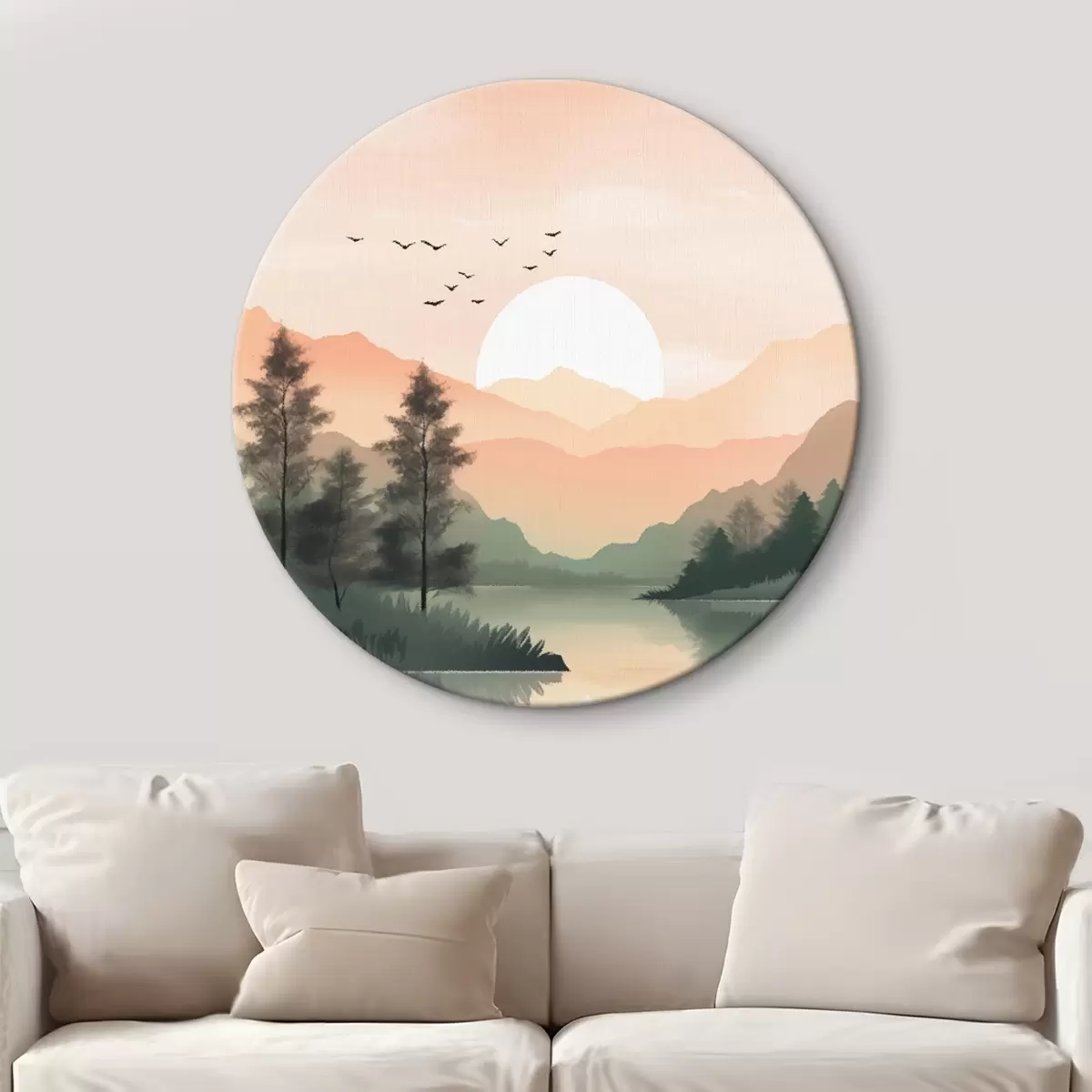 Okrągły obraz Pastelowy zachód słońca nad spokojnym jeziorem z odległymi wzgórzami i ptakami Nr r46508