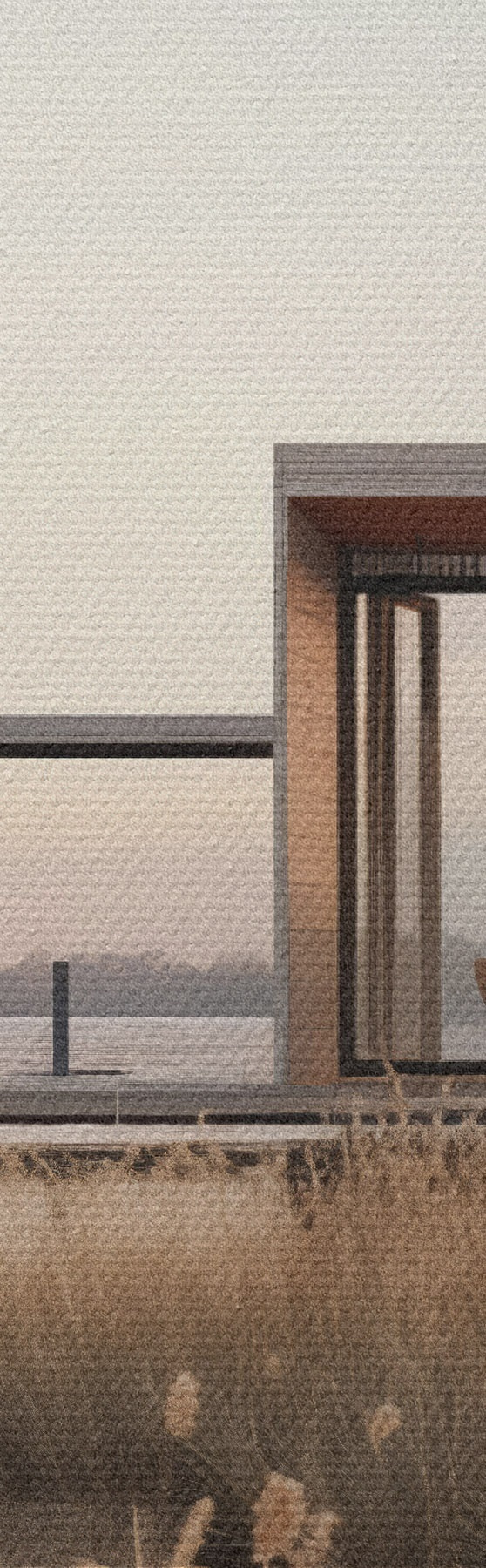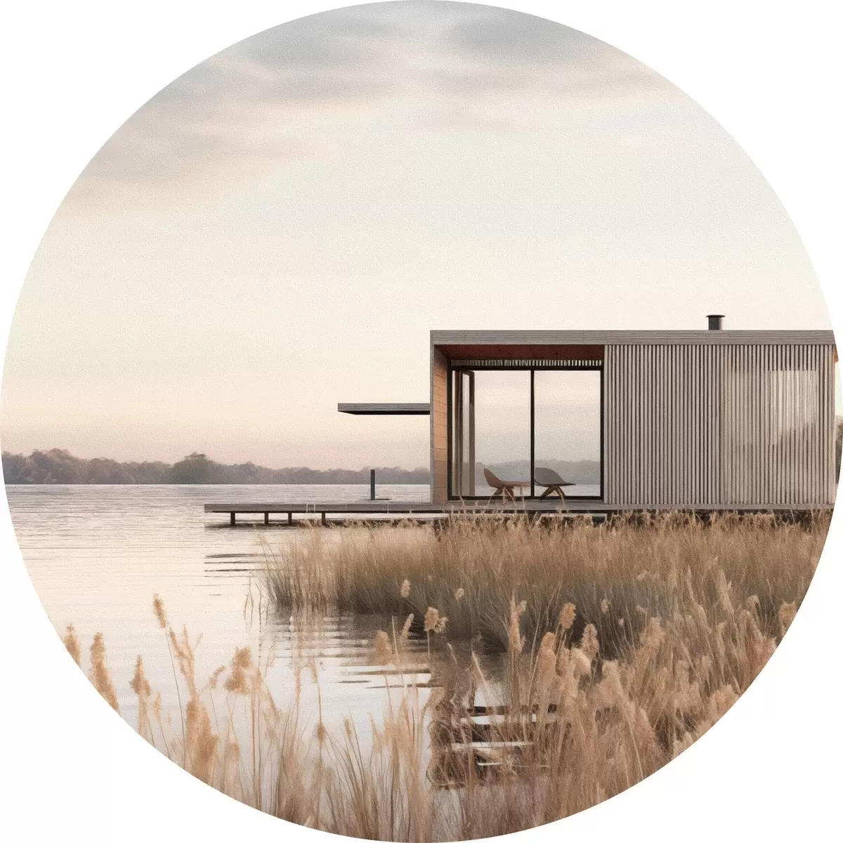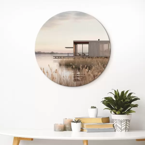 Okrągły obraz Nowoczesna chatka nad jeziorem wśród trzcin o zmierzchu Nr r46513
