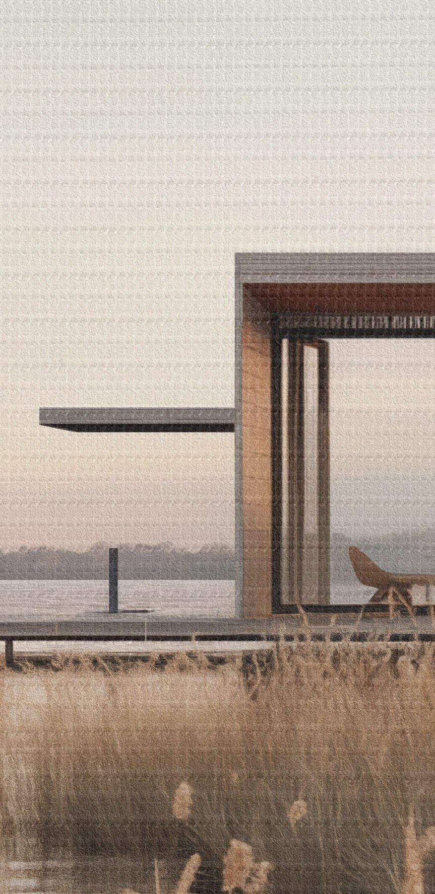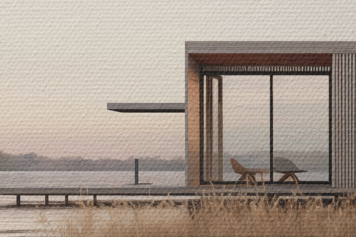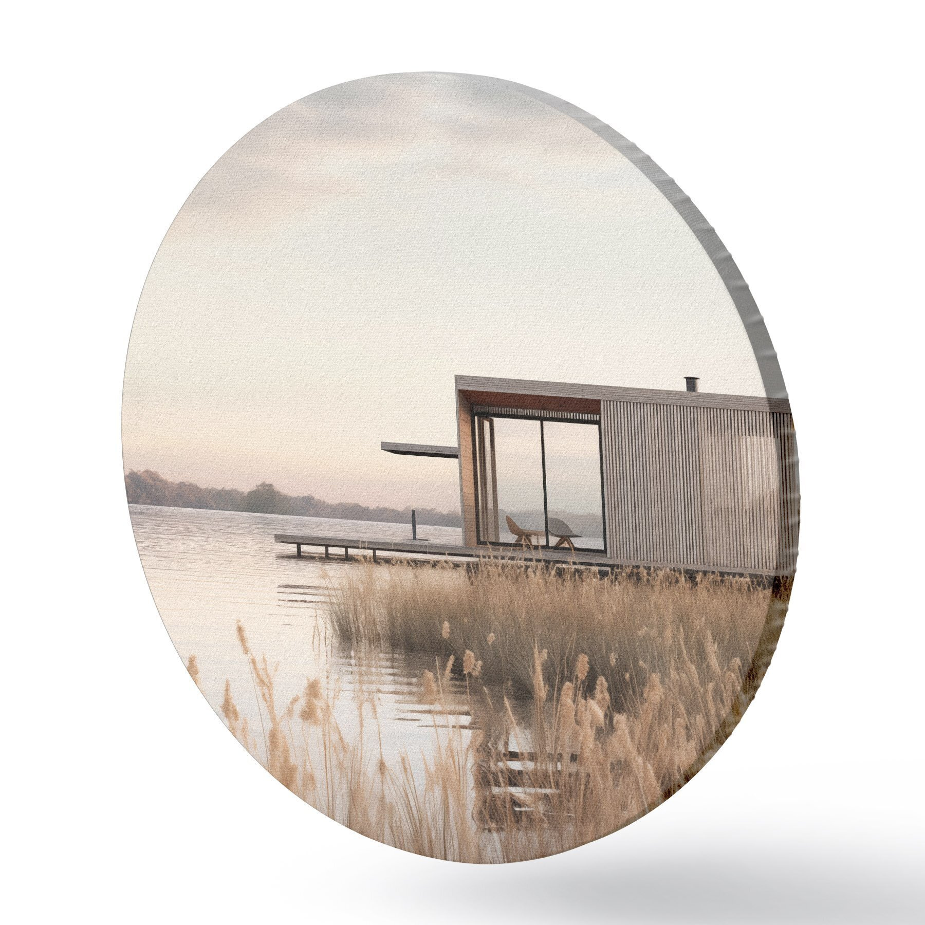 Okrągłe obrazy Nowoczesna chatka nad jeziorem wśród trzcin o zmierzchu r46513