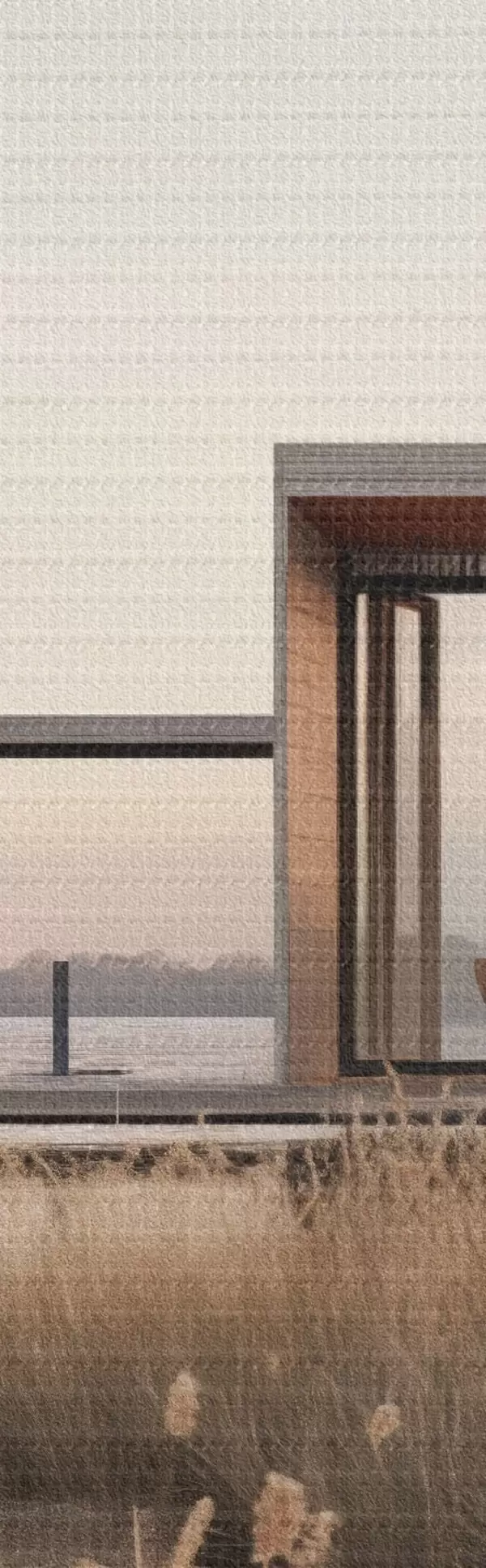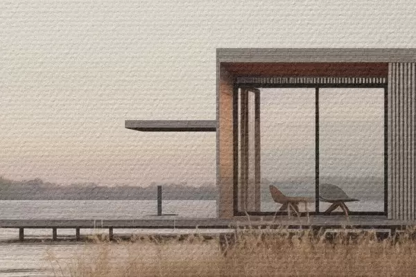 Okrągły obraz Nowoczesna chatka nad jeziorem wśród trzcin o zmierzchu Nr r46513