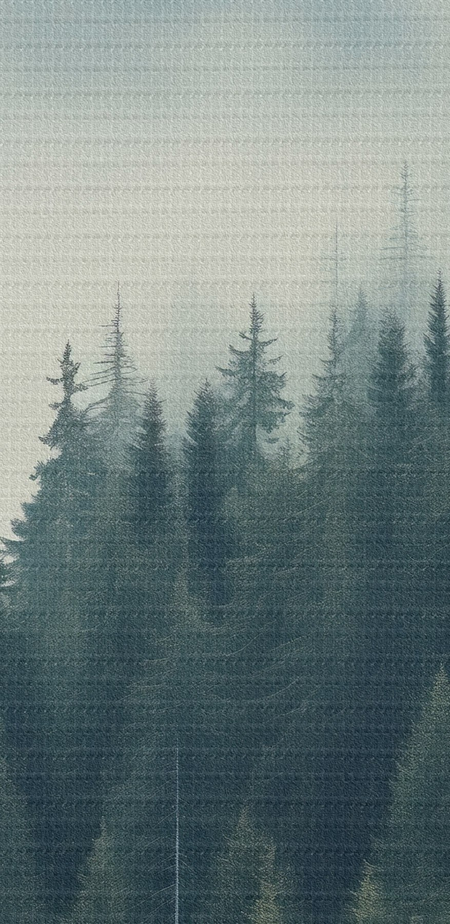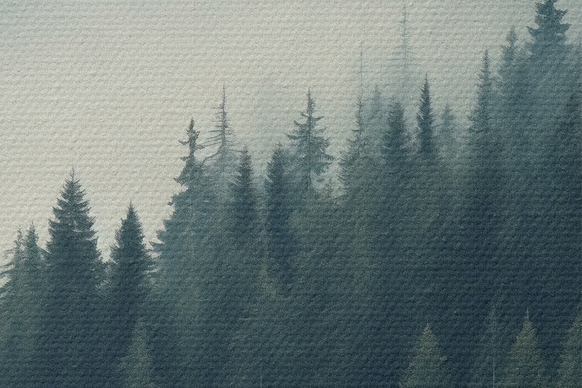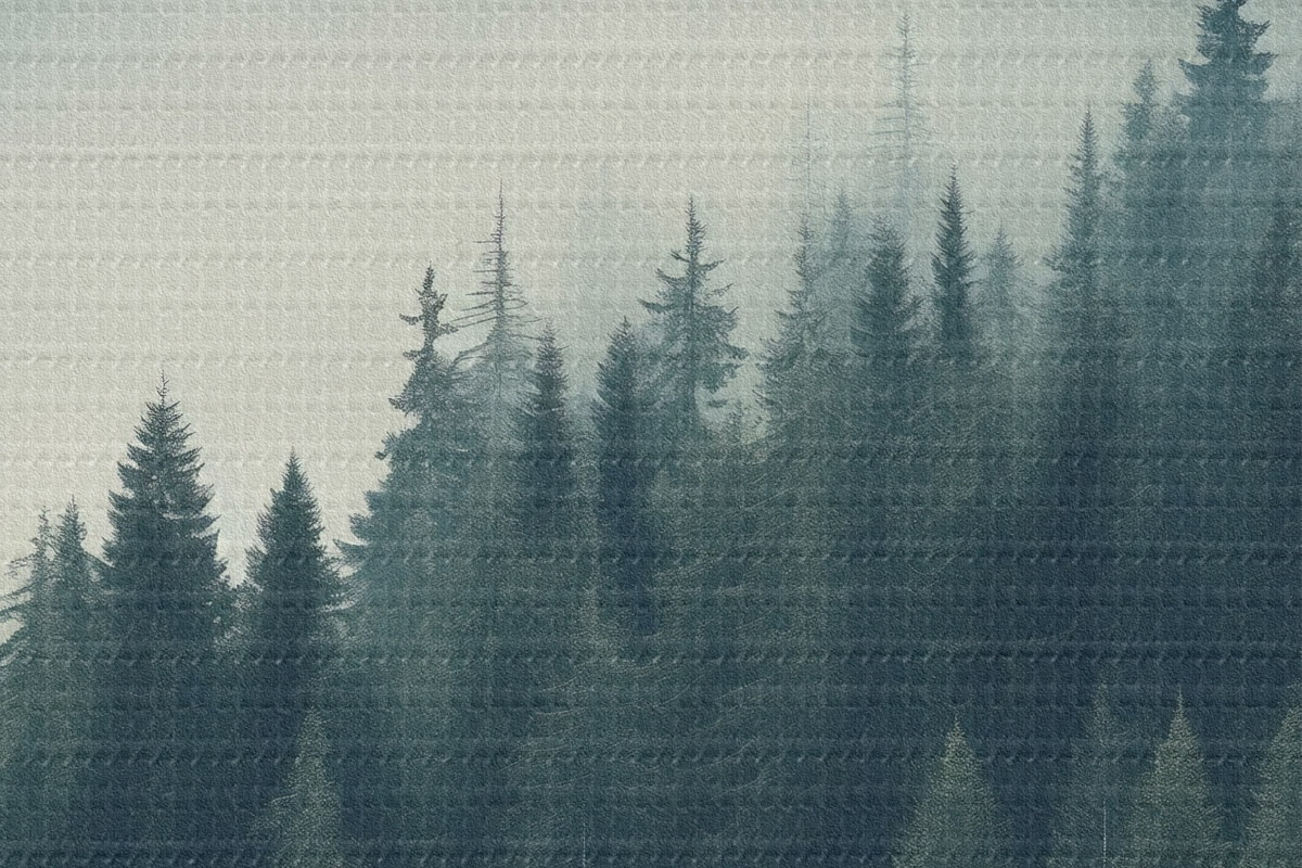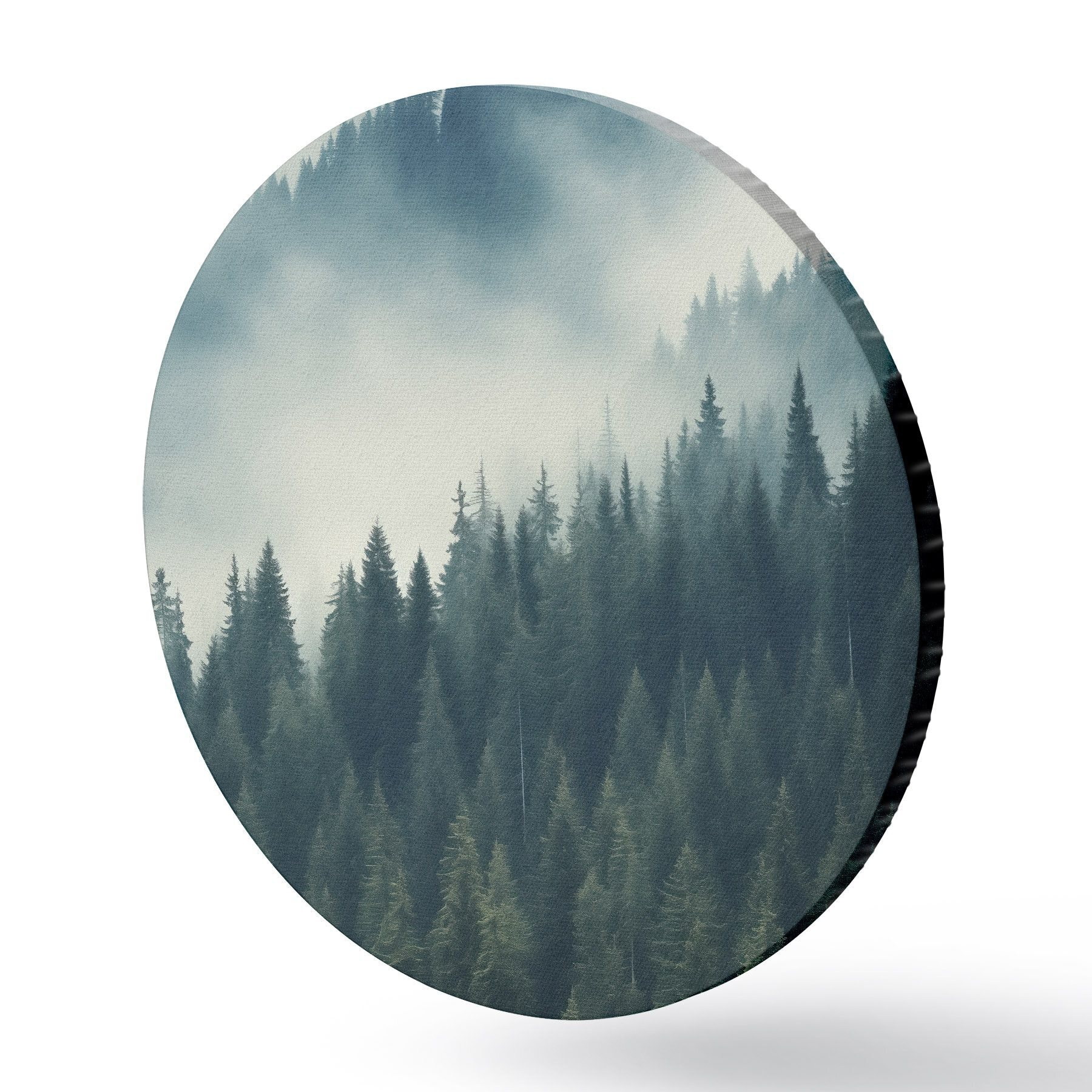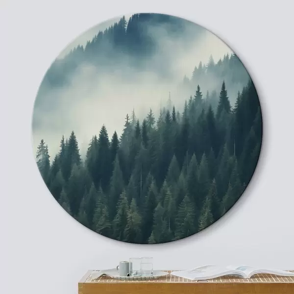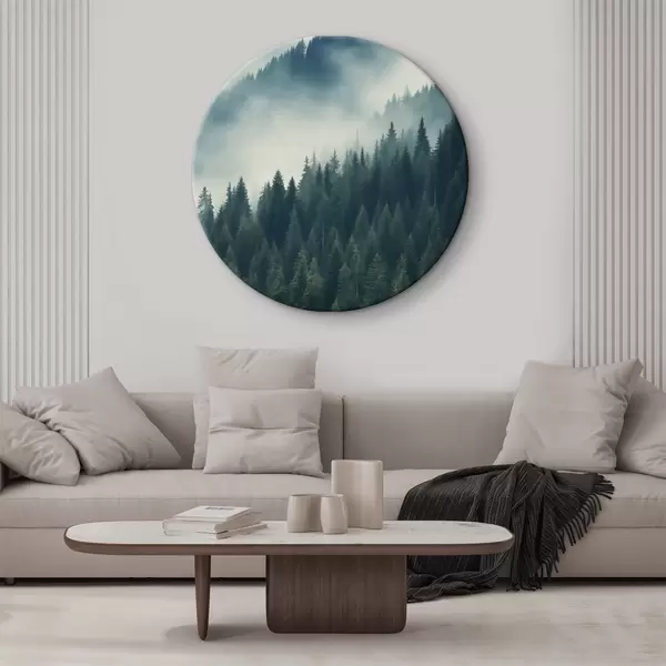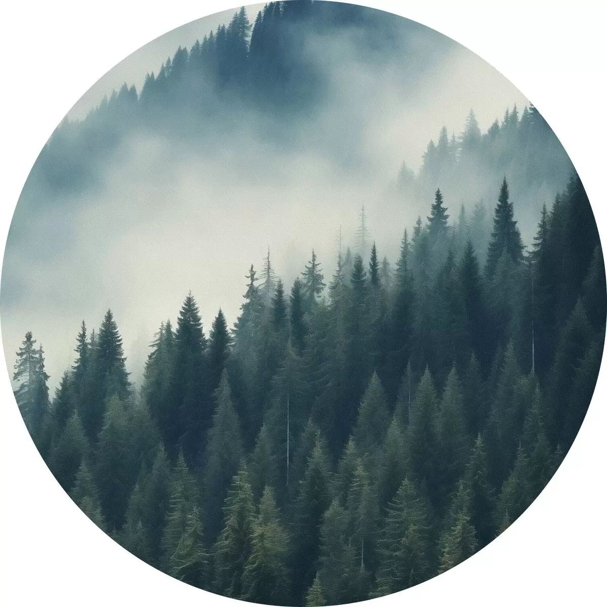 Okrągły obraz Mgła nad zboczami porośniętymi drzewami iglastymi, głębokie odcienie zieleni Nr r46516
