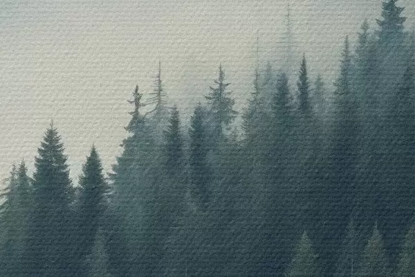 Okrągły obraz Mgła nad zboczami porośniętymi drzewami iglastymi, głębokie odcienie zieleni Nr r46516