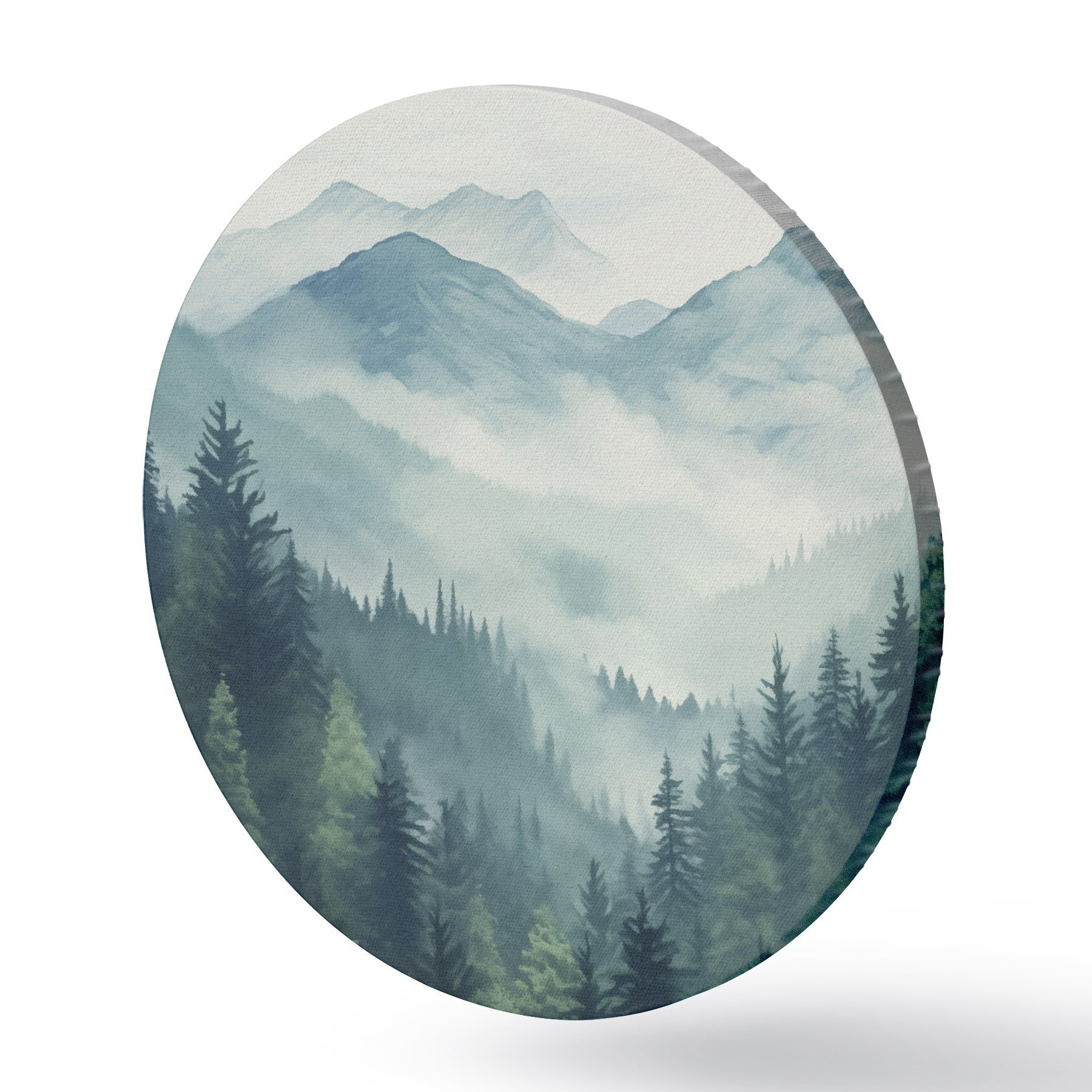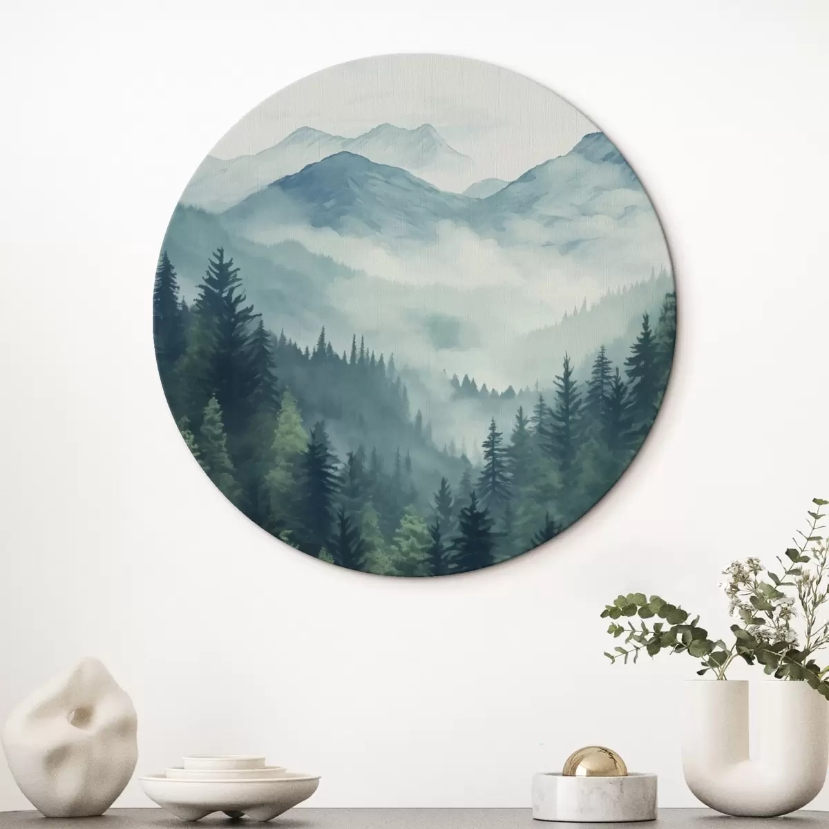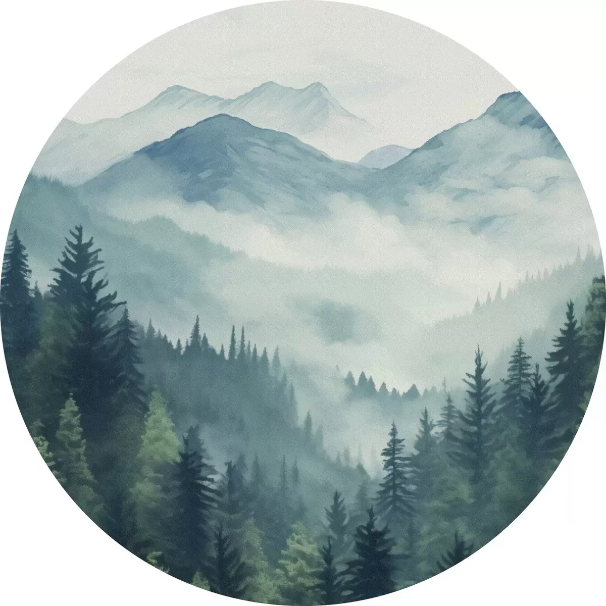 Okrągły obraz Góry i lasy w delikatnej porannej mgle, namalowane akwarelą Nr r46519