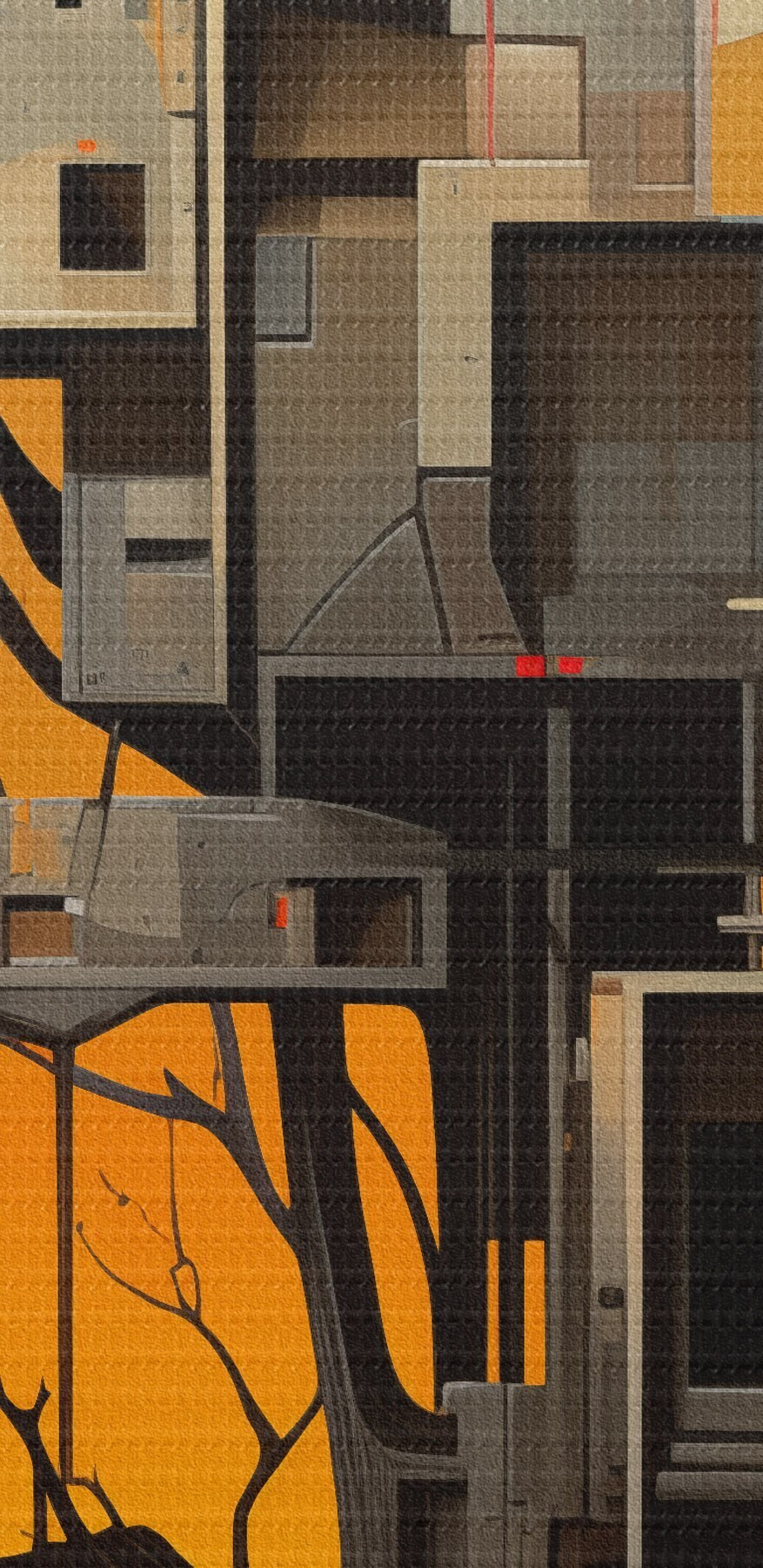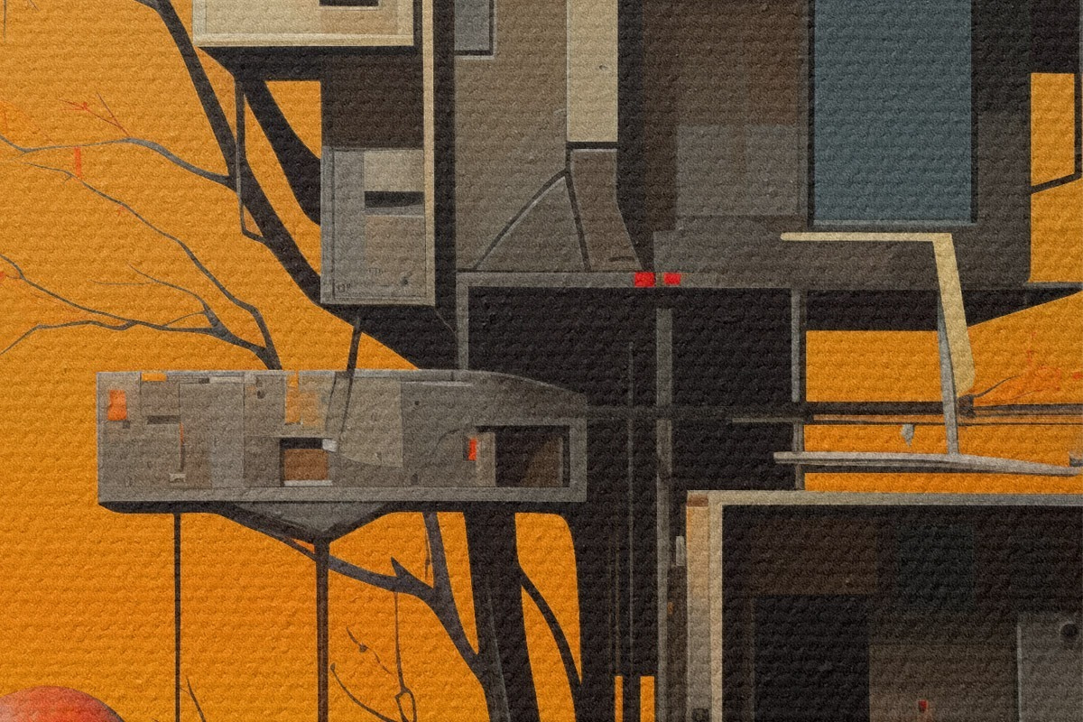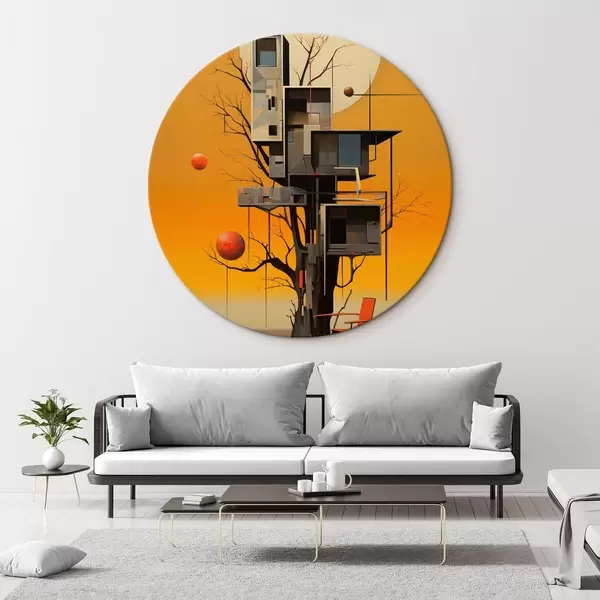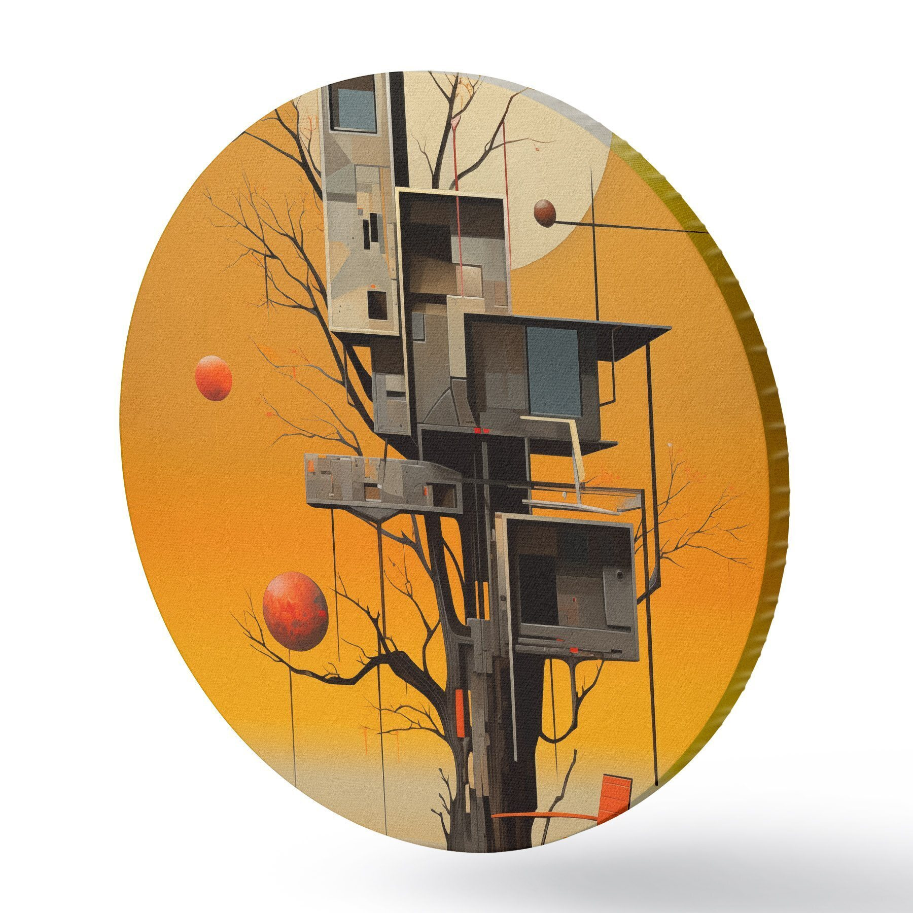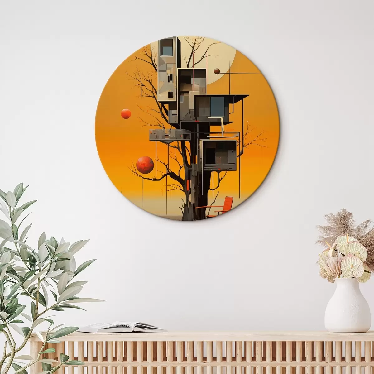 Okrągły obraz Surrealistyczny domek na drzewie na pomarańczowym tle Nr r46526