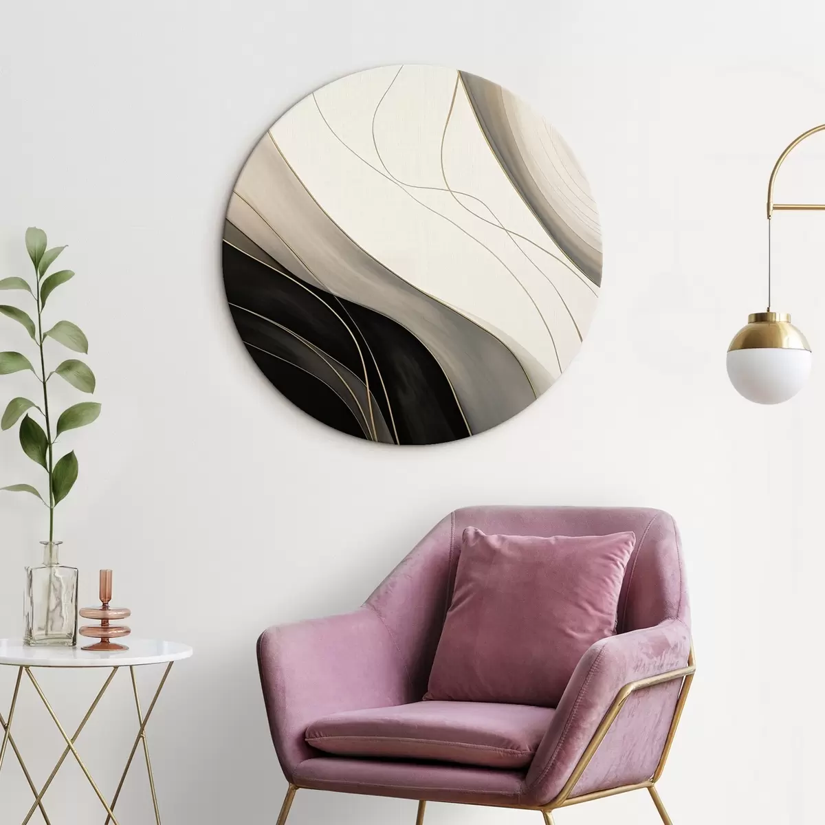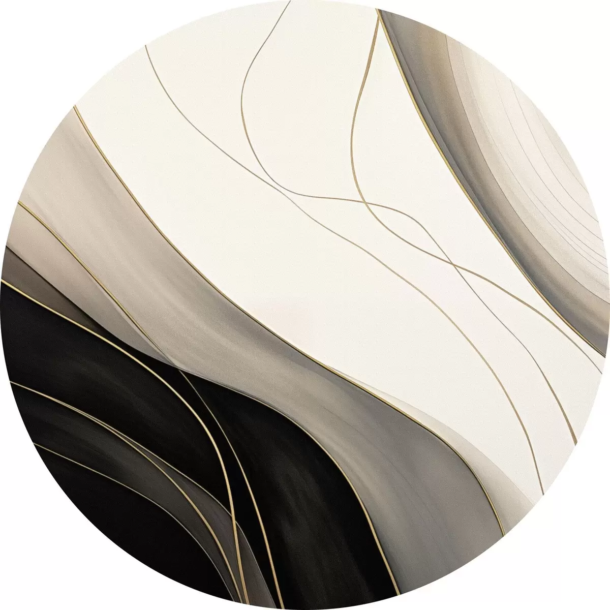 Okrągły obraz Fale w kolorze czarnym i beżowym z delikatnymi ochrowymi liniami Nr r46541