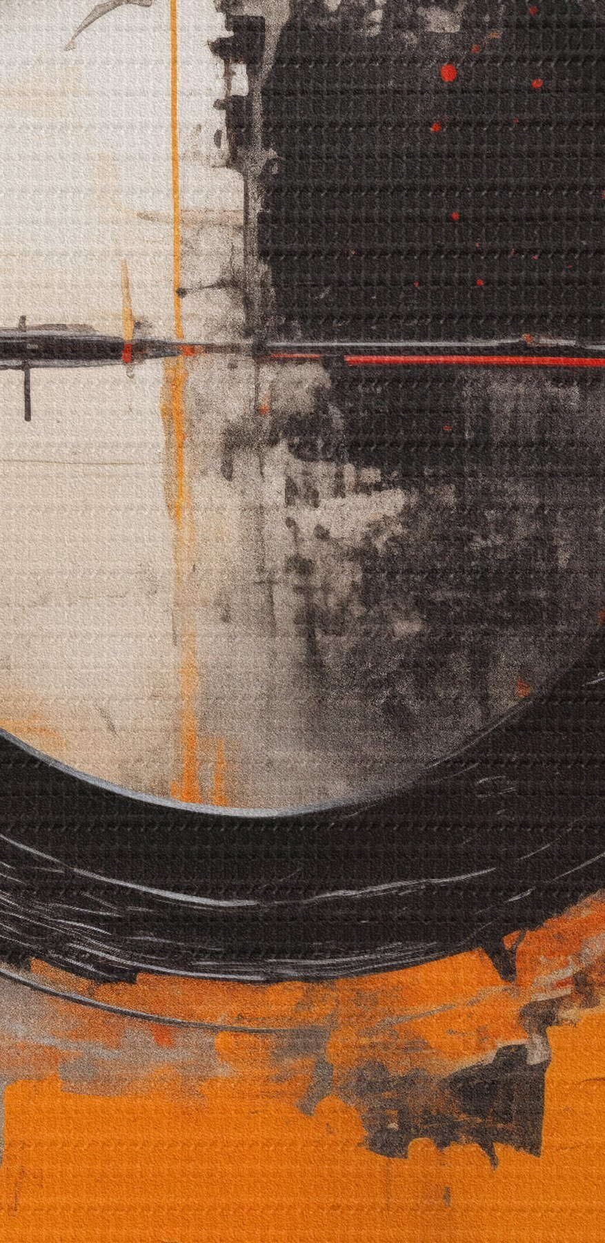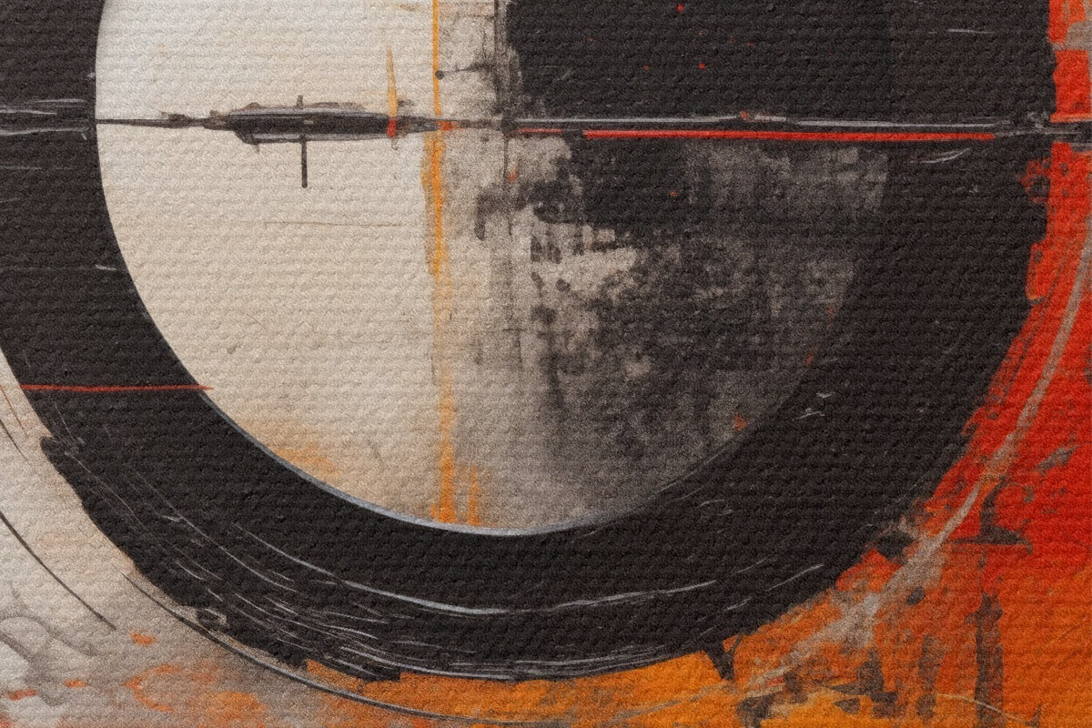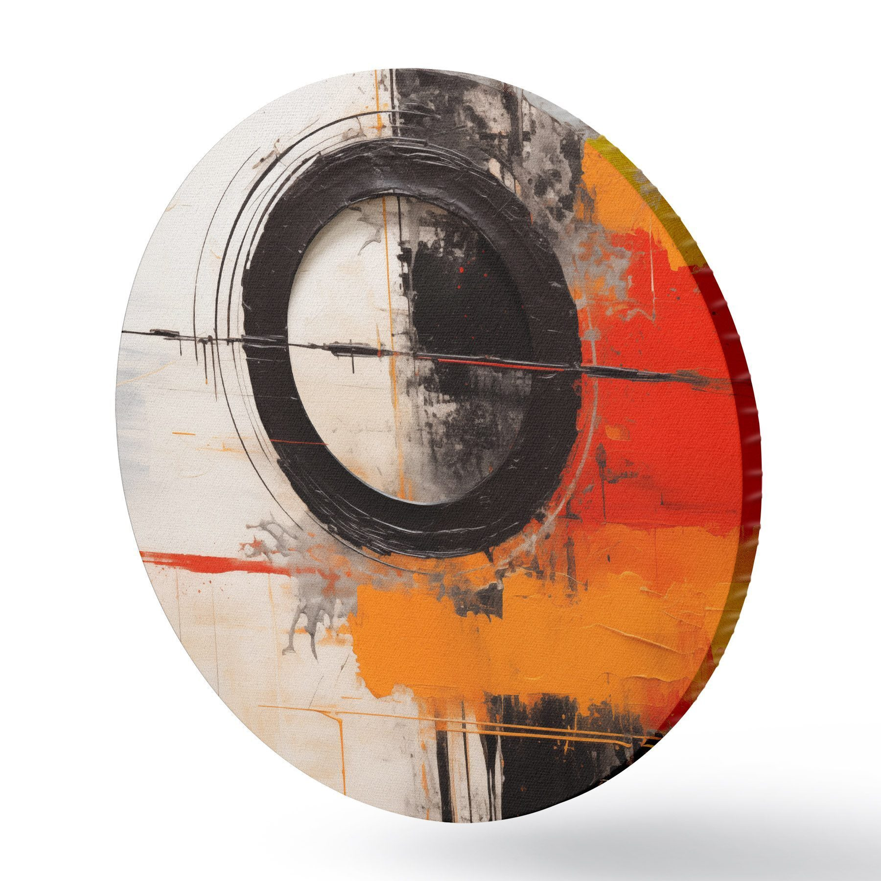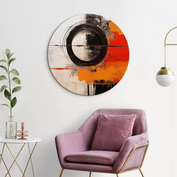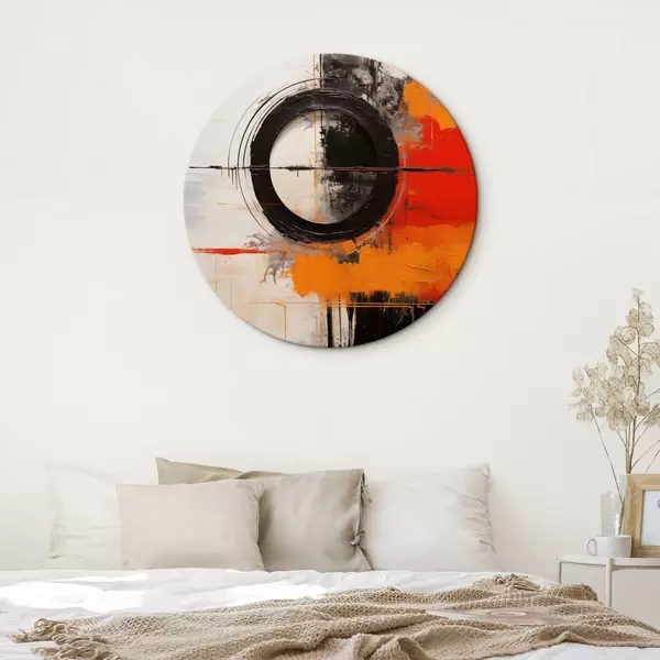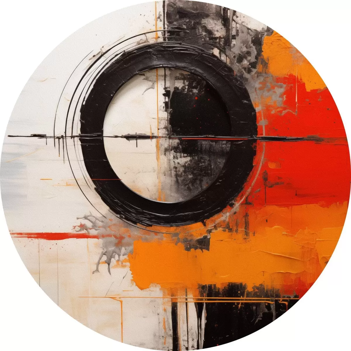 Okrągłe obrazy Czarne koło na białym tle, pomarańczowe pociągnięcia i plamy r46549